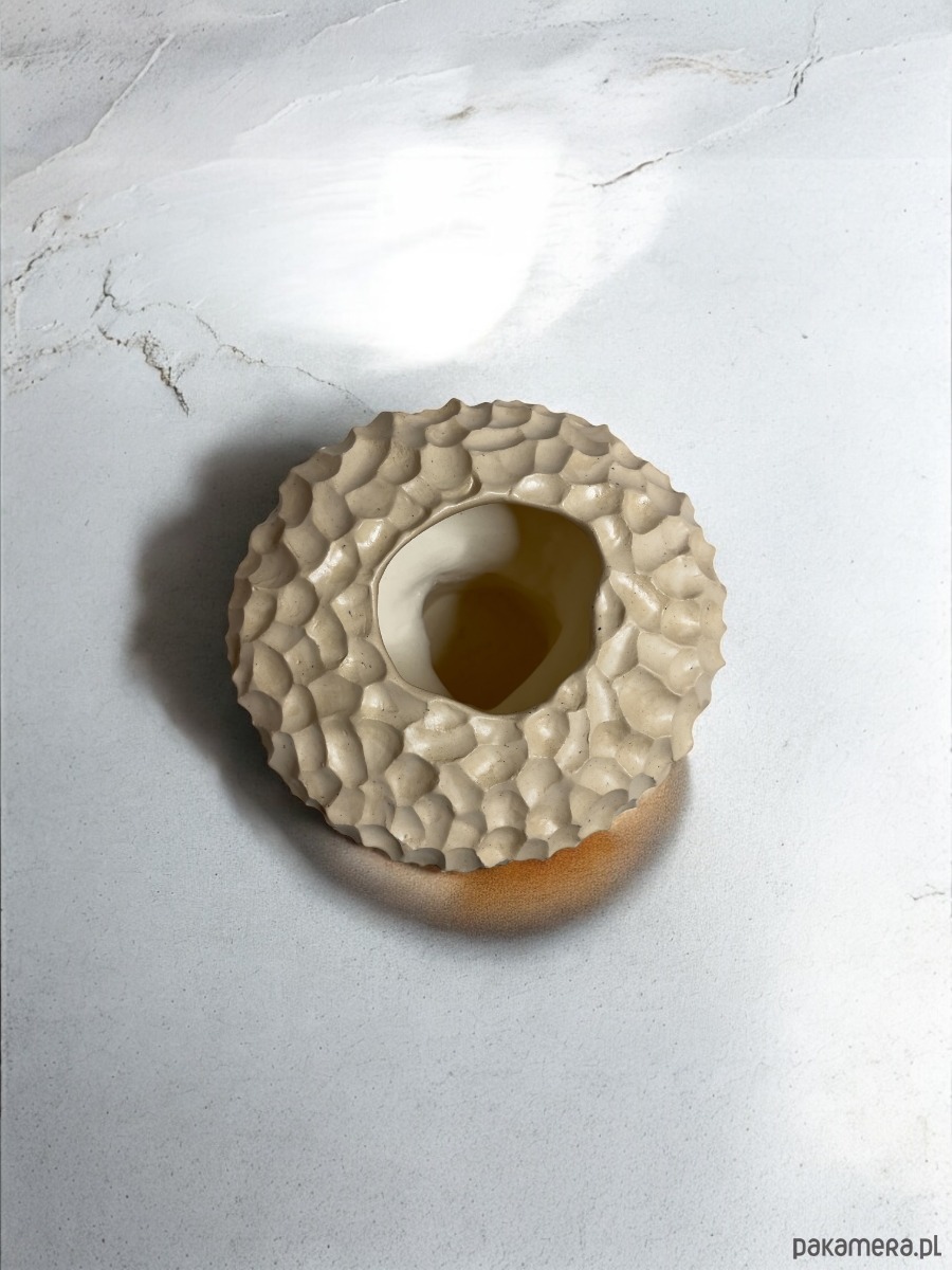 Ręcznie formowany z gliny w kolorze jasnego beżu. Pokryty przeźroczystym szkliwem na zewnątrz. Wewnątrz szkliwo w kolorze białym matowym.