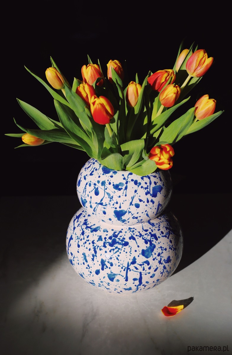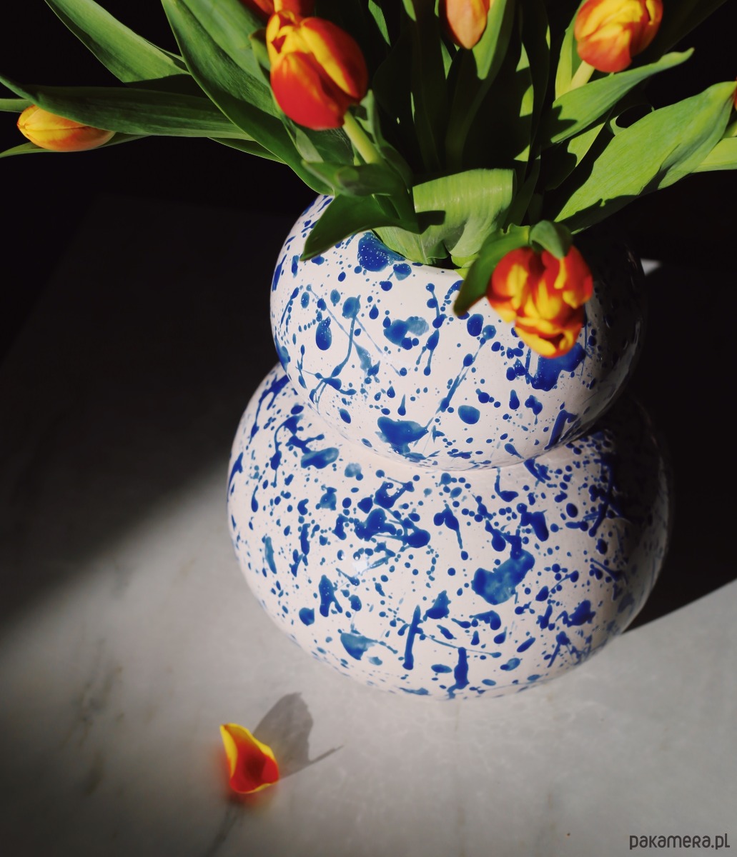 Ceramiczny wazon w granatowe ciapki.Efektowny dodatek do wnętrza. W naszej ofercie dostępny jest również mniejszy wazon widoczny na drugim zdjęciu.