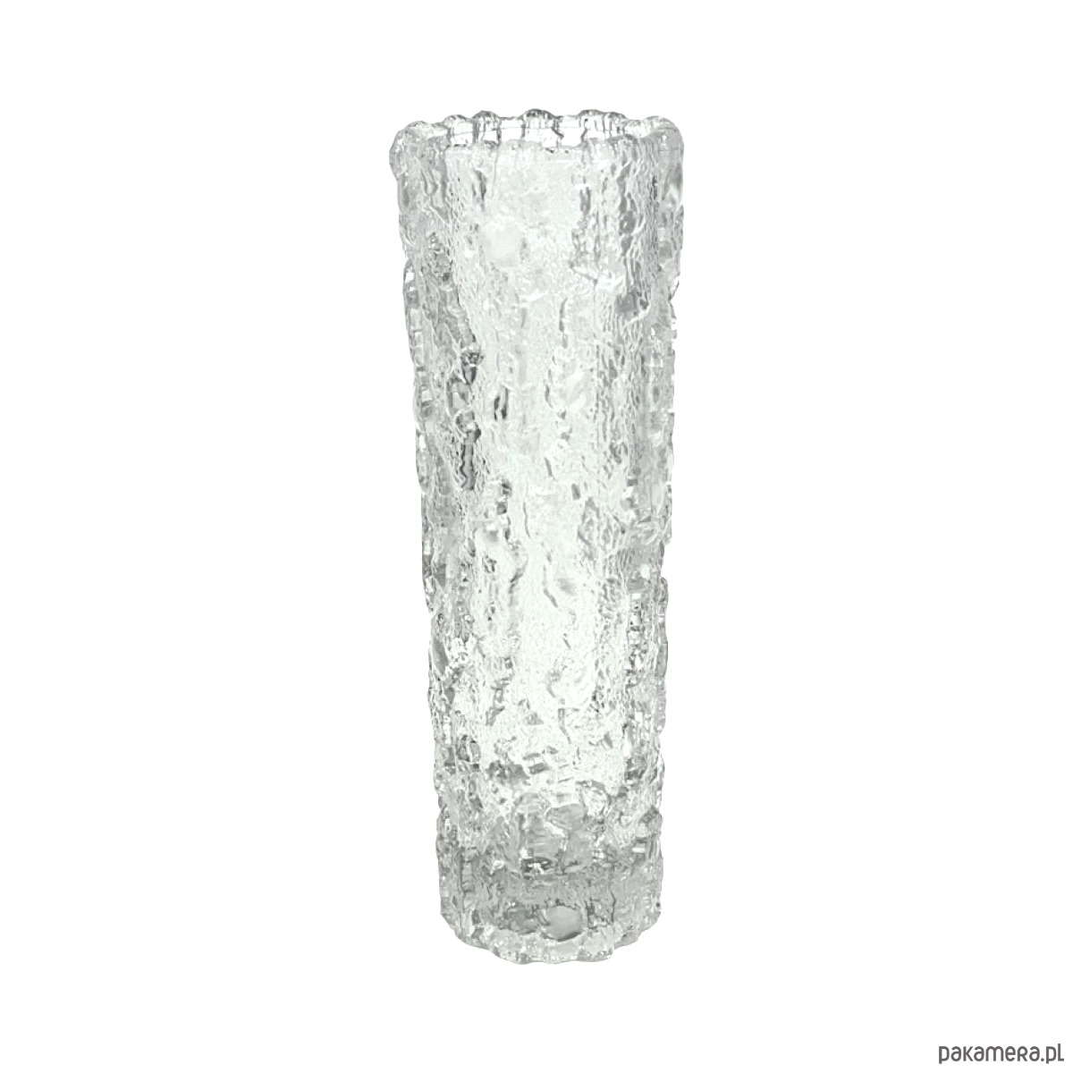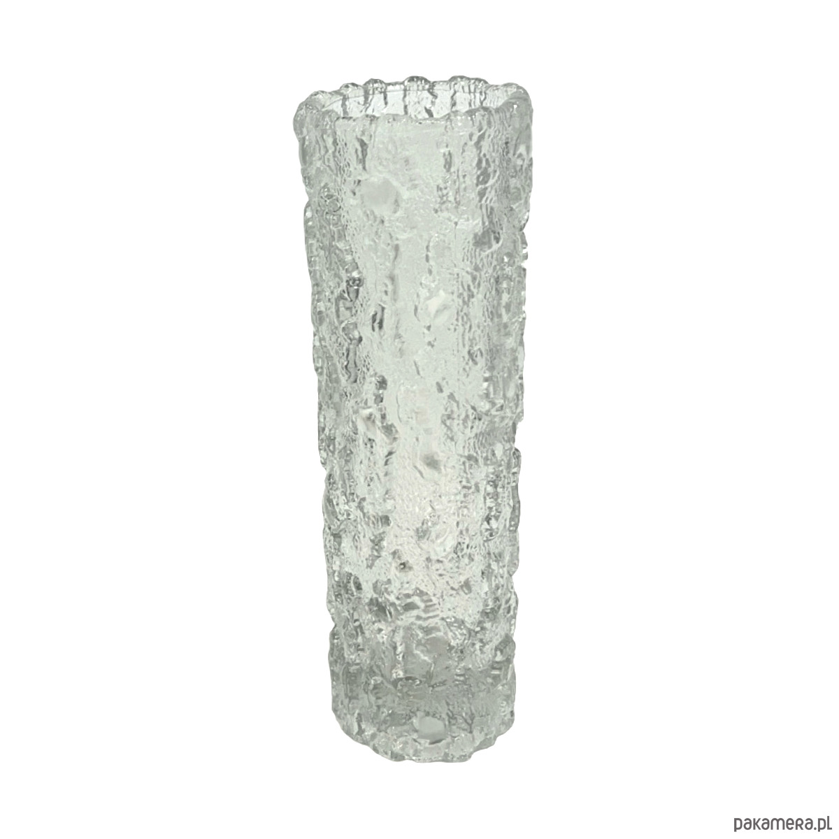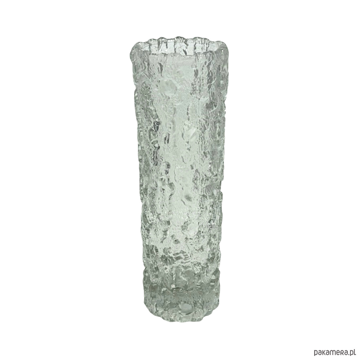 Wazon charakteryzuje się masywną, cylindryczną formą wykonaną z grubościennego, bezbarwnego szkła prasowanego. Jego unikalna struktura typu „Ice-Bark Glass” (szkło przypominające korę drzewa lub bryłę lodu) tworzy nieregularną, fakturowaną powierzchnię, która w efektowny sposób rozprasza i załamuje światło. Ze względu na surową, rzeźbiarską formę, przedmiot stanowi wyrazisty element dekoracyjny zarówno w nowoczesnych, jak i klasycznych wnętrzach.
