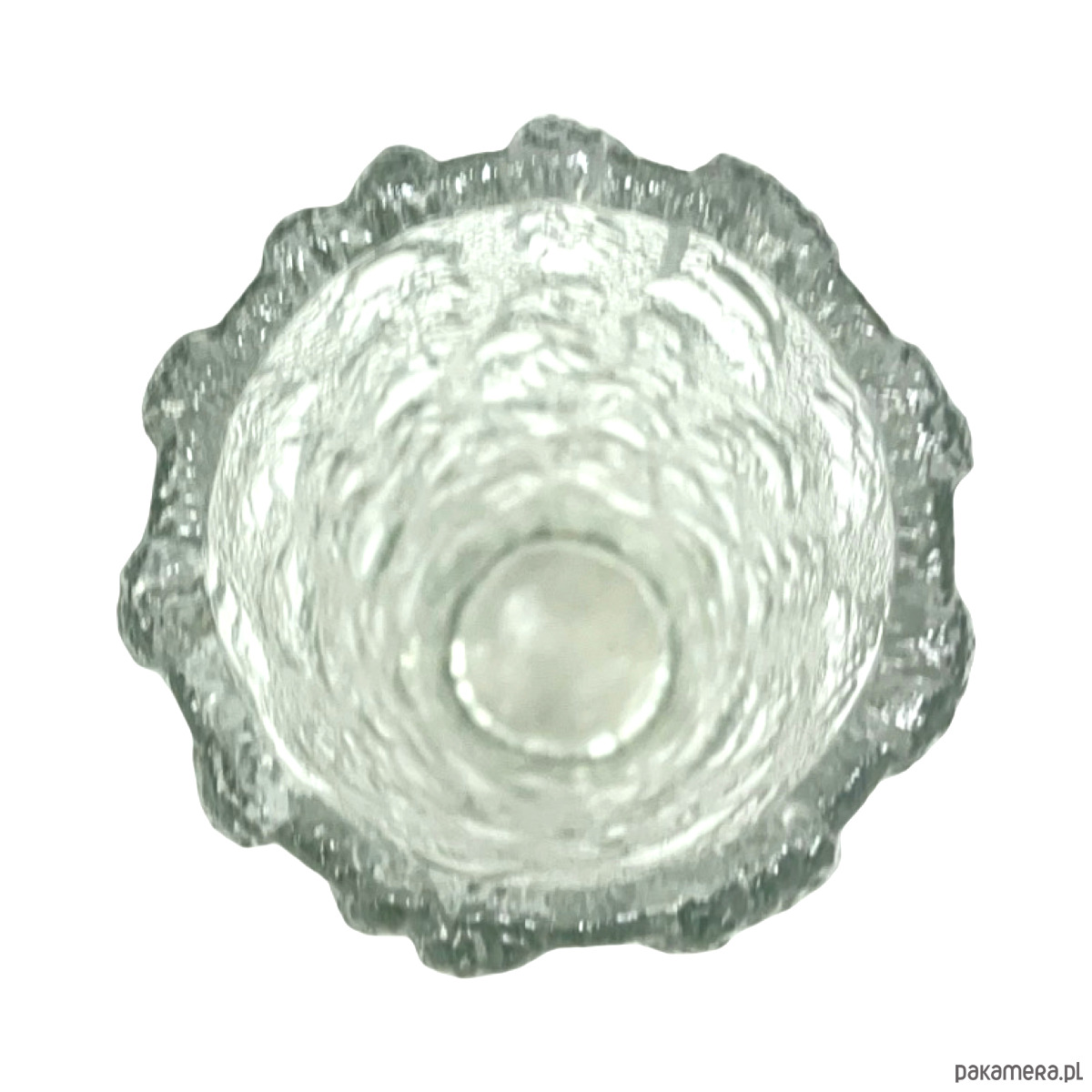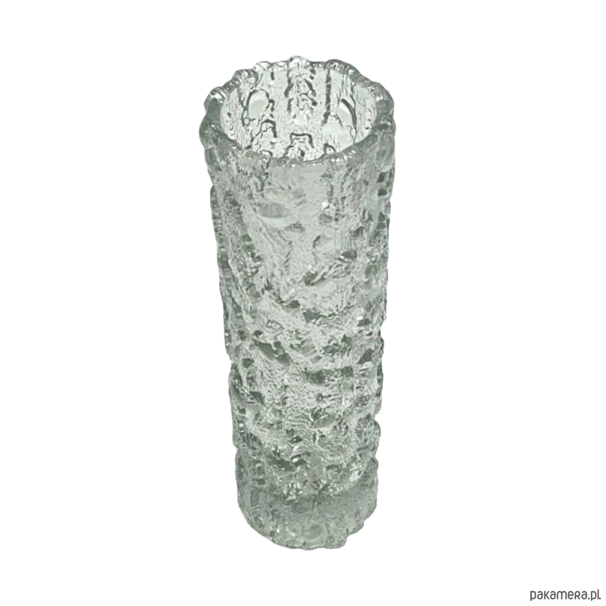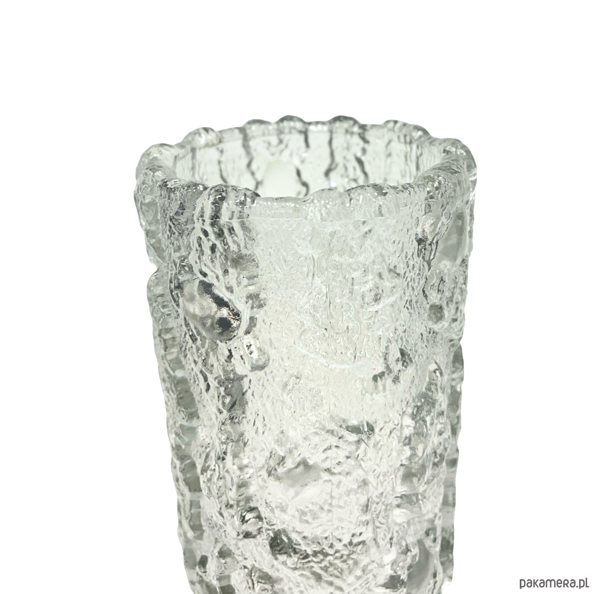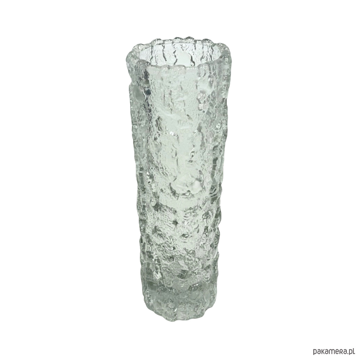 Wazon charakteryzuje się masywną, cylindryczną formą wykonaną z grubościennego, bezbarwnego szkła prasowanego. Jego unikalna struktura typu „Ice-Bark Glass” (szkło przypominające korę drzewa lub bryłę lodu) tworzy nieregularną, fakturowaną powierzchnię, która w efektowny sposób rozprasza i załamuje światło. Ze względu na surową, rzeźbiarską formę, przedmiot stanowi wyrazisty element dekoracyjny zarówno w nowoczesnych, jak i klasycznych wnętrzach.