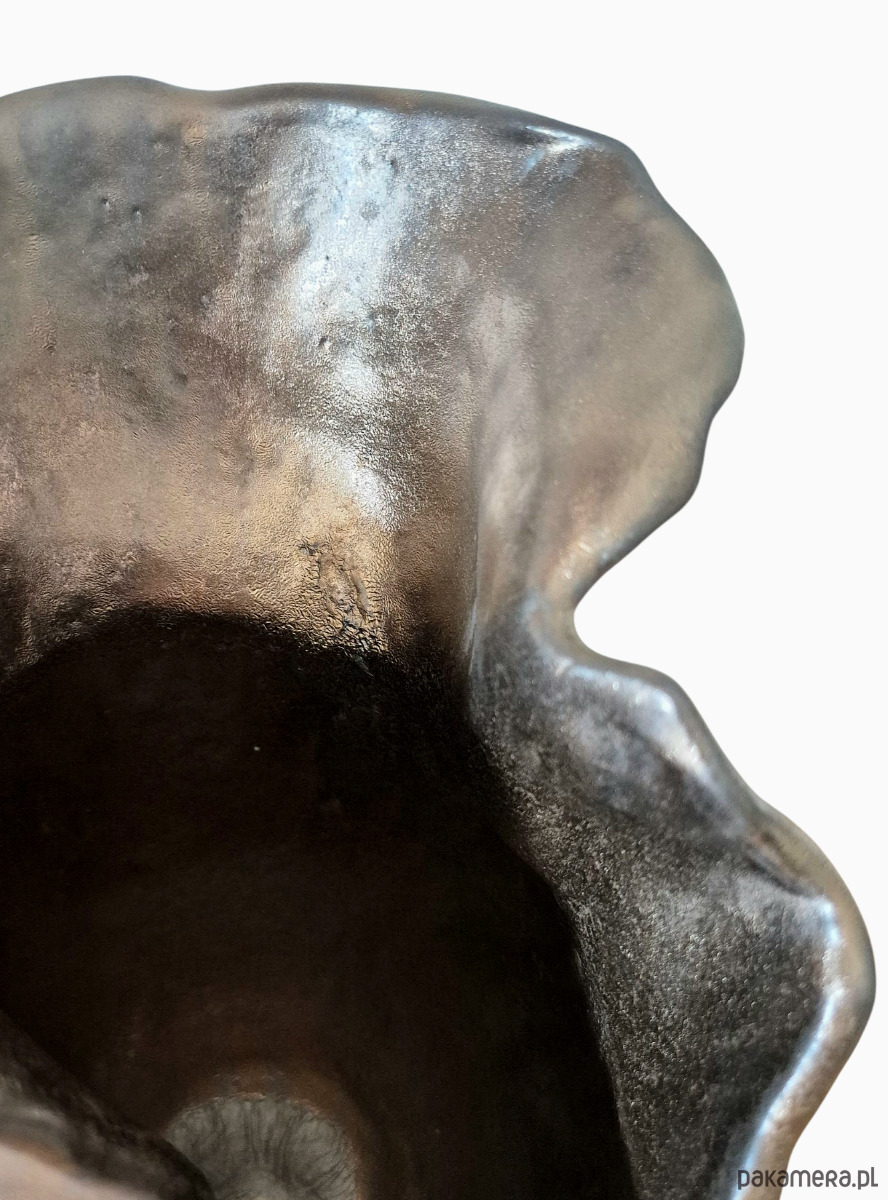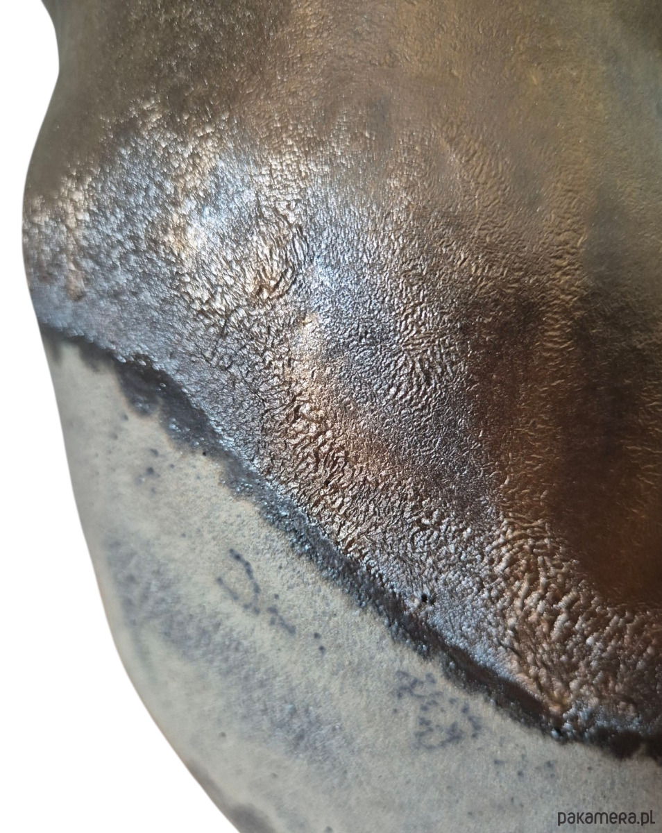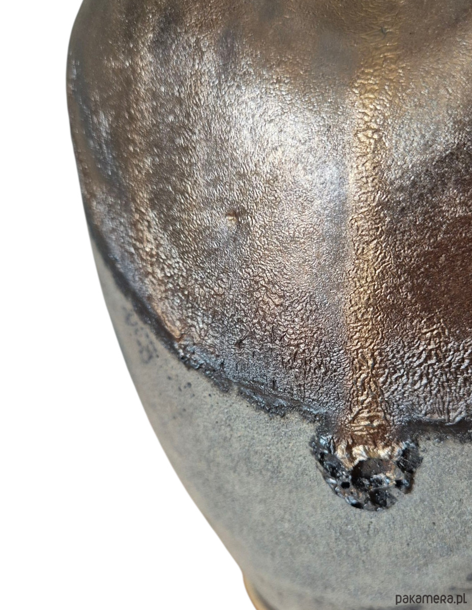 Dolna część wazonu pokryta ciemnym, porowatym szkliwem z efektem magmy