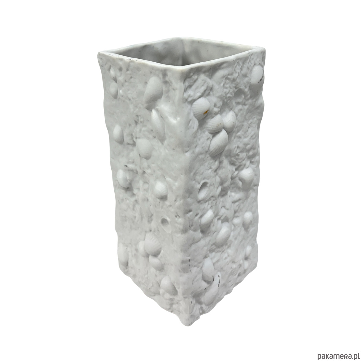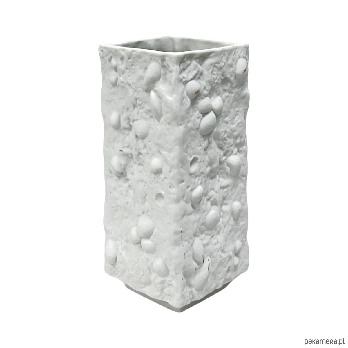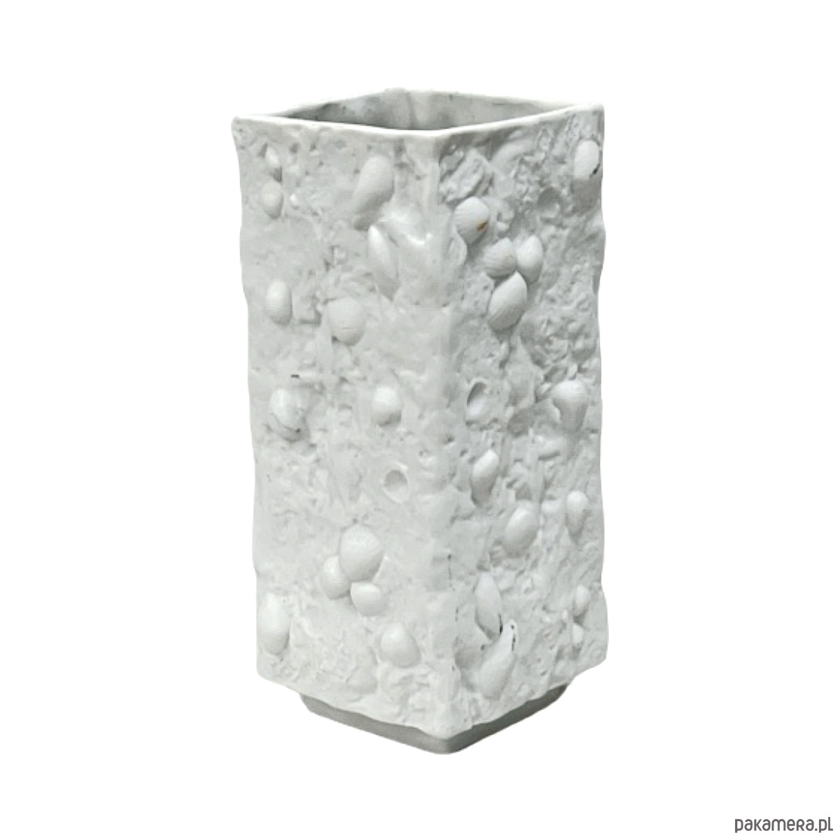 Wazon wyróżnia się unikalną, organiczną strukturą typu relief. Powierzchnia ścianek ozdobiona jest wypukłymi motywami inspirowanymi naturą – skamielinami, muszlami morskimi oraz amonitami. Surowa, matowa faktura biskwitu w połączeniu z geometryczną formą prostopadłościanu to kwintesencja stylu Op-art oraz modernistycznego wzornictwa z ery Space Age.