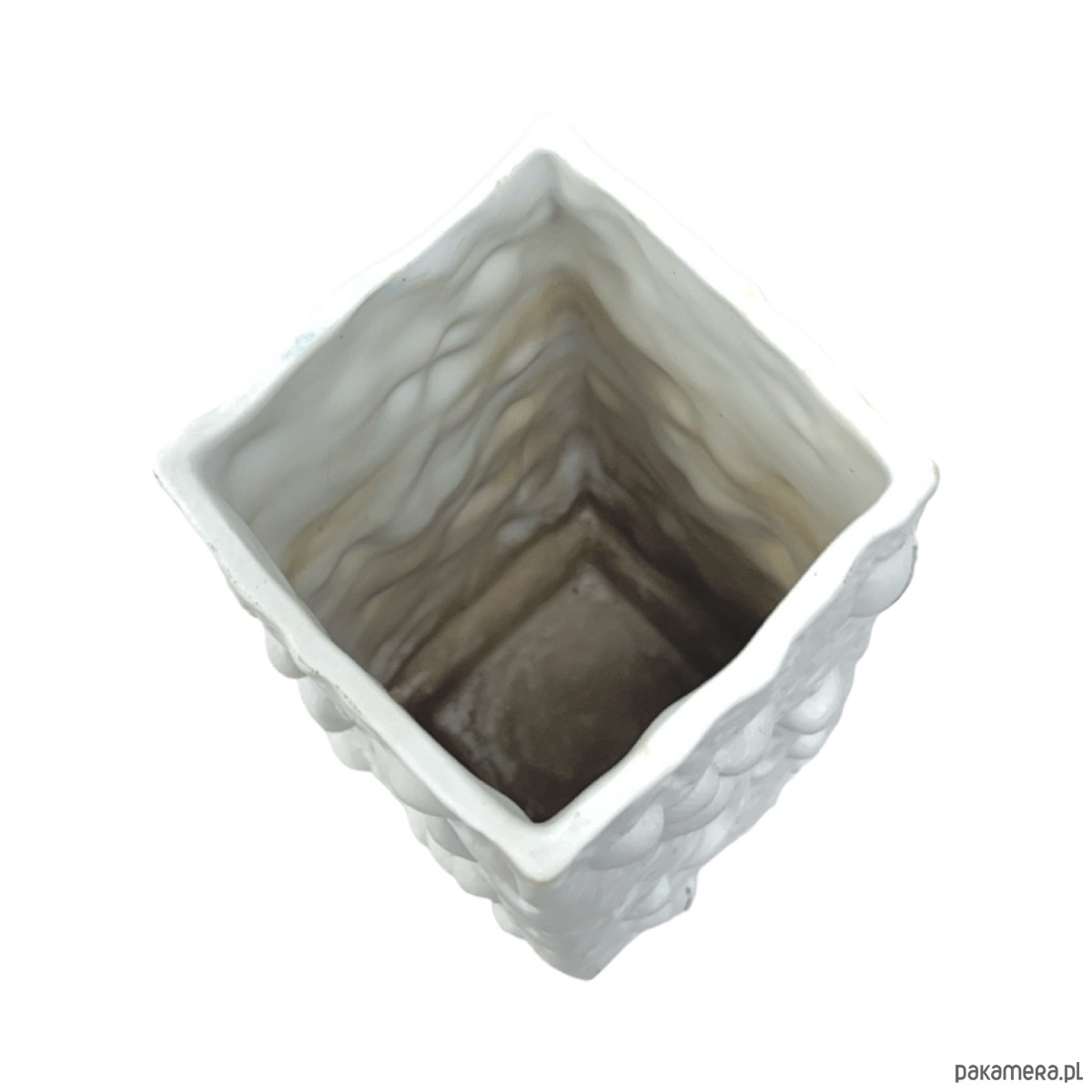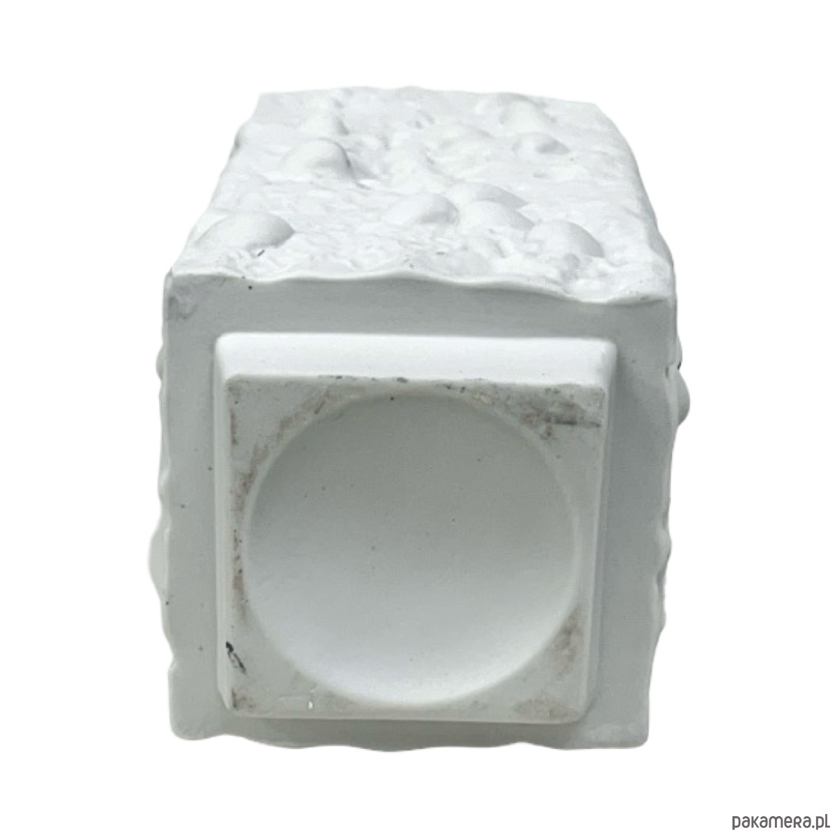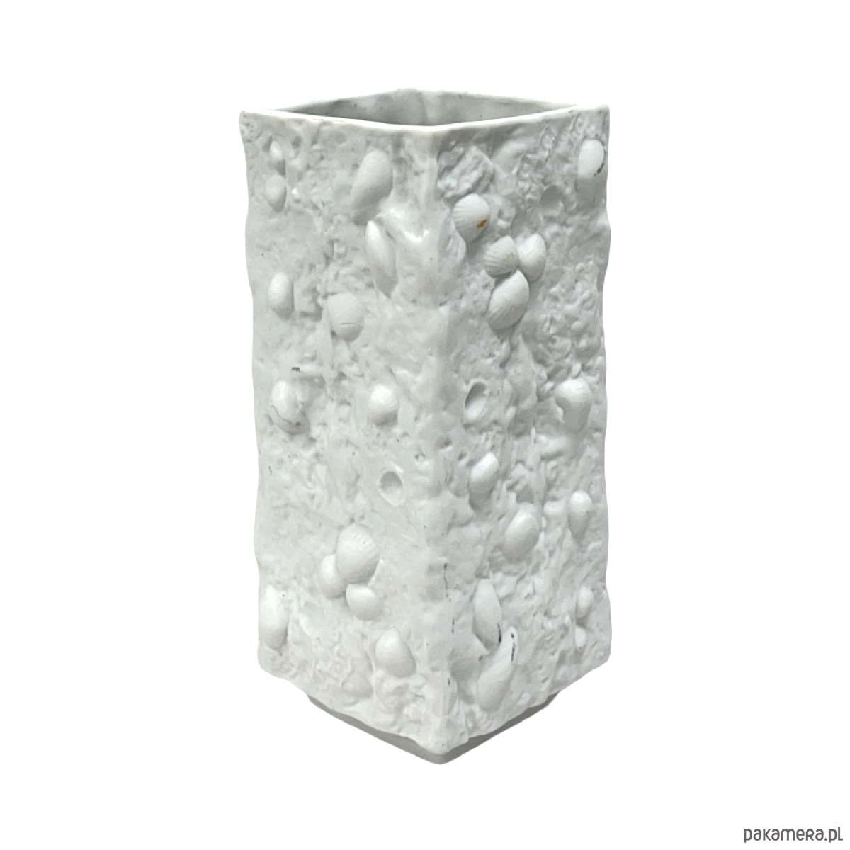 Wazon wyróżnia się unikalną, organiczną strukturą typu relief. Powierzchnia ścianek ozdobiona jest wypukłymi motywami inspirowanymi naturą – skamielinami, muszlami morskimi oraz amonitami. Surowa, matowa faktura biskwitu w połączeniu z geometryczną formą prostopadłościanu to kwintesencja stylu Op-art oraz modernistycznego wzornictwa z ery Space Age.
