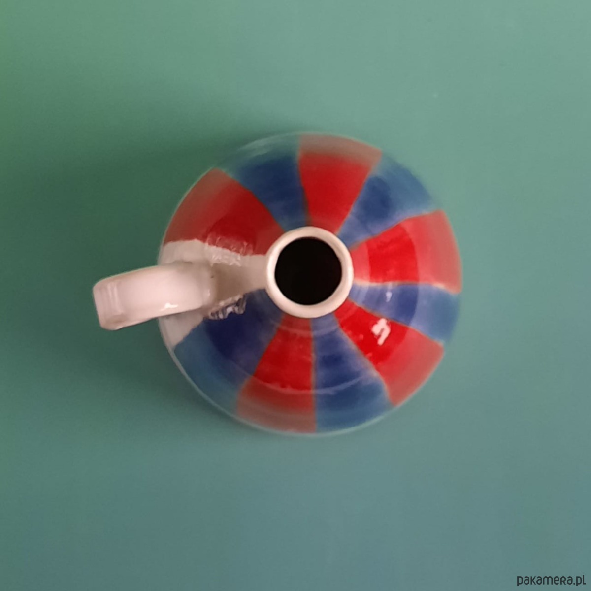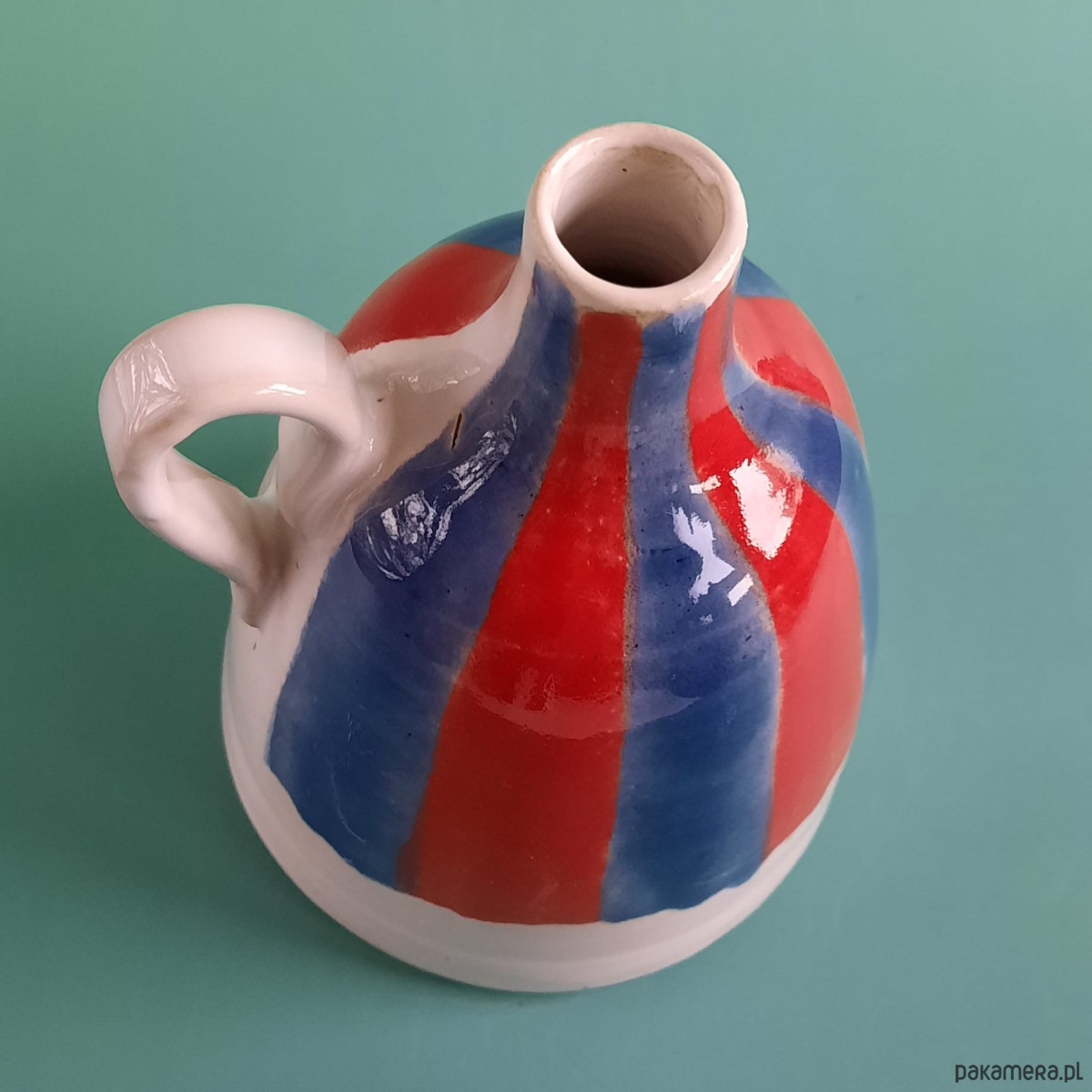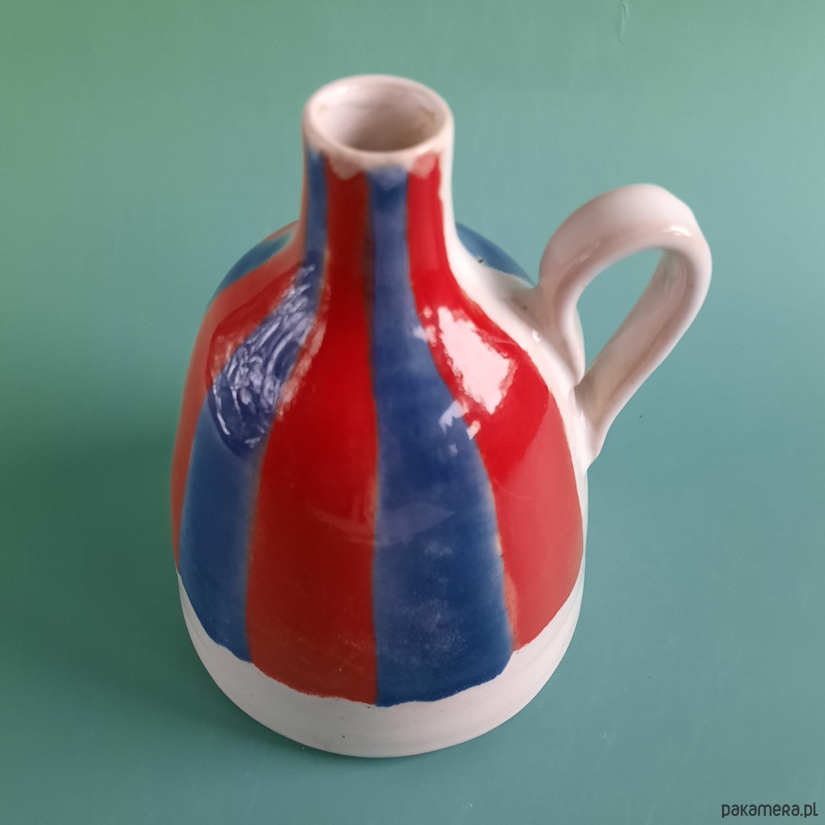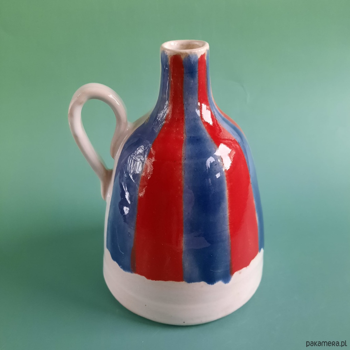 Ręcznie robiona ceramika do codziennego użytku — ceramiczny wazon butelka biało niebiesko czerwona pasy morski marynistyczny vibe ręcznie malowana