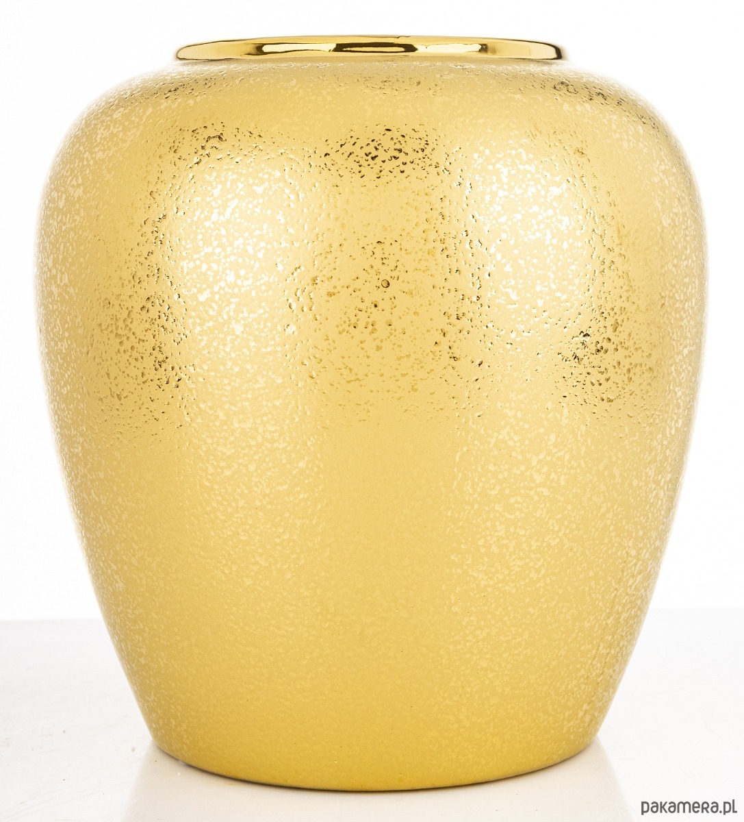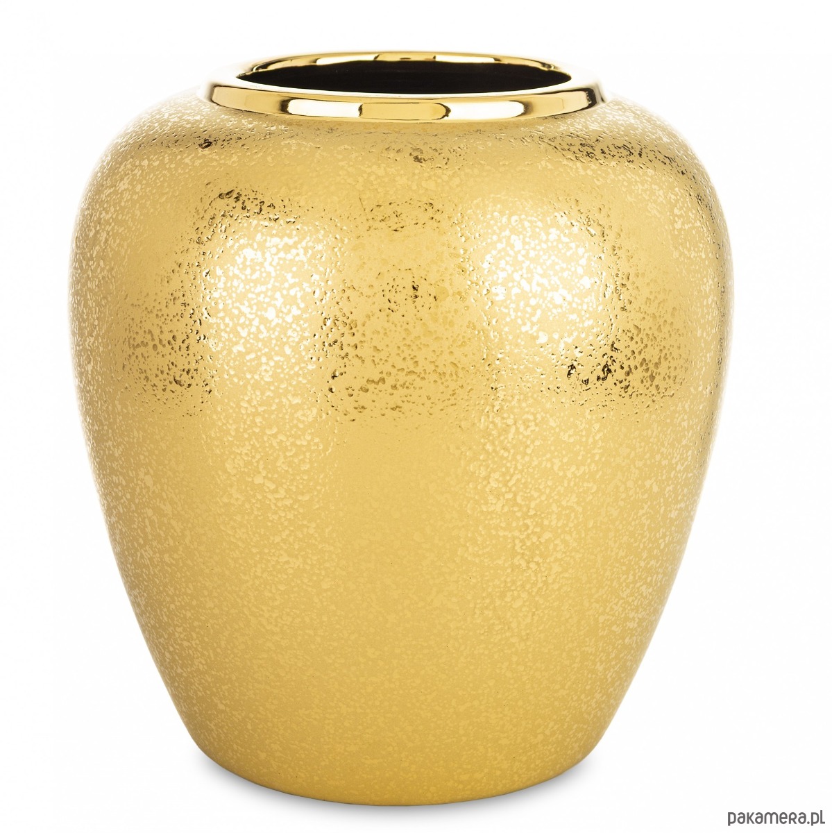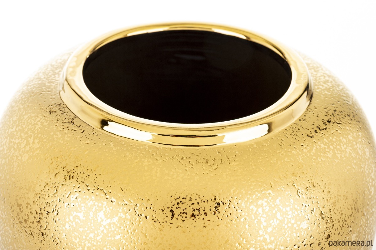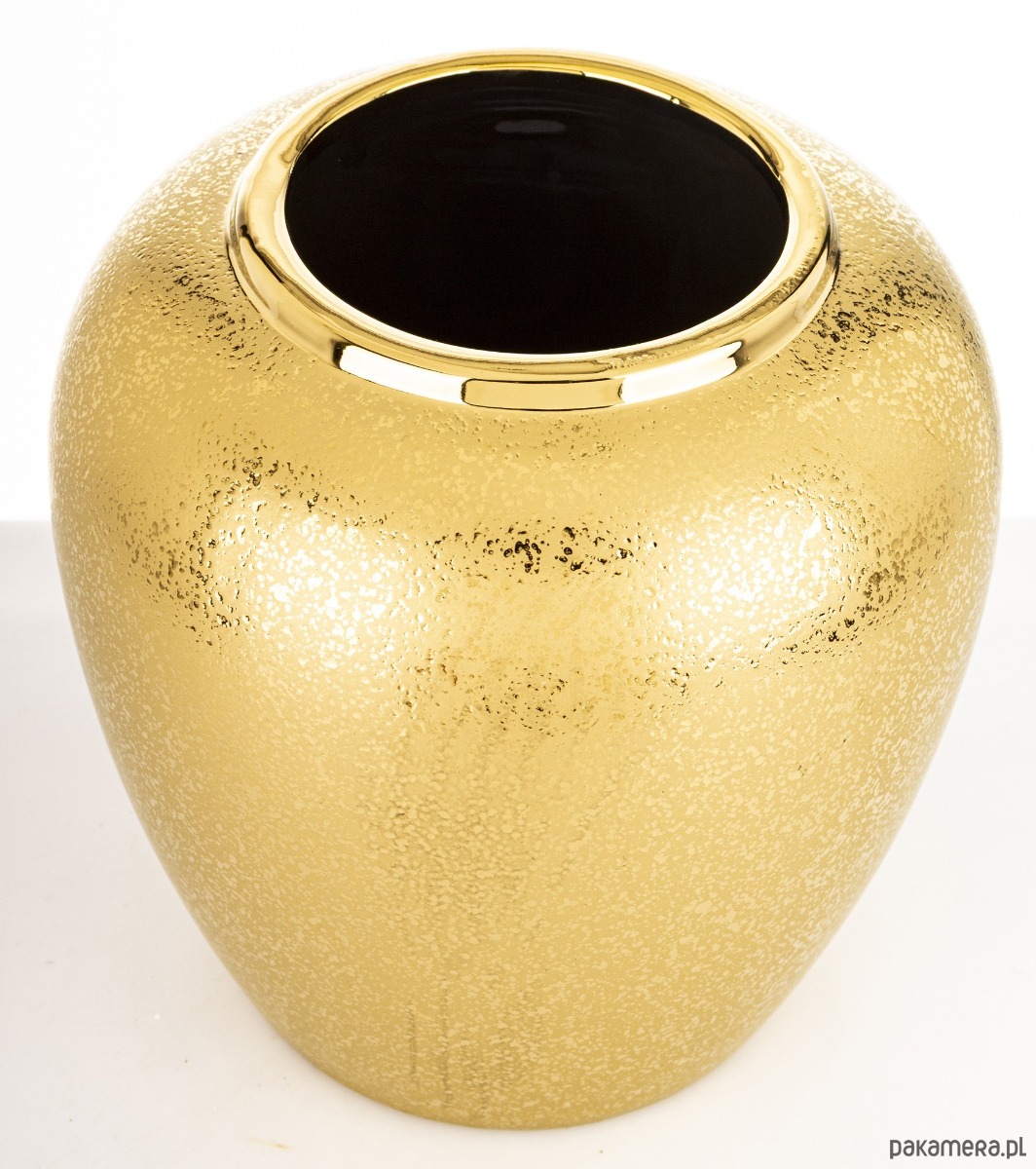 Wykonany z wysokiej jakości ceramiki wazon ma błyszczący złoty brzeg, który przyciąga wzrok i dodaje elegancji. Celowo postarzany. Złoty, matowy kolor wazonu doskonale komponują się z różnorodnymi stylami aranżacji wnętrz. To idealny sposób na ożywienie przestrzeni i dodanie jej naturalnego akcentu. Wazon stanie się stylowym dodatkiem i ciekawym elementem dekoracyjnym w pomieszczeniu.