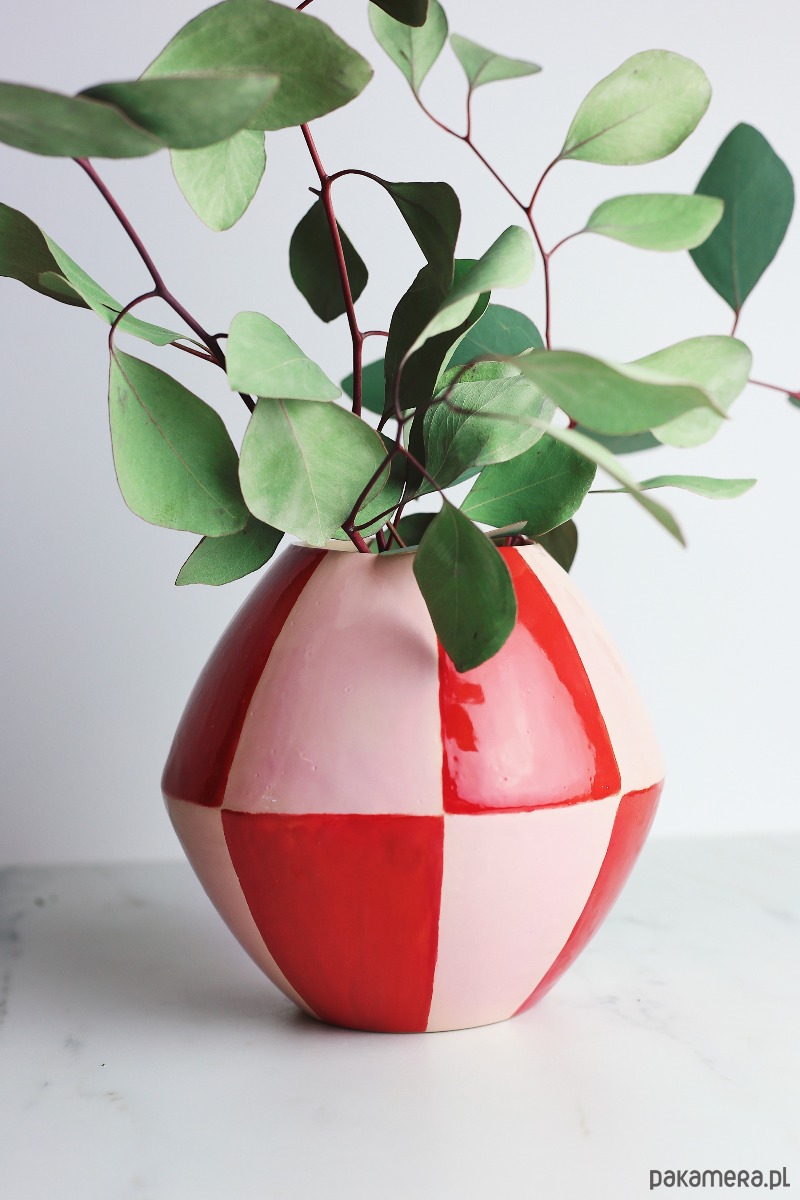 Ceramiczny wazon w różowo-czerwone pasy. Efektowny dodatek do wnętrza.