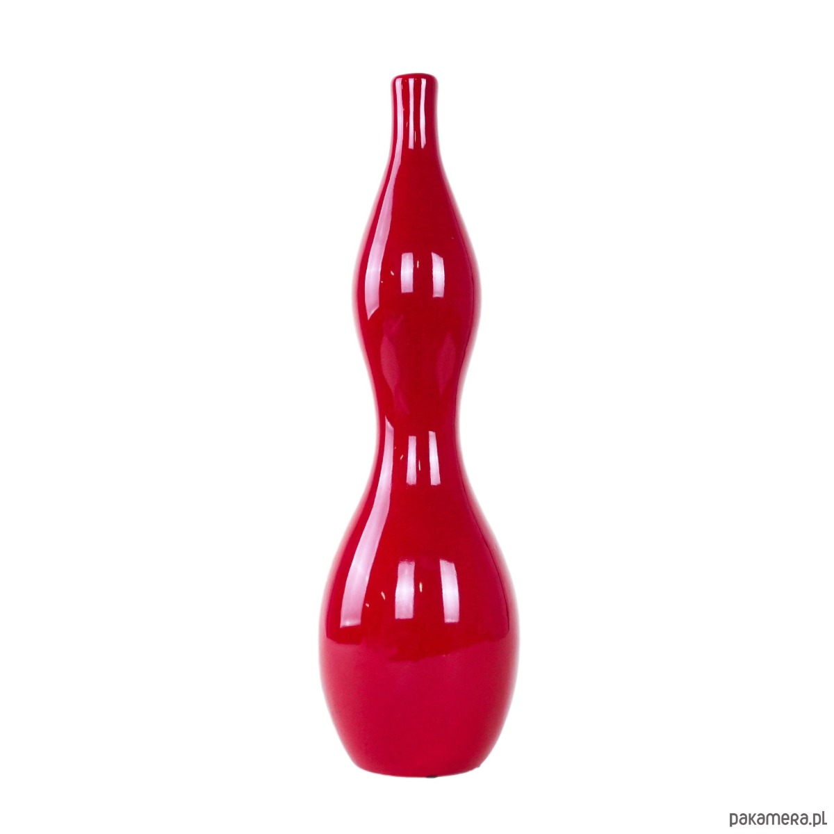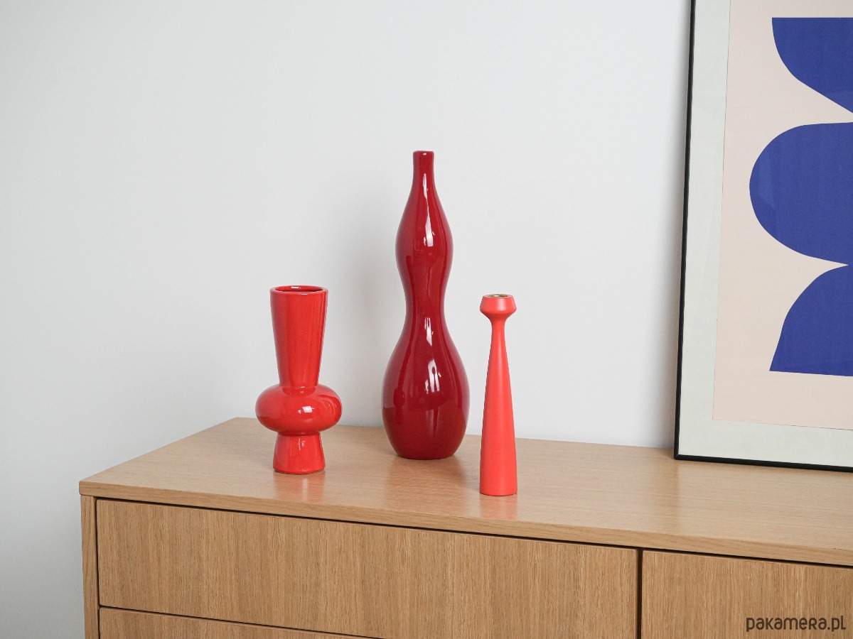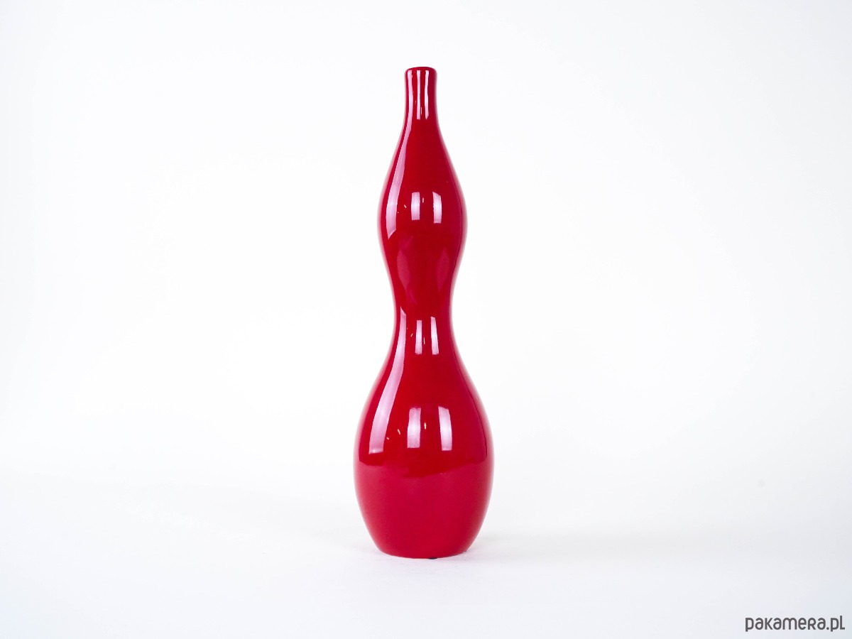 Okazały wazon o rzeźbiarskiej, falującej formie, wykonany z ceramiki i pokryty błyszczącym szkliwem w intensywnym odcieniu czerwieni. Minimalistyczny, a zarazem wyrazisty – idealny jako solowy akcent w nowoczesnym wnętrzu lub element kolekcji vintage ceramiki skandynawskiej.