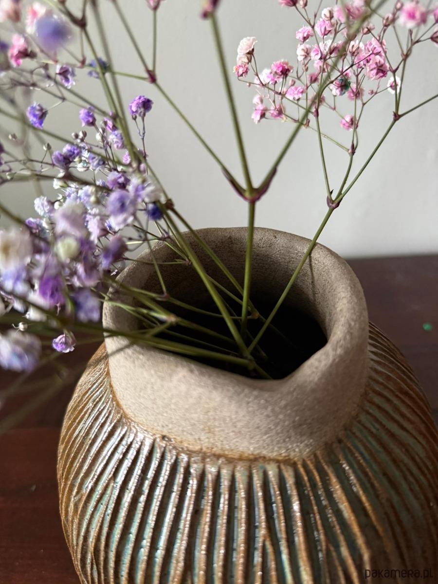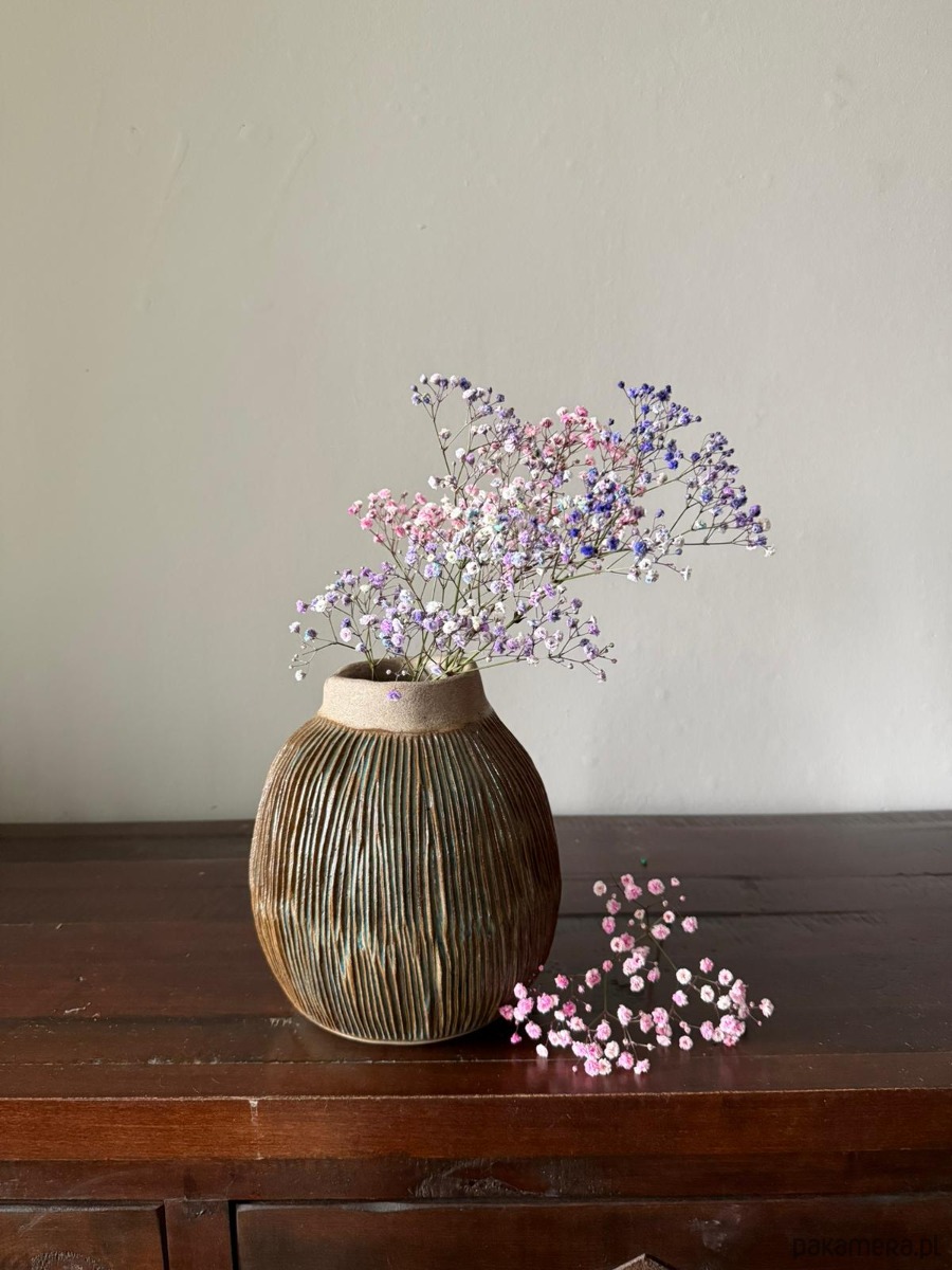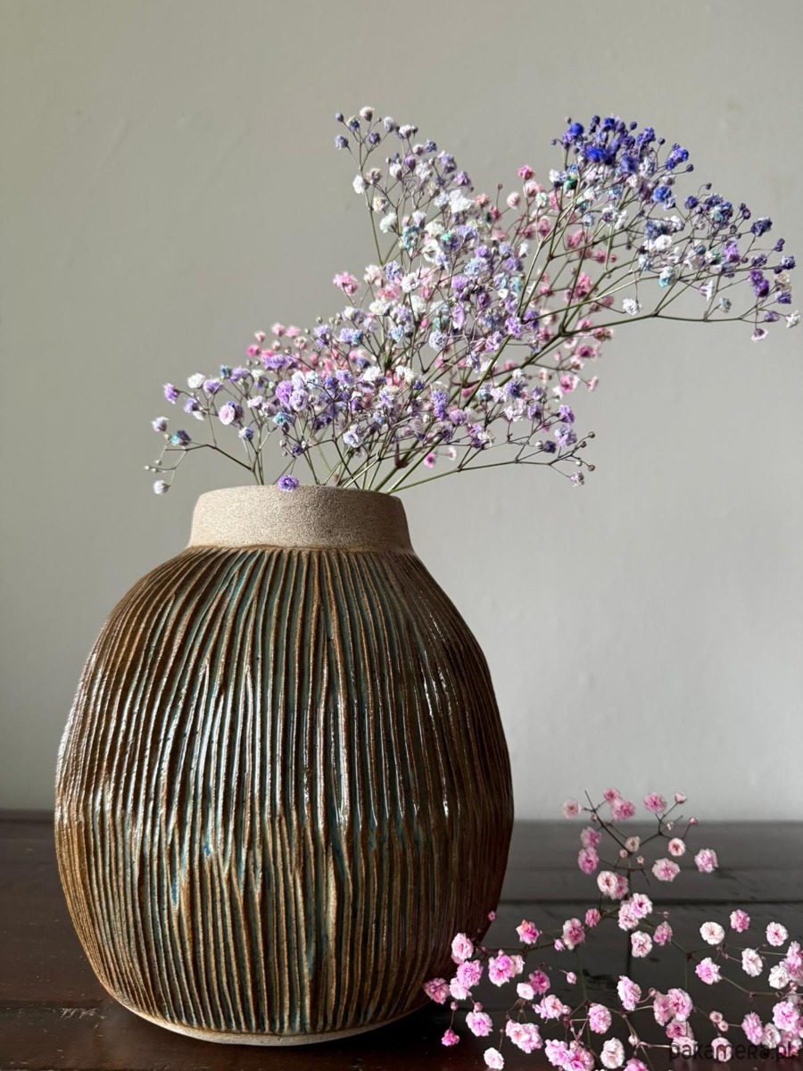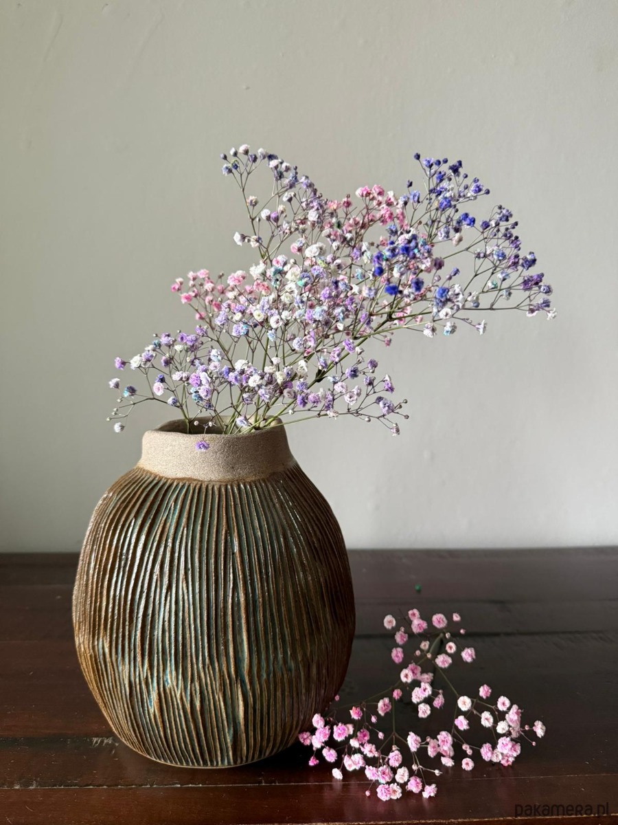 Ten wazon z kolekcji Deep Lines wyróżnia się wyjątkową grą barw i kontrastów. Wykonany ręcznie z szarej gliny, został pokryty błyszczącym szkliwem w odcieniach ciepłego brązu, które subtelnie przechodzi w głębsze tony w zależności od światła. W zagłębieniach wyskrobanych linii pojawia się delikatny akcent koloru niebieskiego, dodający kompozycji głębi i artystycznego wyrazu.