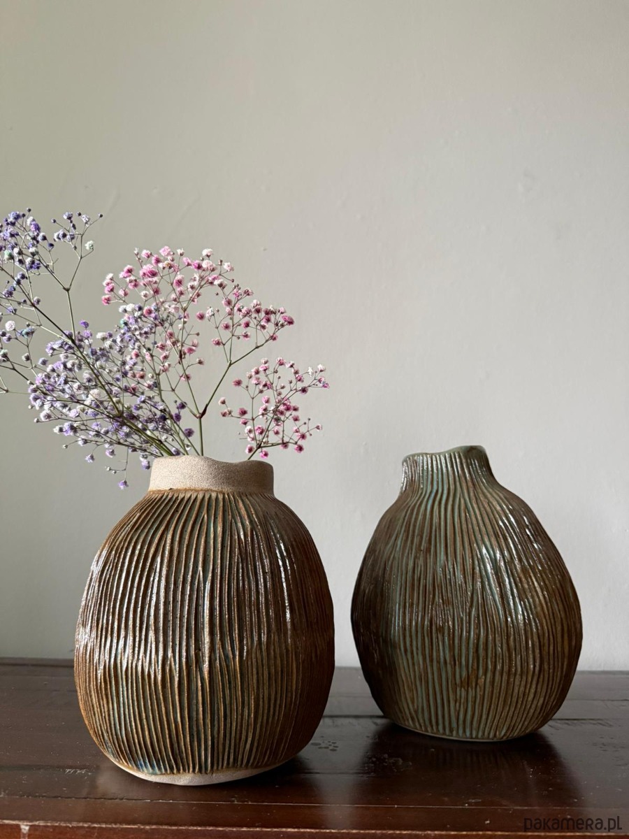 Każdy wazon z tej serii to unikat, powstały w procesie ręcznego formowania, szkliwienia i dekorowania. Struktura linii podkreśla charakter ręcznej pracy, a błyszczące wykończenie wydobywa naturalne piękno gliny.