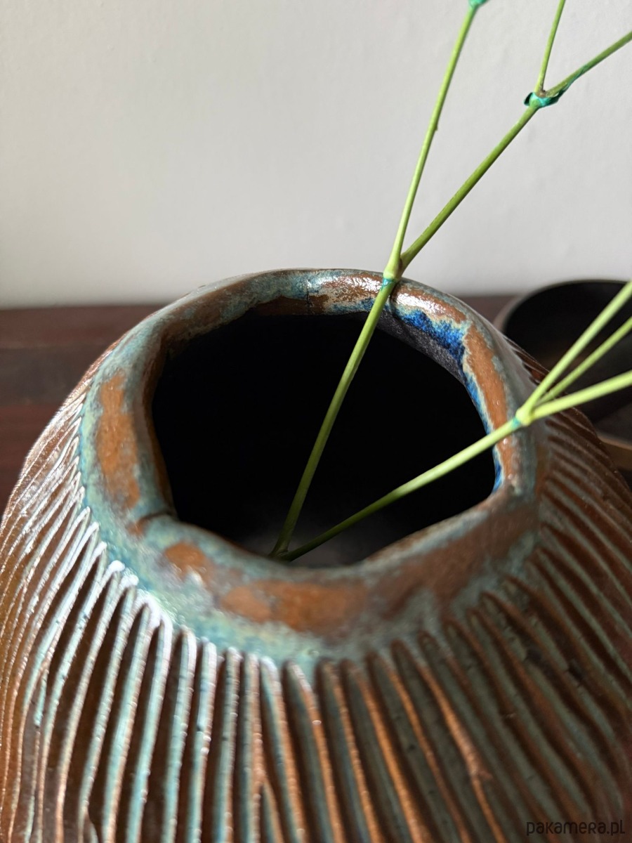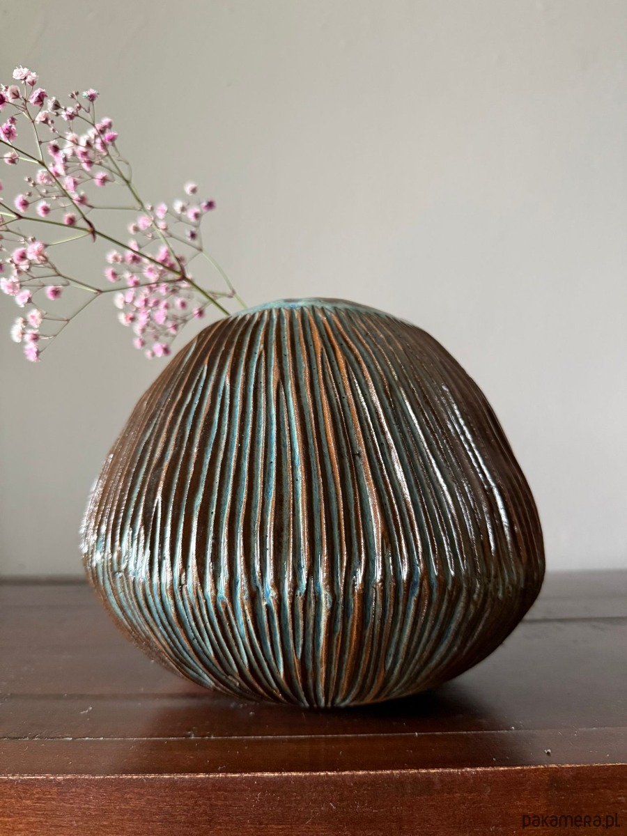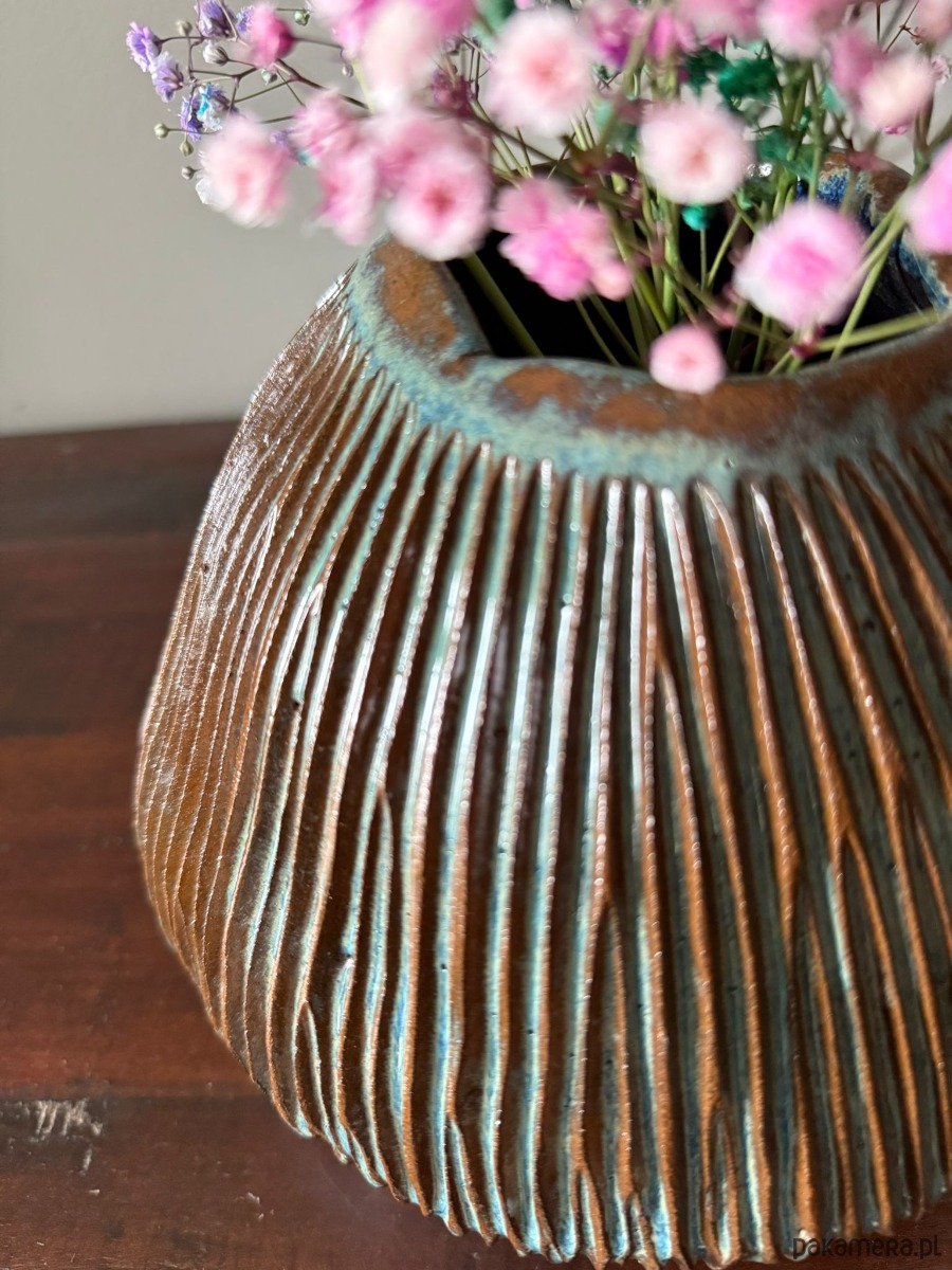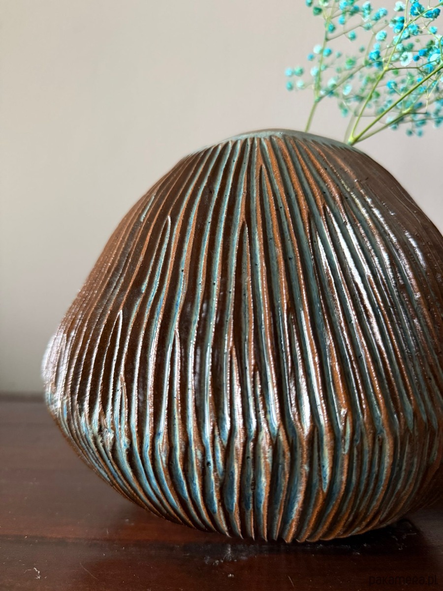 Na powierzchni wazonu widoczne są ręcznie wyskrobane linie, tworzące rytmiczny, organiczny wzór. Każdy detal powstaje z dbałością o formę i fakturę, dzięki czemu każdy egzemplarz jest unikatem o niepowtarzalnym charakterze.