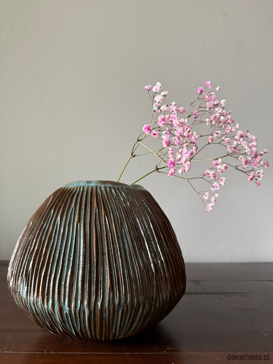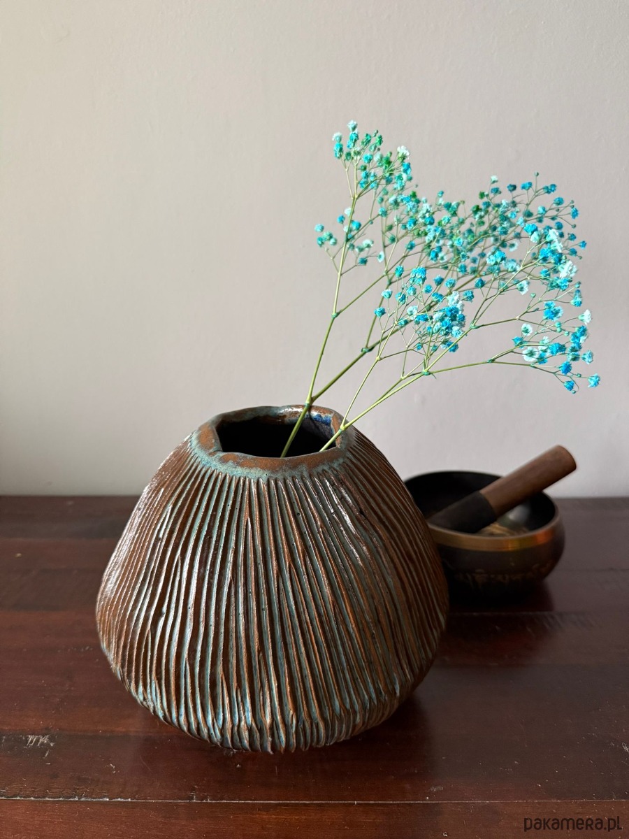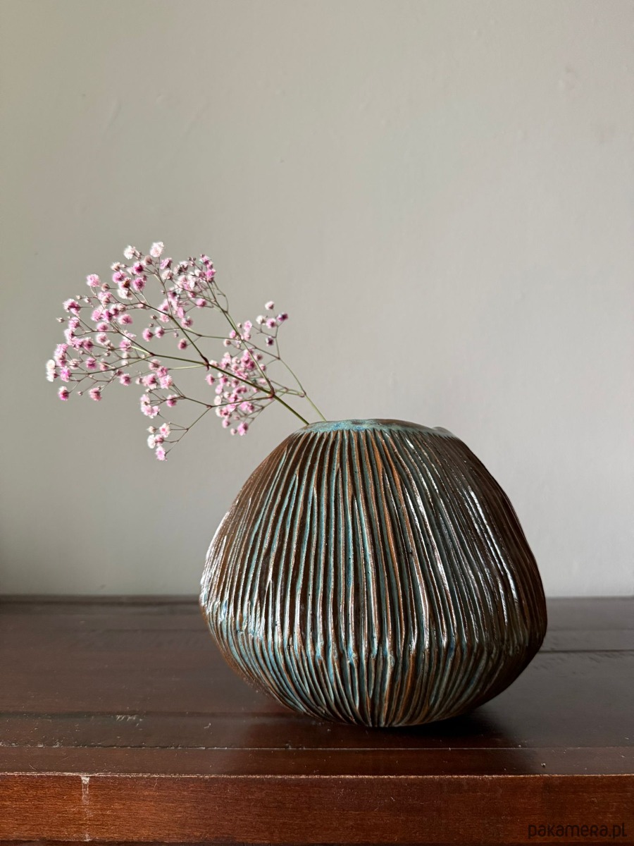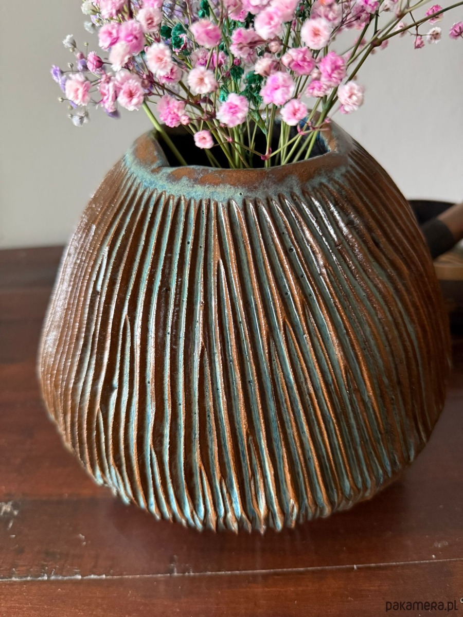 Na powierzchni wazonu widoczne są ręcznie wyskrobane linie, tworzące rytmiczny, organiczny wzór. Każdy detal powstaje z dbałością o formę i fakturę, dzięki czemu każdy egzemplarz jest unikatem o niepowtarzalnym charakterze.