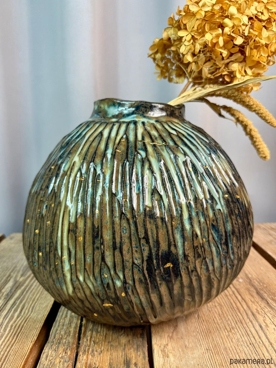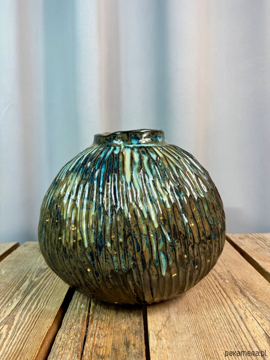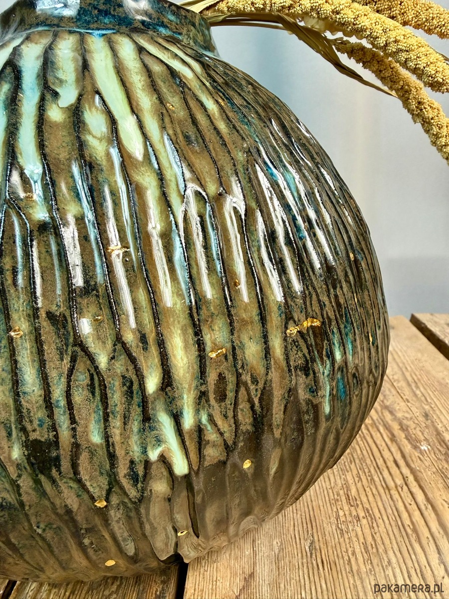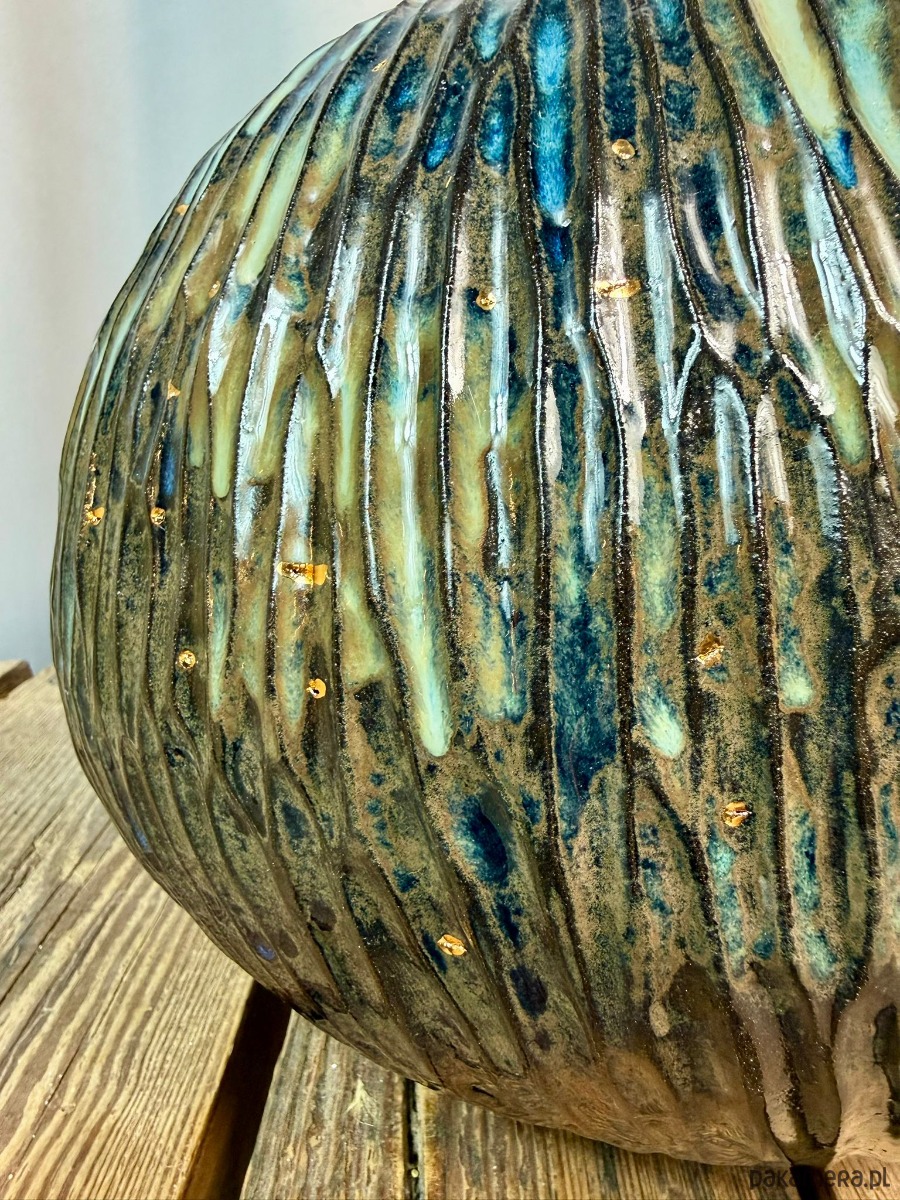 Powierzchnia wazonu została pokryta błyszczącym, efektowym szkliwem w odcieniach brązu, błękitu i zieleni, które tworzą organiczne przejścia kolorystyczne i pięknie reagują na światło. Dodatkowym, szlachetnym akcentem jest złoto, użyte do podkreślenia wybranych fragmentów formy — detal ten nadaje obiektowi elegancji i kolekcjonerskiego charakteru.