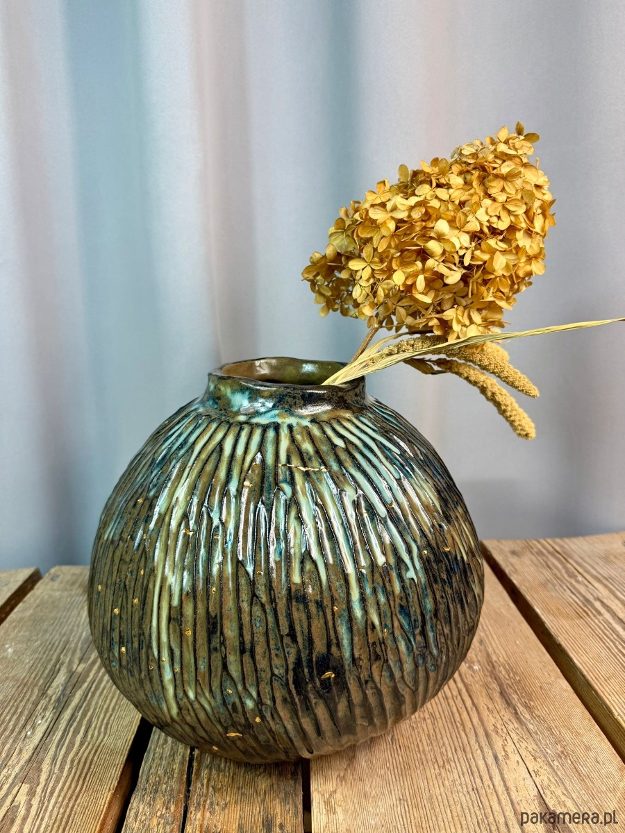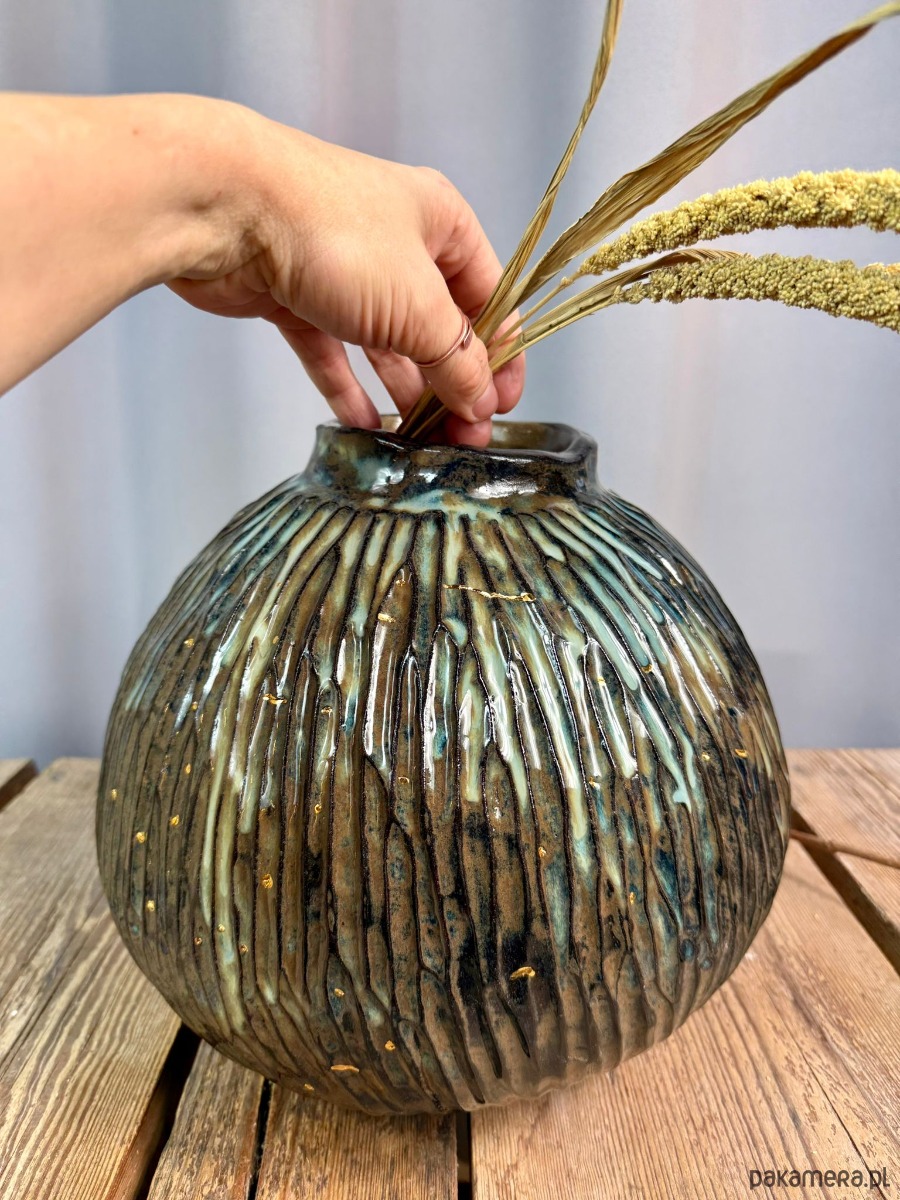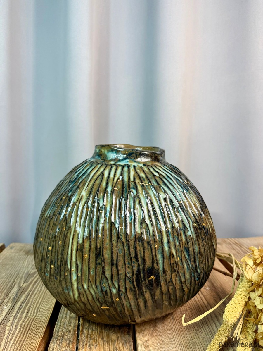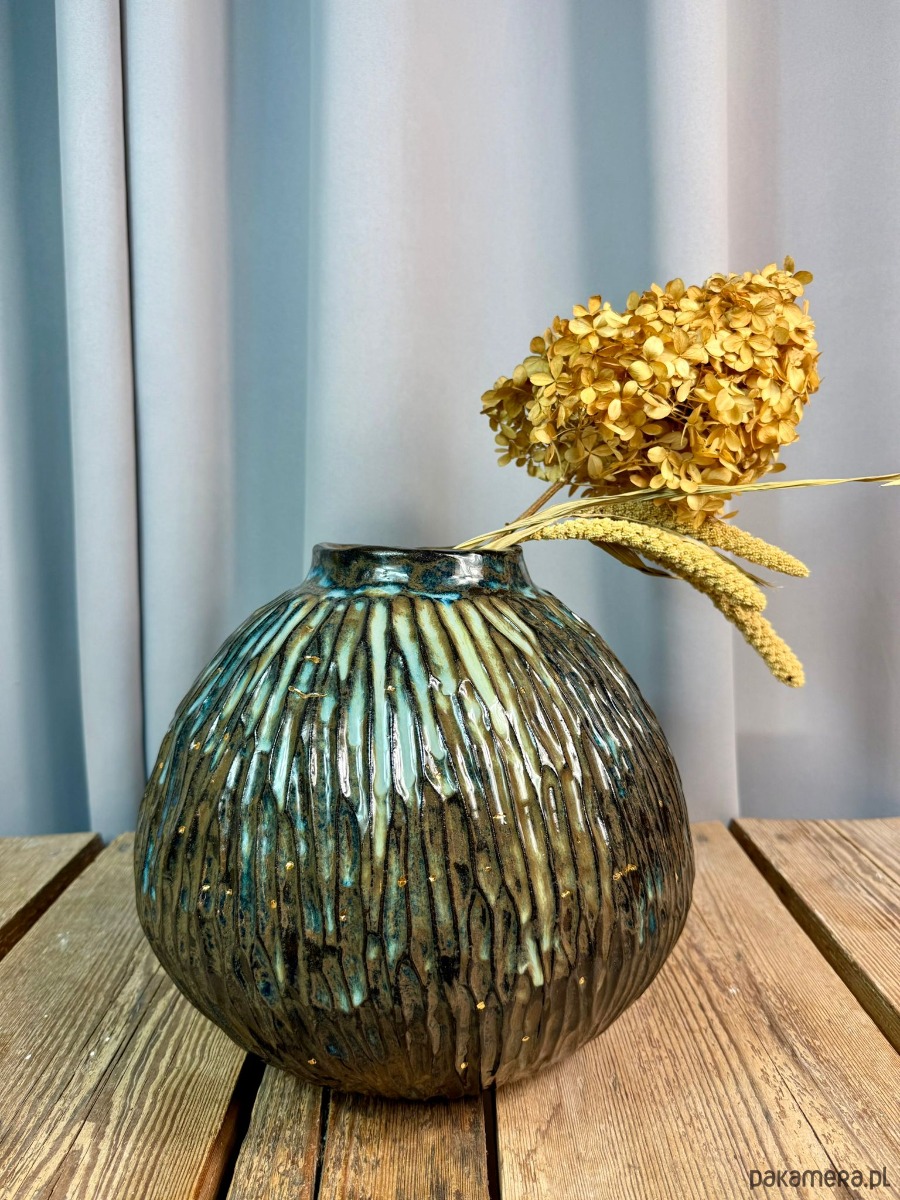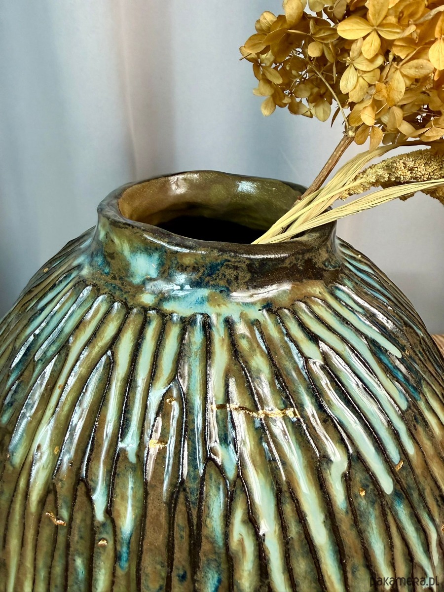 Powierzchnia wazonu została pokryta błyszczącym, efektowym szkliwem w odcieniach brązu, błękitu i zieleni, które tworzą organiczne przejścia kolorystyczne i pięknie reagują na światło. Dodatkowym, szlachetnym akcentem jest złoto, użyte do podkreślenia wybranych fragmentów formy — detal ten nadaje obiektowi elegancji i kolekcjonerskiego charakteru.