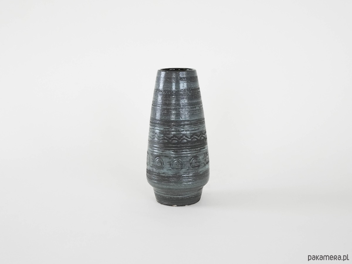 Utrzymany w odcieniach szarości, zdobiony poziomymi, rytmicznymi żłobieniami i geometrycznymi ornamentami. Prosta, smukła forma nadaje mu elegancki charakter, typowy dla ceramiki użytkowej z epoki mid-century.