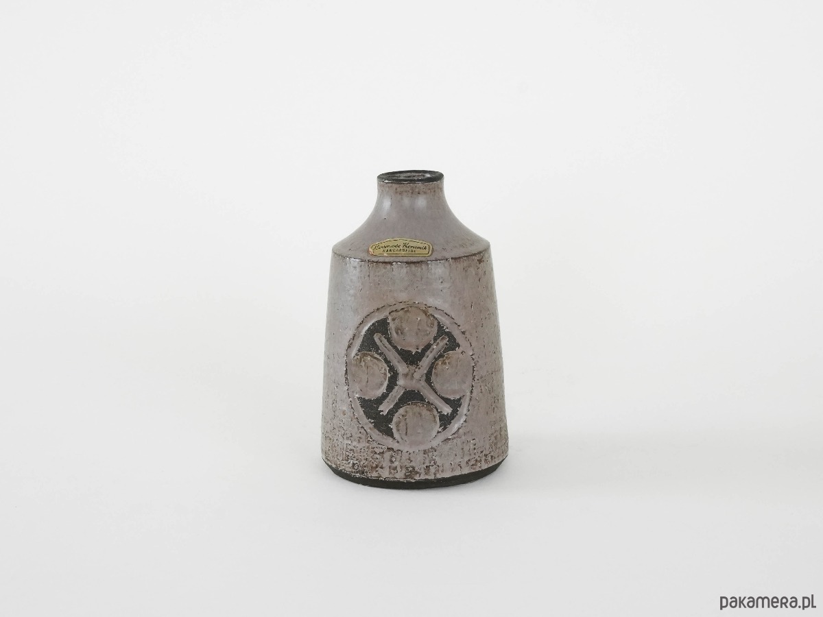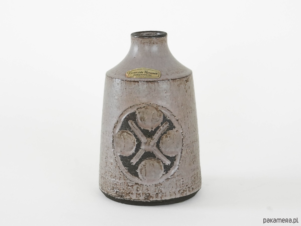 Utrzymany w odcieniach brązu, zdobiony szkliwem o fakturalnej powierzchni oraz reliefowym, abstrakcyjnym wzorem inspirowanym nordycką estetyką. Kolekcjonerski przykład duńskiego designu z połowy XX wieku, łączący prostotę formy z dekoracyjnym detalem.