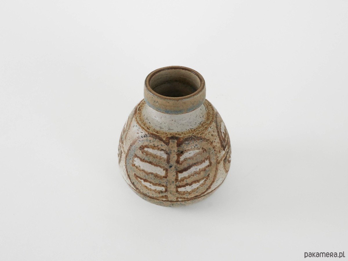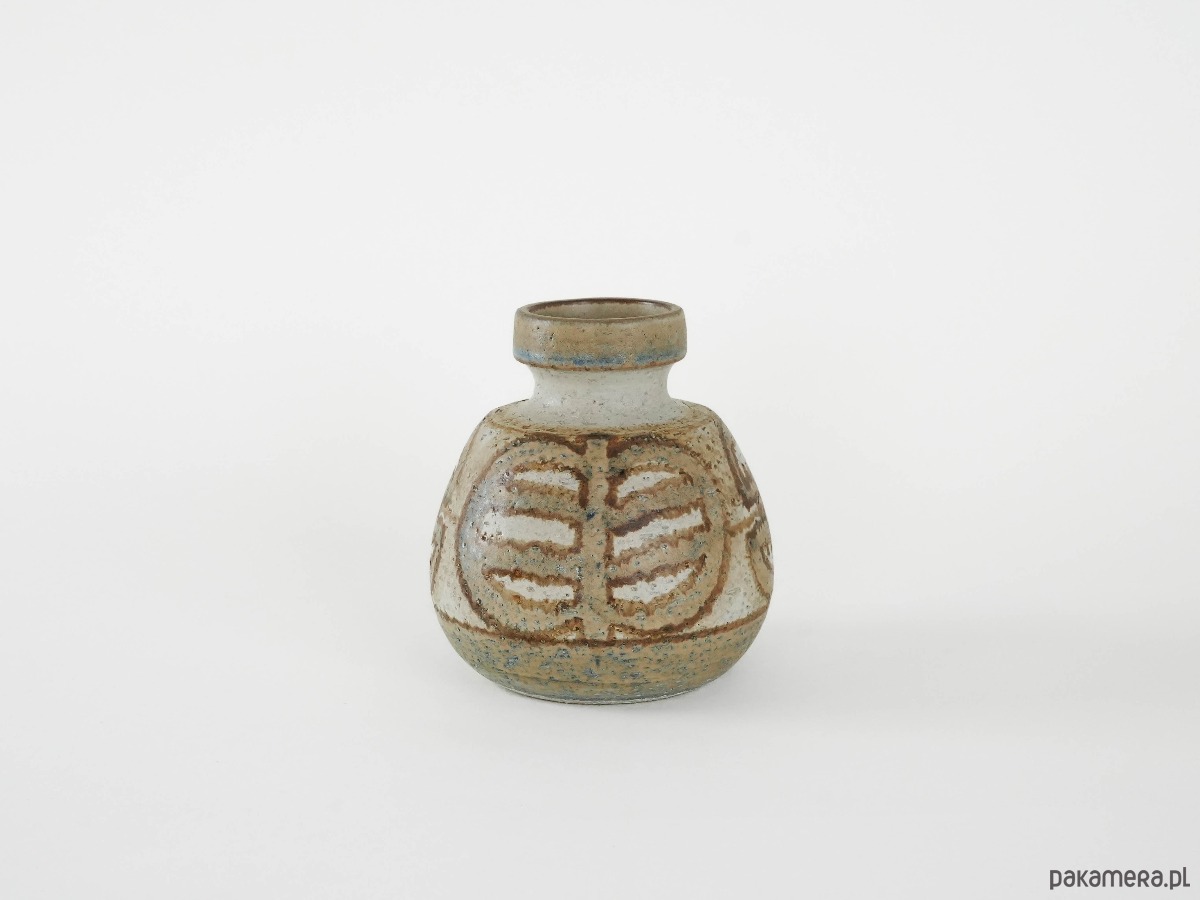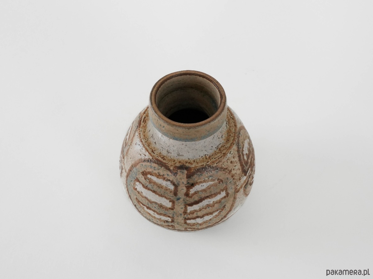 Organiczna forma ozdobiona jest charakterystycznym, ręcznie zdobionym motywem geometrycznym w naturalnych odcieniach beżu, brązu i niebieskiego. Klasyczny przykład skandynawskiej ceramiki artystycznej z połowy wieku.