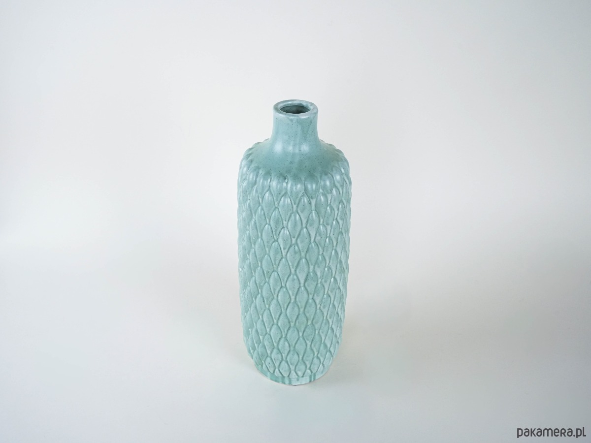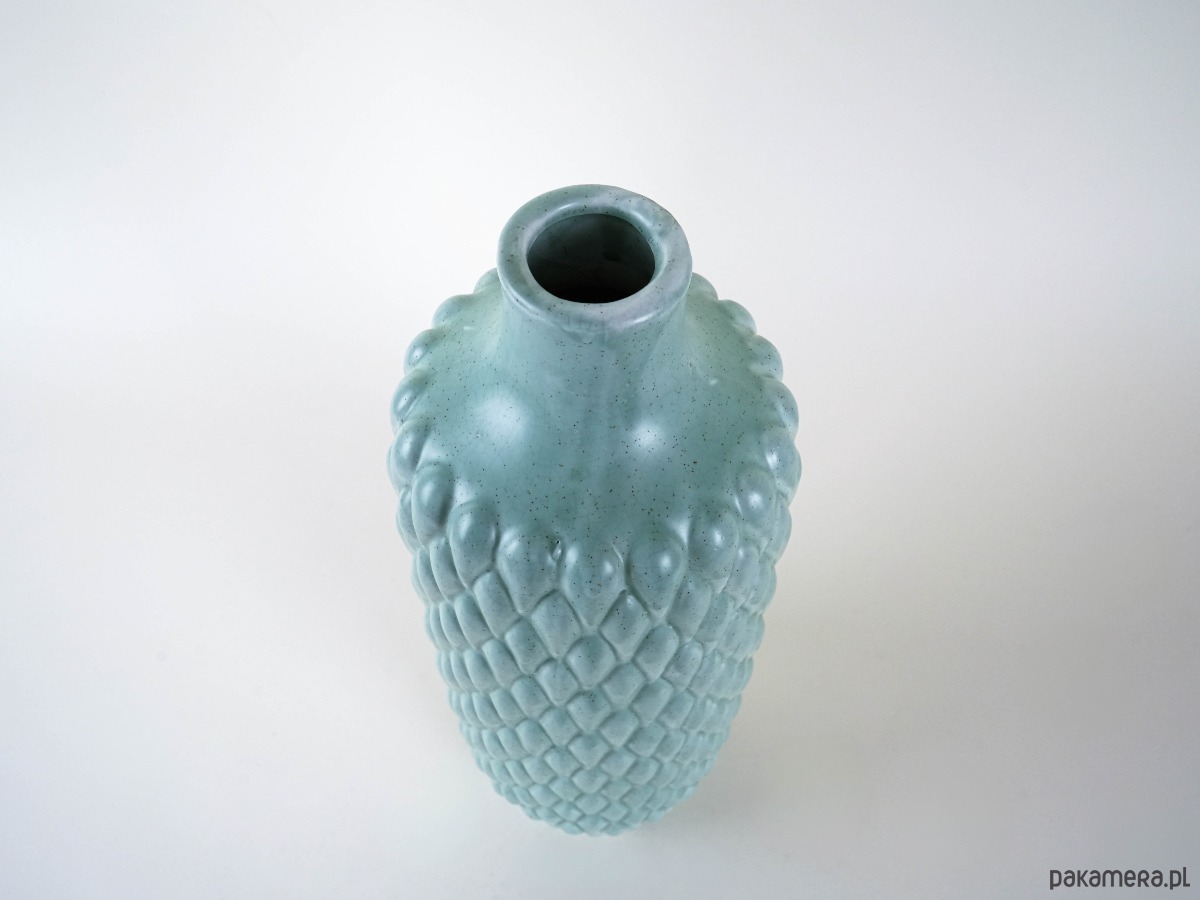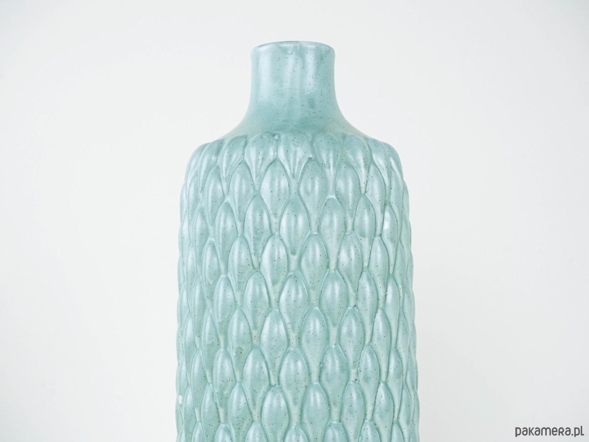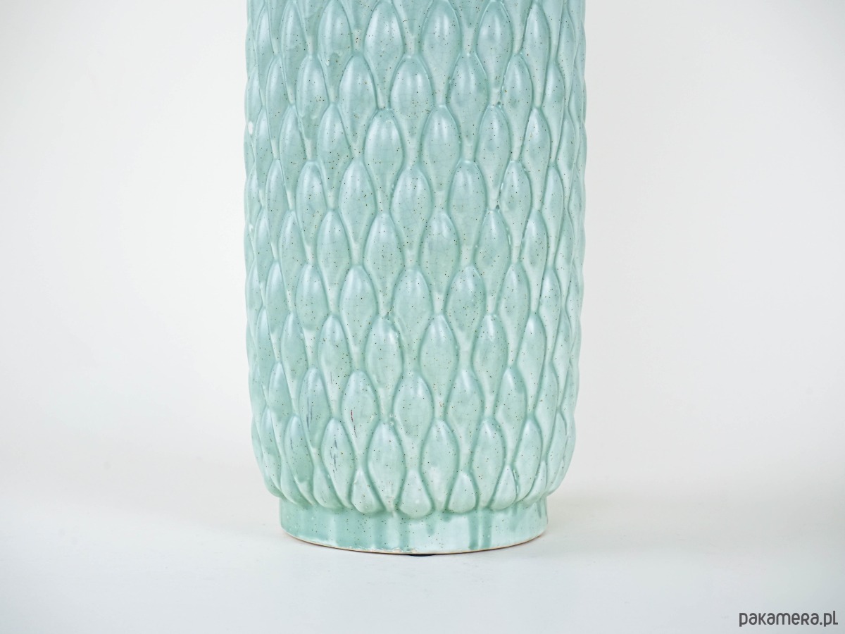 Wyjątkowy egzemplarz wazonu ceramicznego o cylindrycznej formie, zdobionego tłoczonym motywem przypominającym liście lub łuski. Pokryty szkliwem w odcieniu miętowej zieleni z charakterystycznymi dla dawnych wyrobów niuansami kolorystycznymi. Design w klimacie vintage, który doskonale wpisuje się w estetykę kolekcjonerskich dekoracji z połowy XX wieku. Rzadki i efektowny obiekt – idealny dla koneserów unikatowego wzornictwa retro.