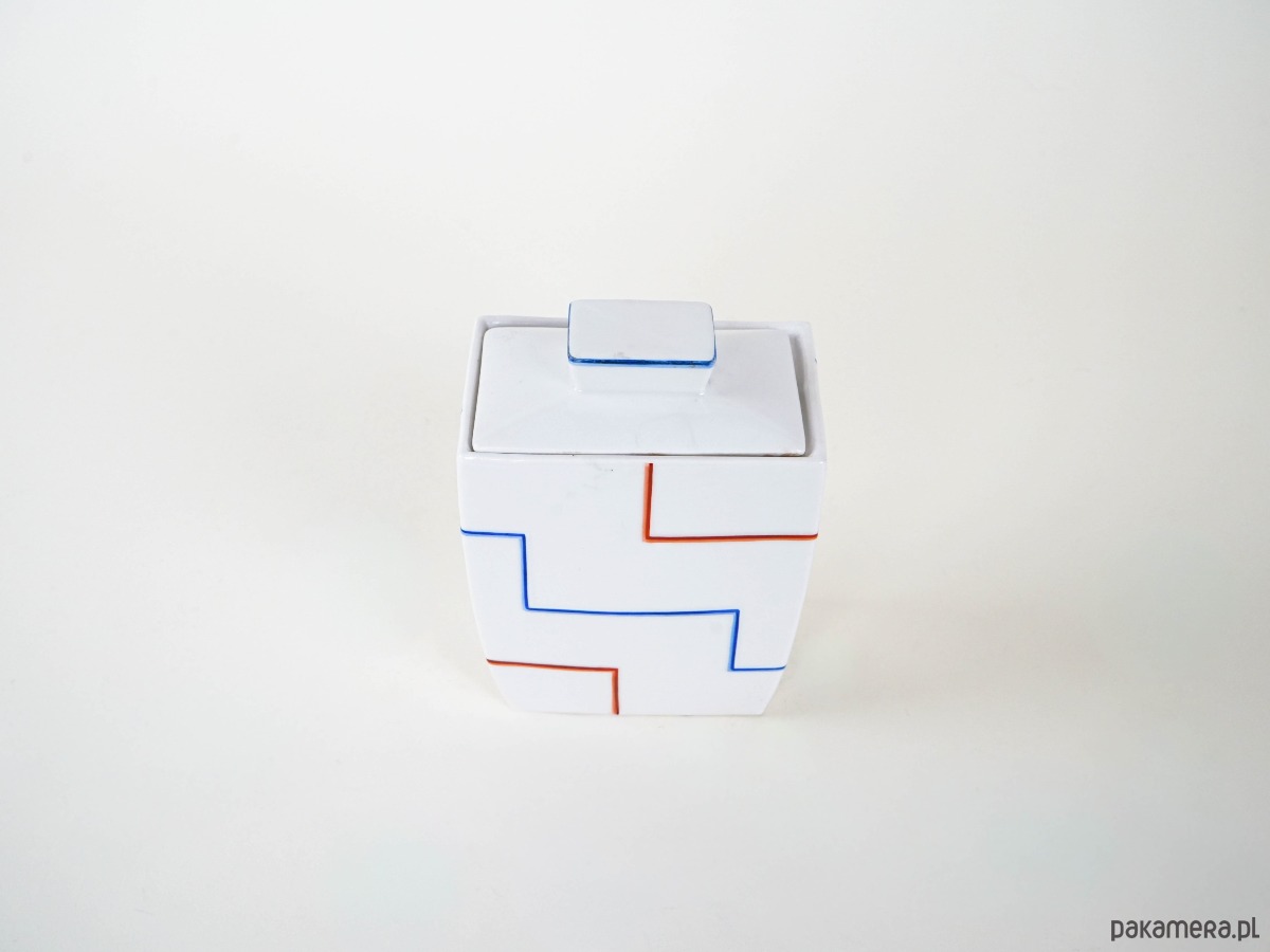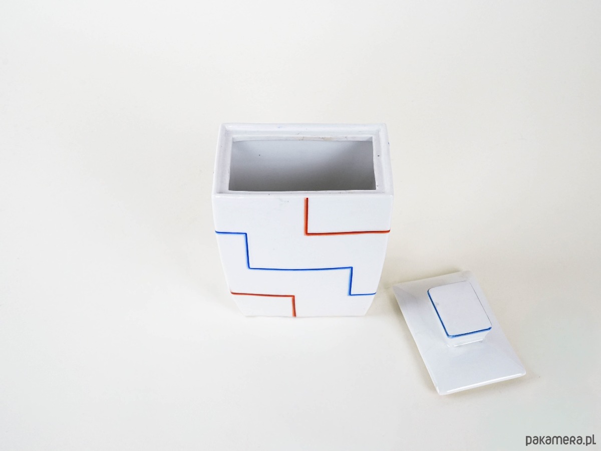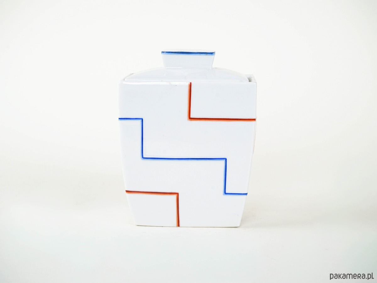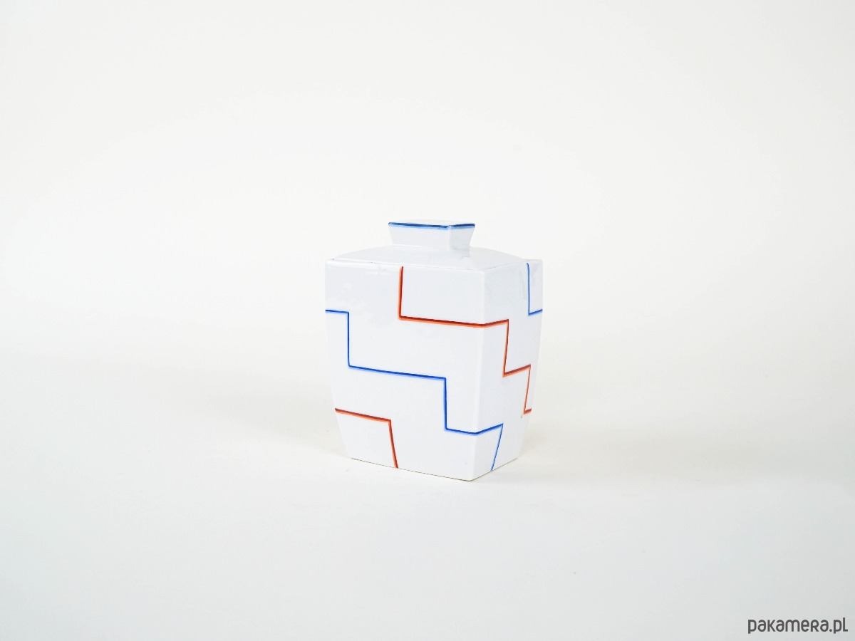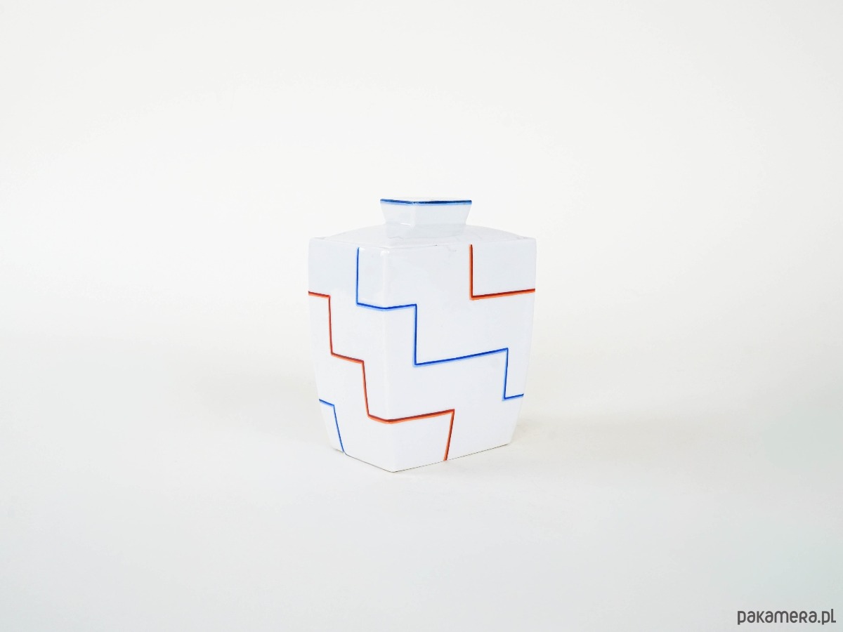 Geometryczny wazon o formie prostopadłościanu, dekorowany minimalistycznym wzorem złożonym z czerwonych i niebieskich linii układających się w rytmiczny, kanciasty motyw. Biała powierzchnia ceramiki kontrastuje z prostą, graficzną dekoracją, nadając całości modernistyczny charakter.