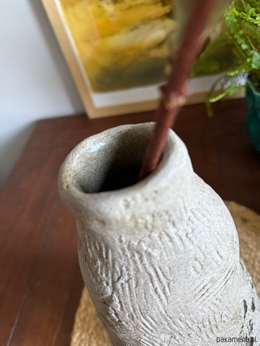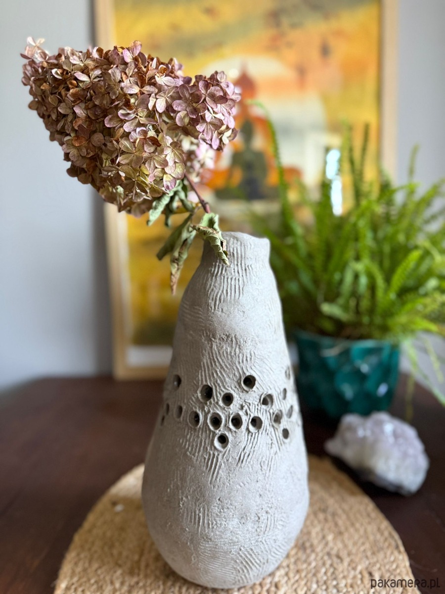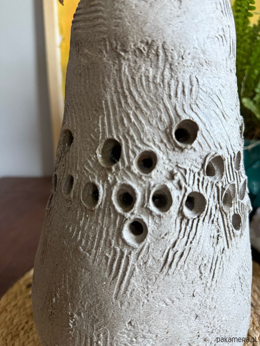 Elegancki wazon wykonany ręcznie z szarej, betonowej gliny. Jego powierzchnia zewnętrzna zachowuje naturalną strukturę, co nadaje mu autentyczny i niepowtarzalny charakter. Wnętrze wykończone jest transparentnym szkliwem, które łączy funkcjonalność z subtelną estetyką.