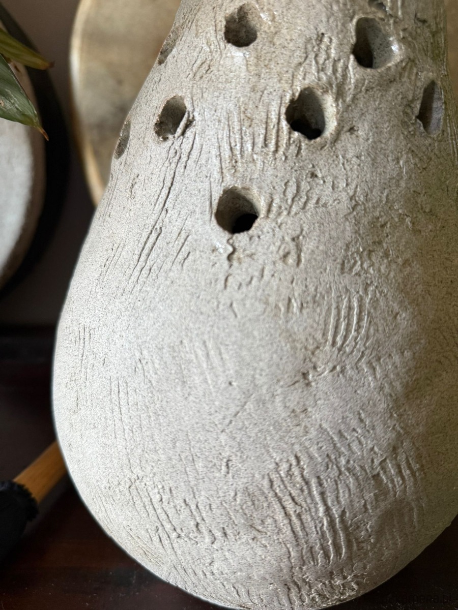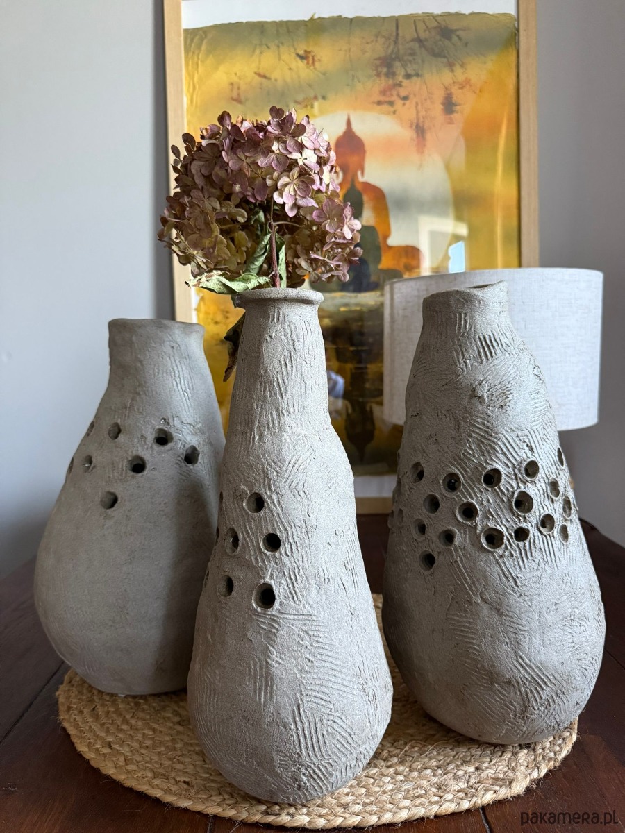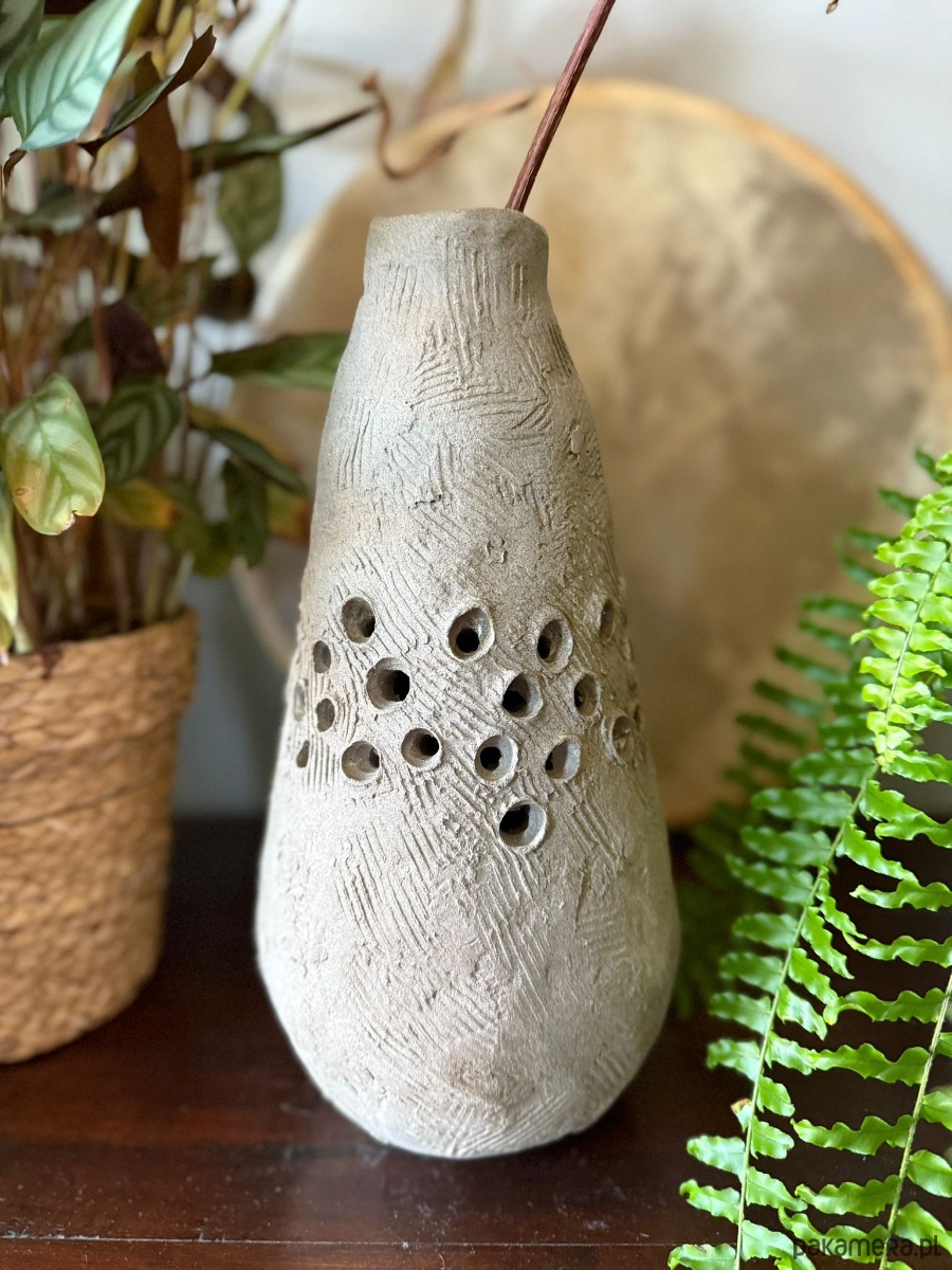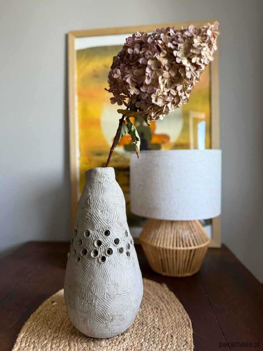Elegancki wazon wykonany ręcznie z szarej, betonowej gliny. Jego powierzchnia zewnętrzna zachowuje naturalną strukturę, co nadaje mu autentyczny i niepowtarzalny charakter. Wnętrze wykończone jest transparentnym szkliwem, które łączy funkcjonalność z subtelną estetyką.