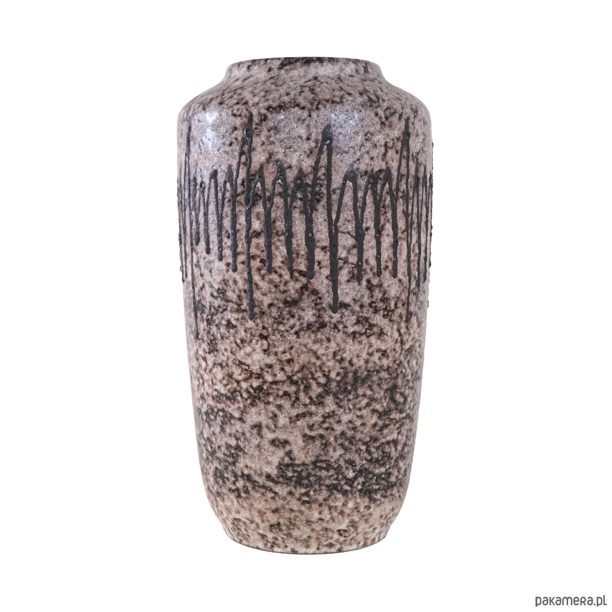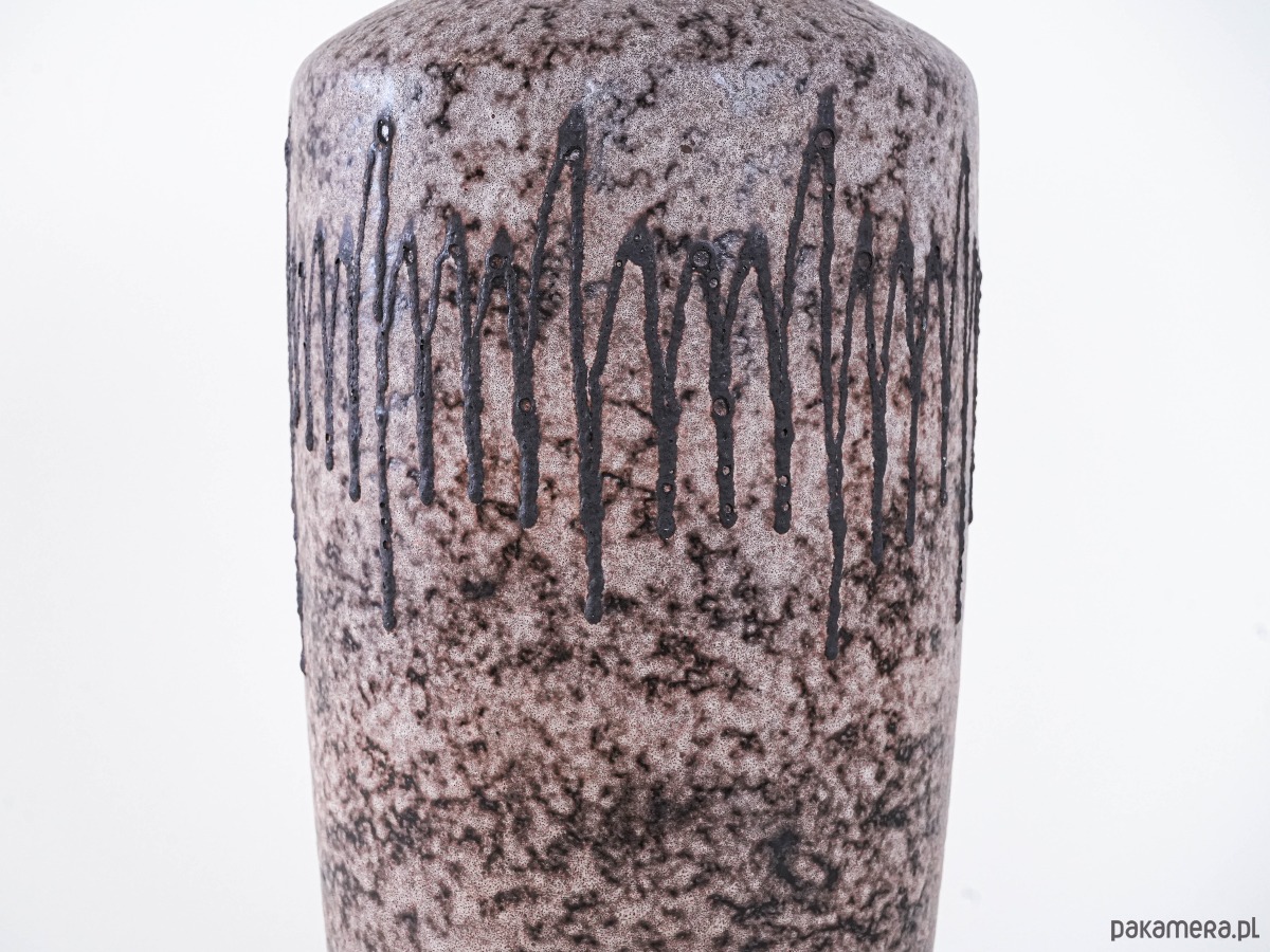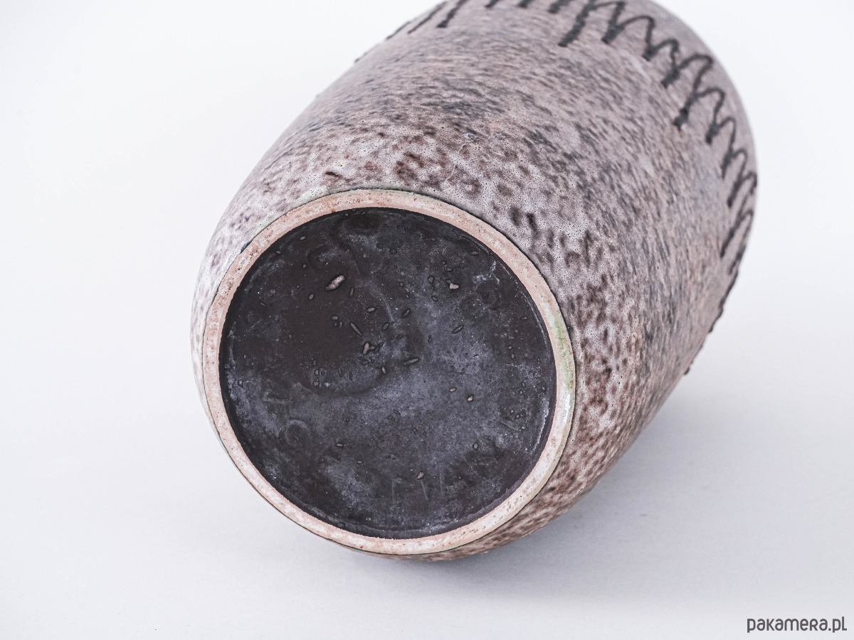 Duża forma o matowej powierzchni w odcieniach beżu i brązu, zdobiona charakterystycznym dla stylu Fat Lava reliefowym wzorem w postaci ciemnych, pionowych linii. Imponujący egzemplarz kolekcjonerski z lat 60./70. XX wieku.