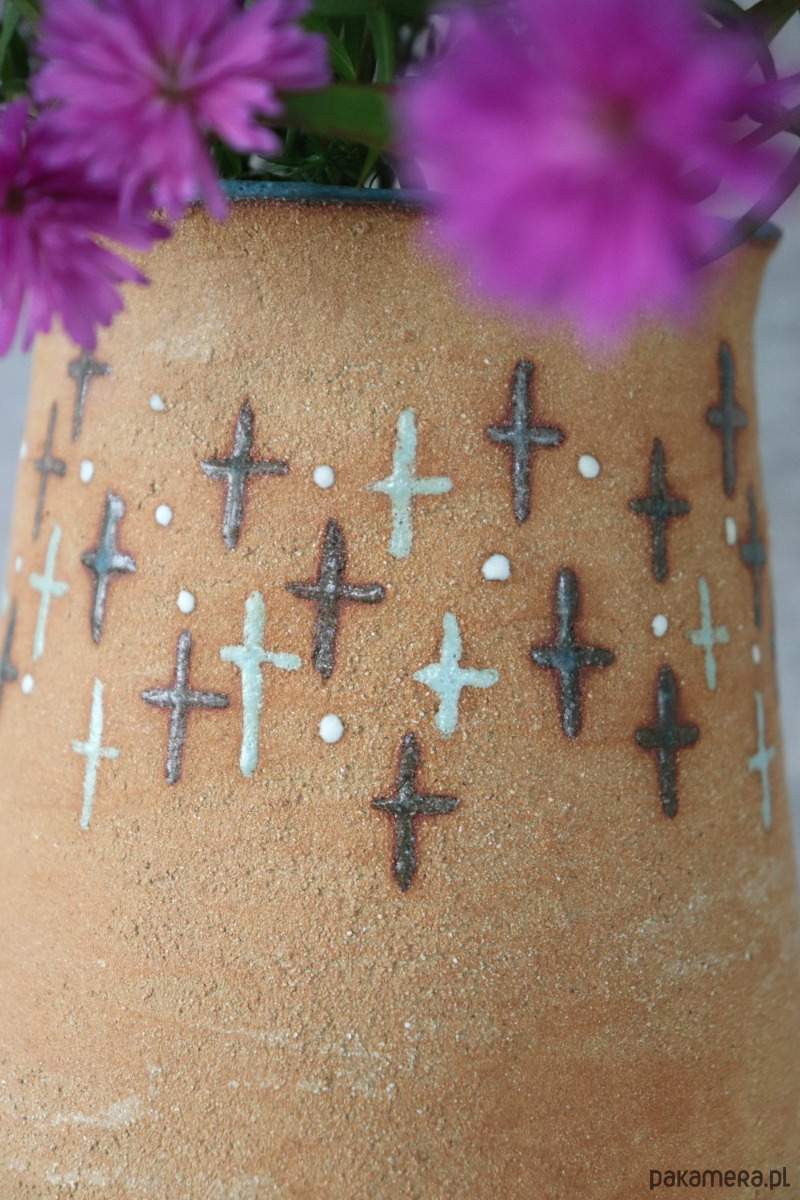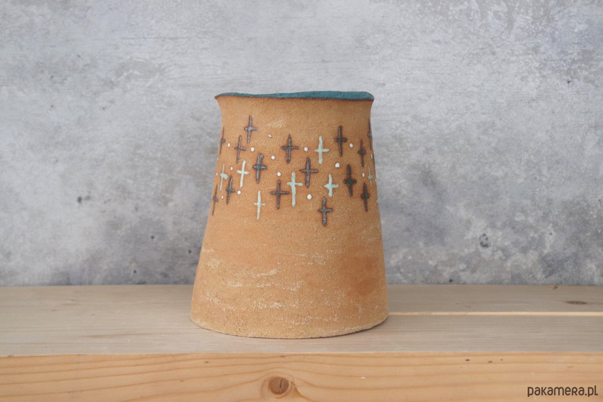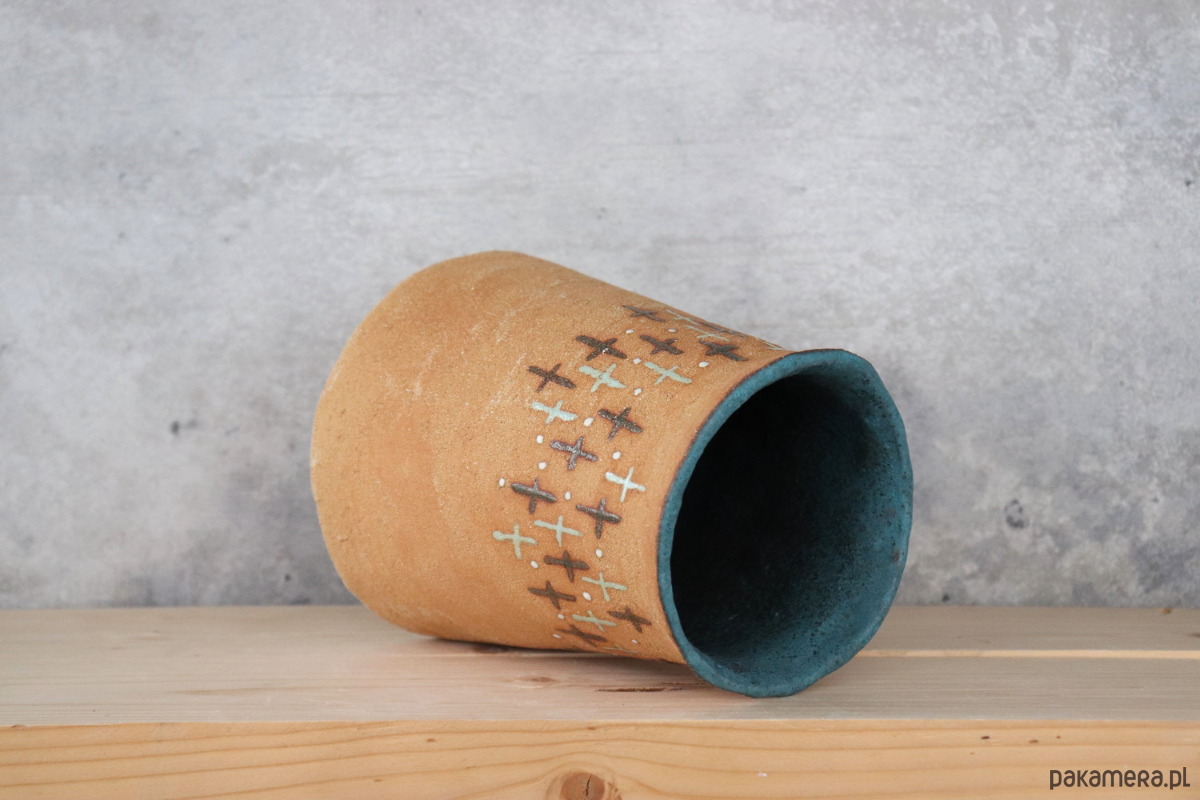Wazon wykonany z żółtej, surowej gliny, zdobiony delikatnym wzorem, który został narysowany za pomocą szkliw. Środek pokryty niebieskim szkliwem. Naczynie zostało wykonane ręcznie, bez użycia koła garncarskiego.