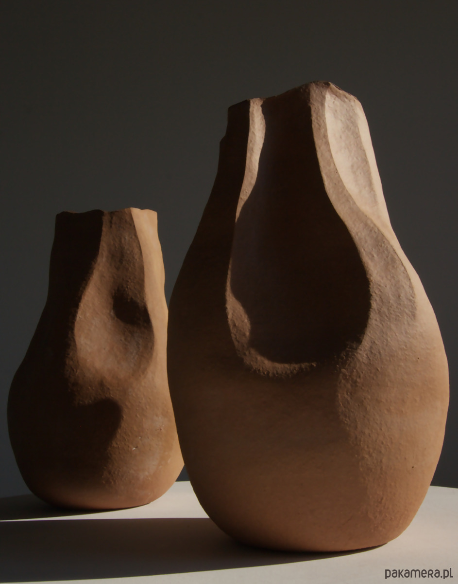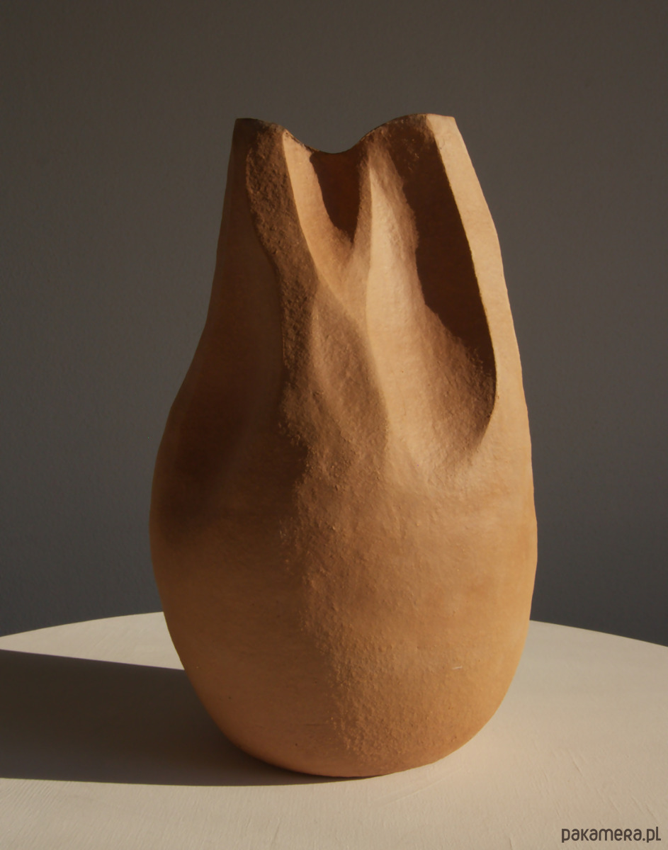 Unikatowy ceramiczny wazon o nieregularnej, organicznej formie, ręcznie formowany z gliny i inspirowany naturalnymi kształtami. Z zewnątrz pozostawiony nieszkliwiony, w ciepłym, brązowym odcieniu naturalnej gliny, który podkreśla surowość materiału i rzemieślniczy charakter obiektu. Wnętrze wazonu szkliwione brązowym szkliwem, zapewniającym funkcjonalność i subtelny kontrast faktur.