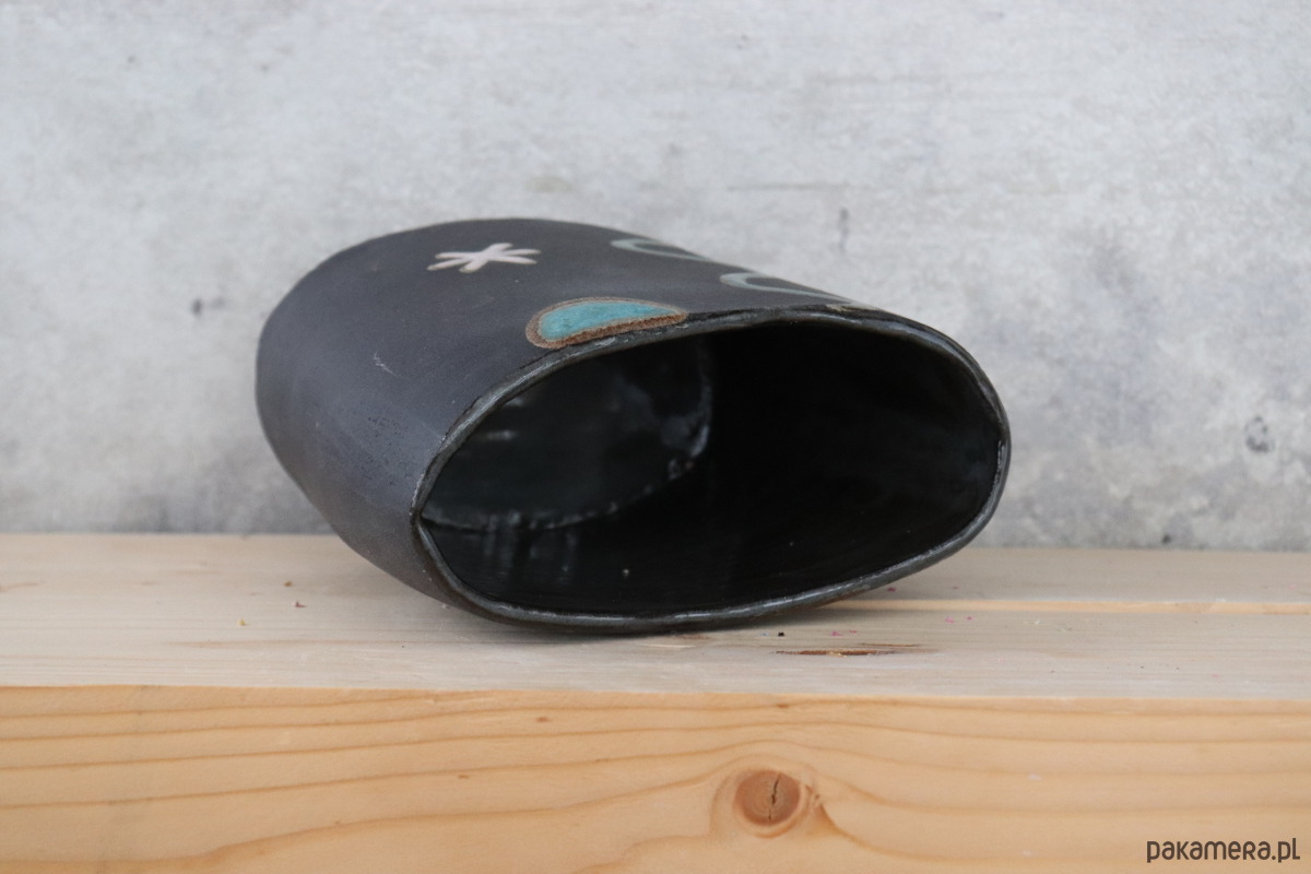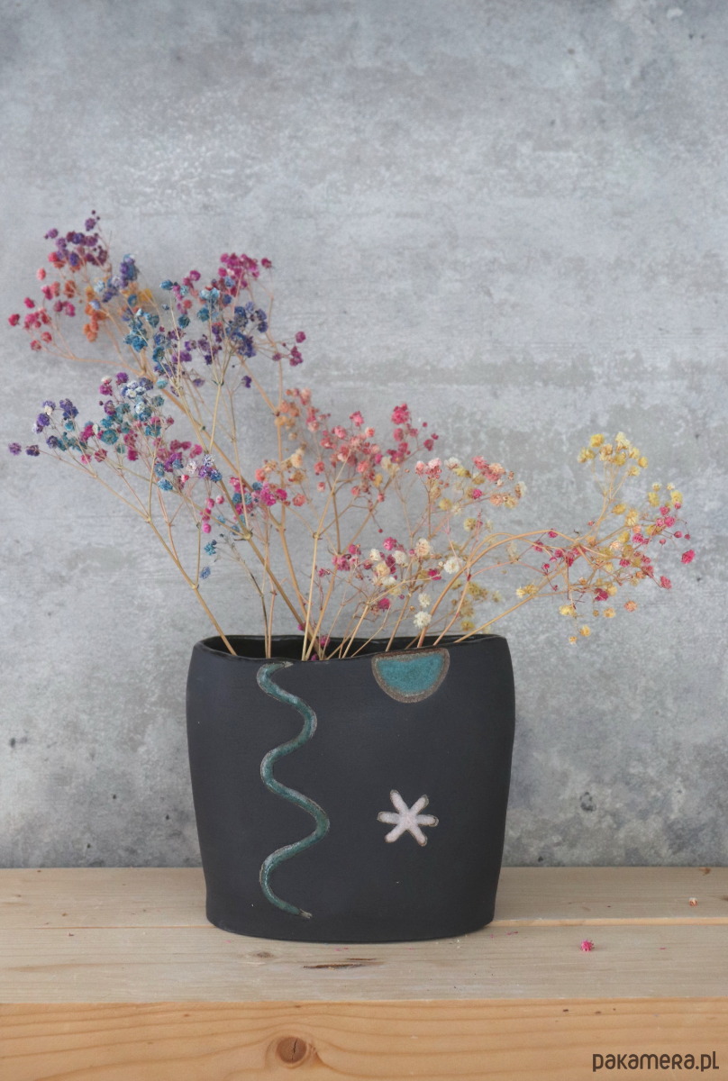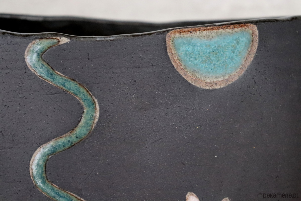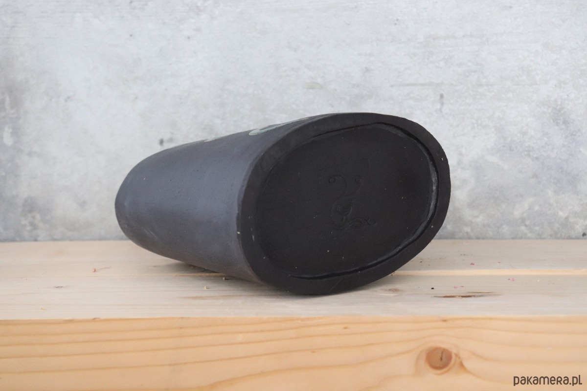 Wazon wykonany z czarnej, surowej gliny, dekorowany z obu stron prostym rysunkiem. Środek pokryty ciemnym szkliwem. Naczynie zostało wykonane ręcznie, bez użycia koła garncarskiego.