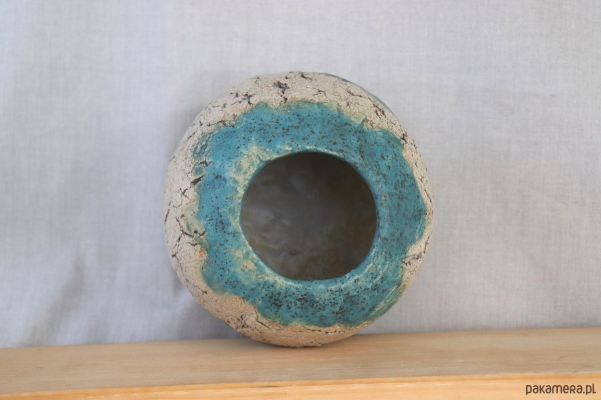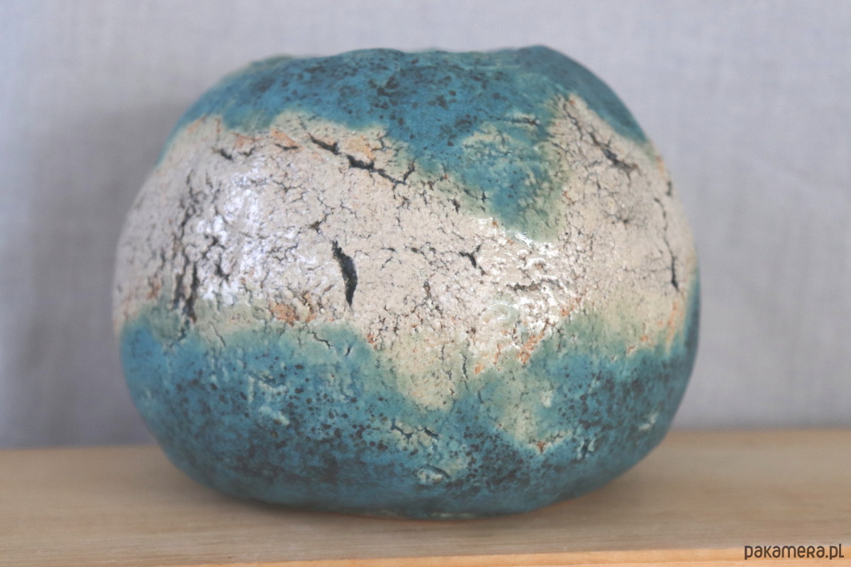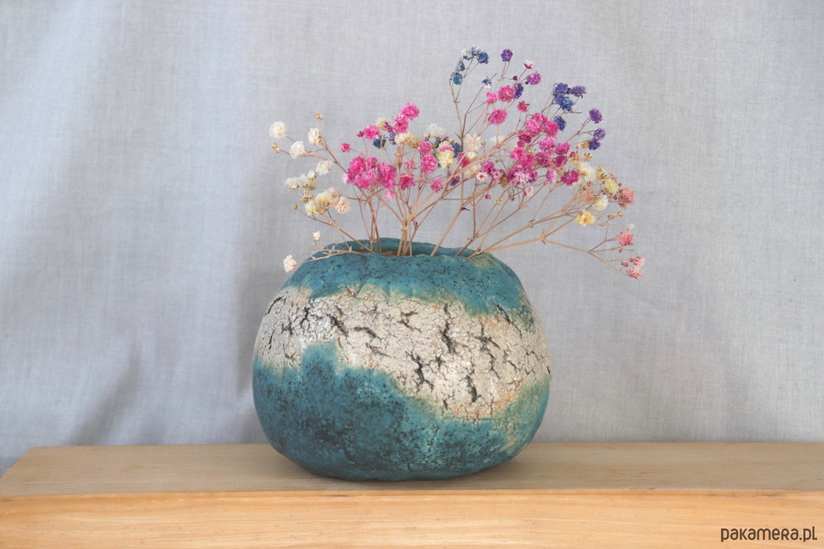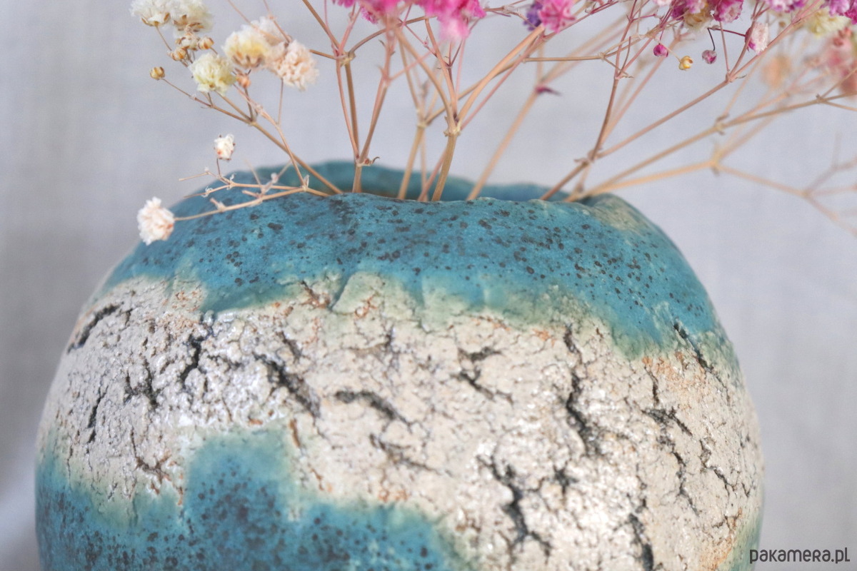 Wazon z jasnej gliny, ręcznie formowany, z delikatnymi spękaniami podkreślonymi ciemną farbą ceramiczną. Dekorowany niebieskim szkliwem. Wzory na naczyniu nie są powtarzalne, więc z każdej strony wygląda nieco inaczej.
