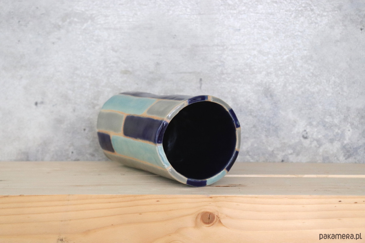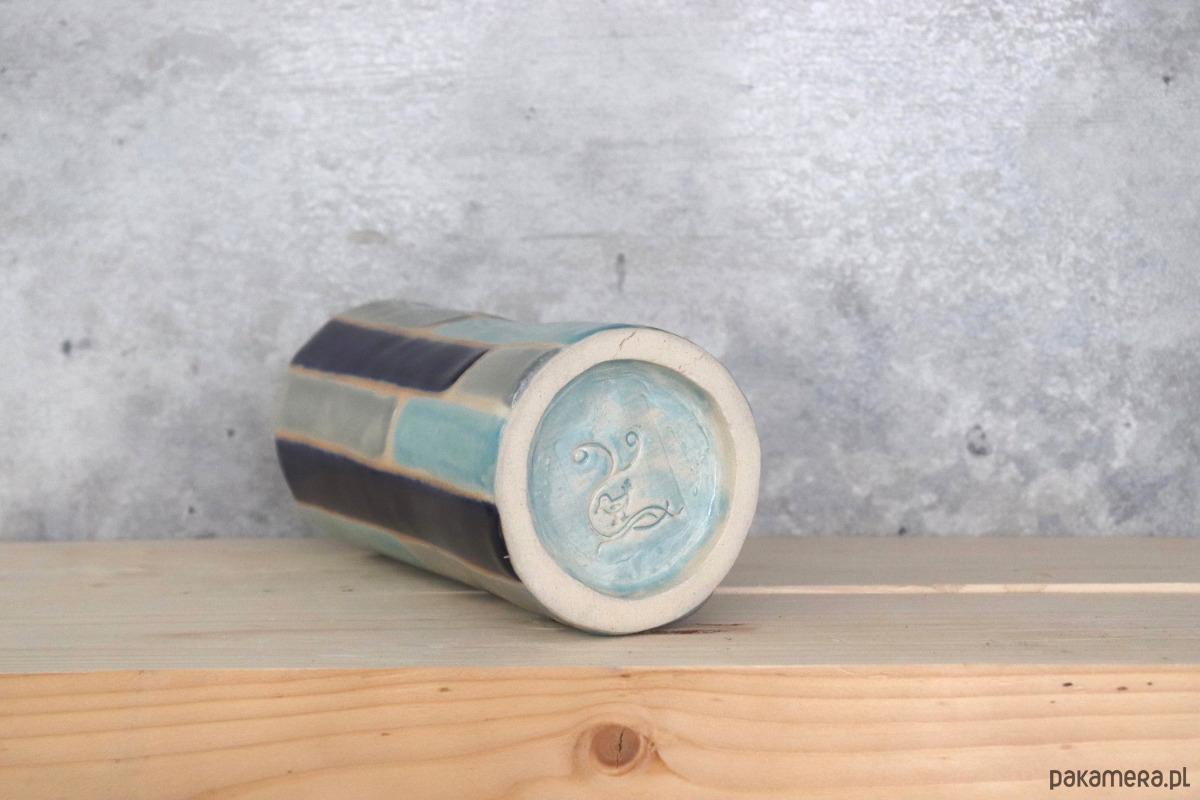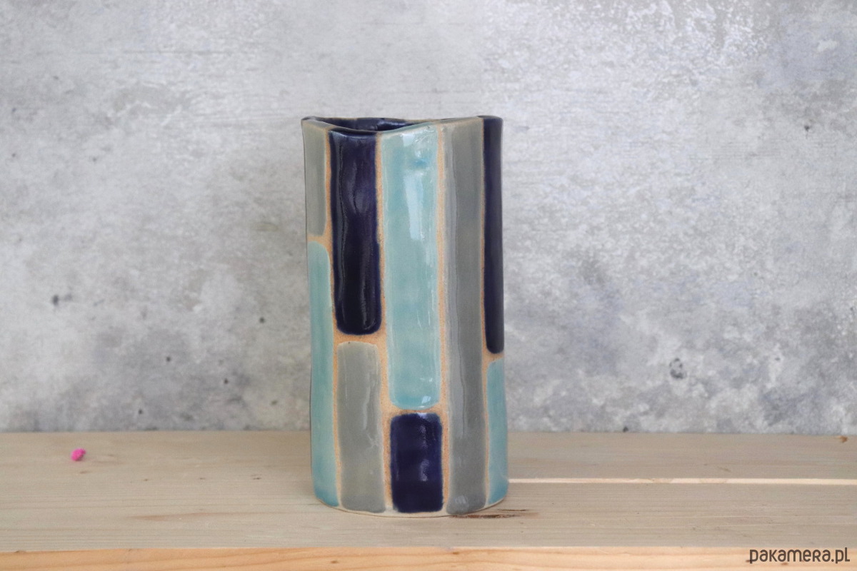 Wazon wykonany z białokremowej gliny, dekorowany szkliwami w odcieniach błękitu i szarości. Środek pokryty szkliwem kobaltowym. Wzory na naczyniu nie są powtarzalne, więc z każdej strony wygląda ono nieco inaczej. Naczynie zostało wykonane ręcznie, bez użycia koła garncarskiego.