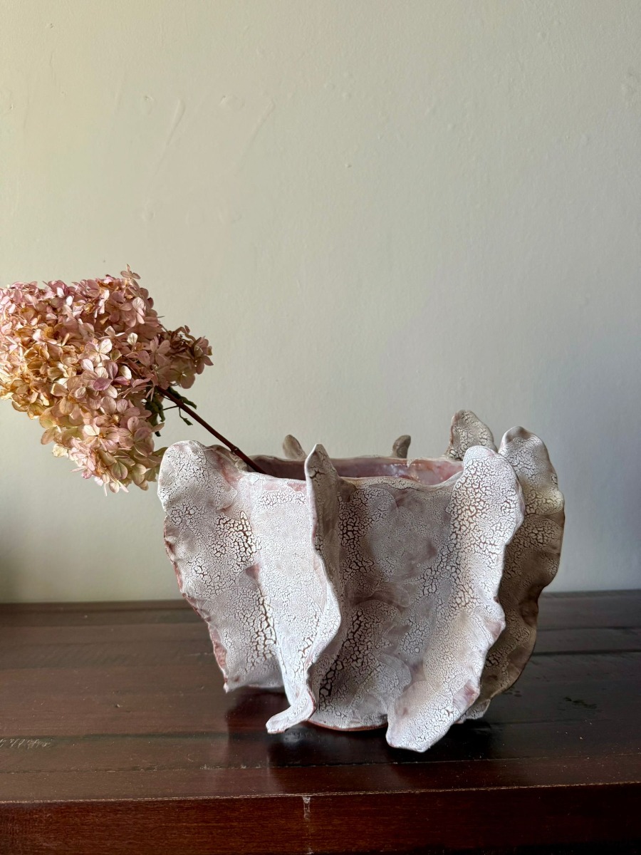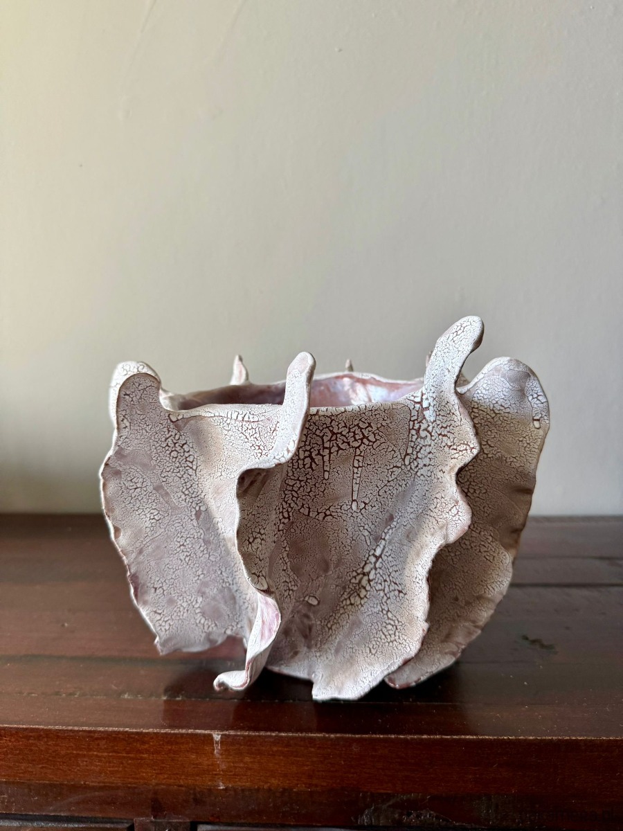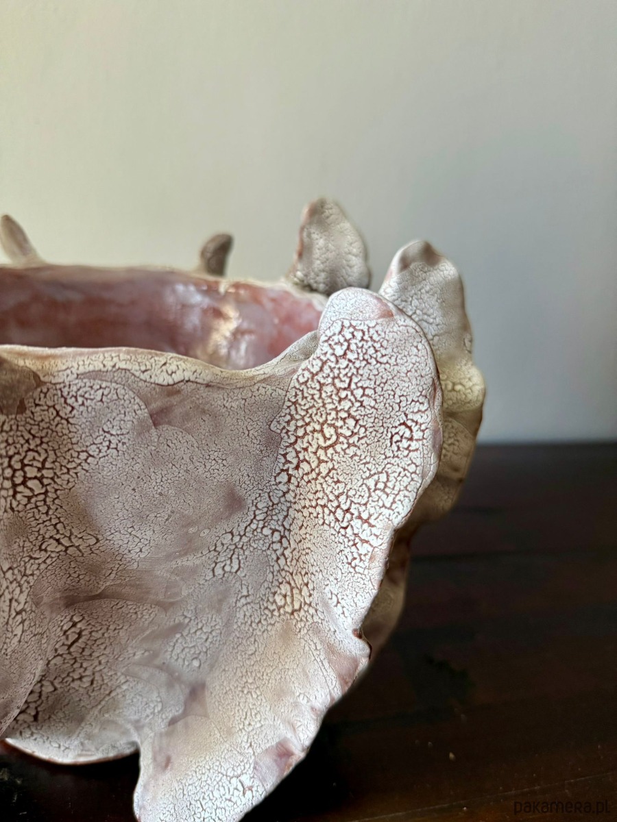 Ten wazon to element kolekcji Oceanic Crash, inspirowanej potęgą i delikatnością wodnego świata. Ręcznie wykonany z czerwonej gliny i pokryty efektowym białym szkliwem, zachwyca organiczną formą i strukturą przywodzącą na myśl rafy koralowe. Jego rzeźbiarska powierzchnia sprawia, że może pełnić zarówno funkcję dekoracyjnej rzeźby, jak i osłonki na doniczkę.