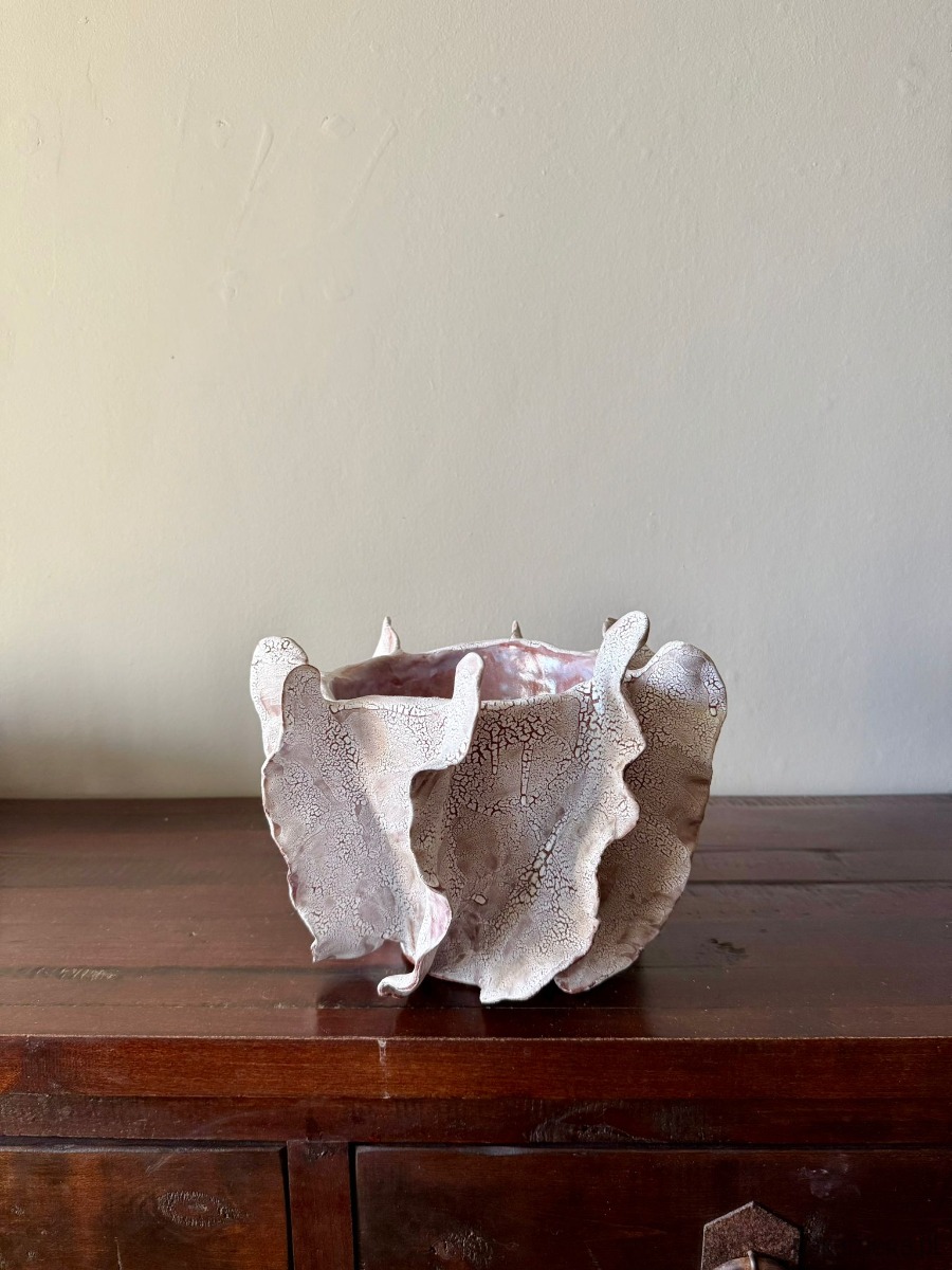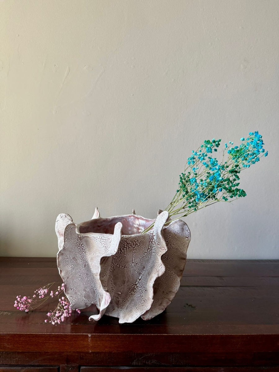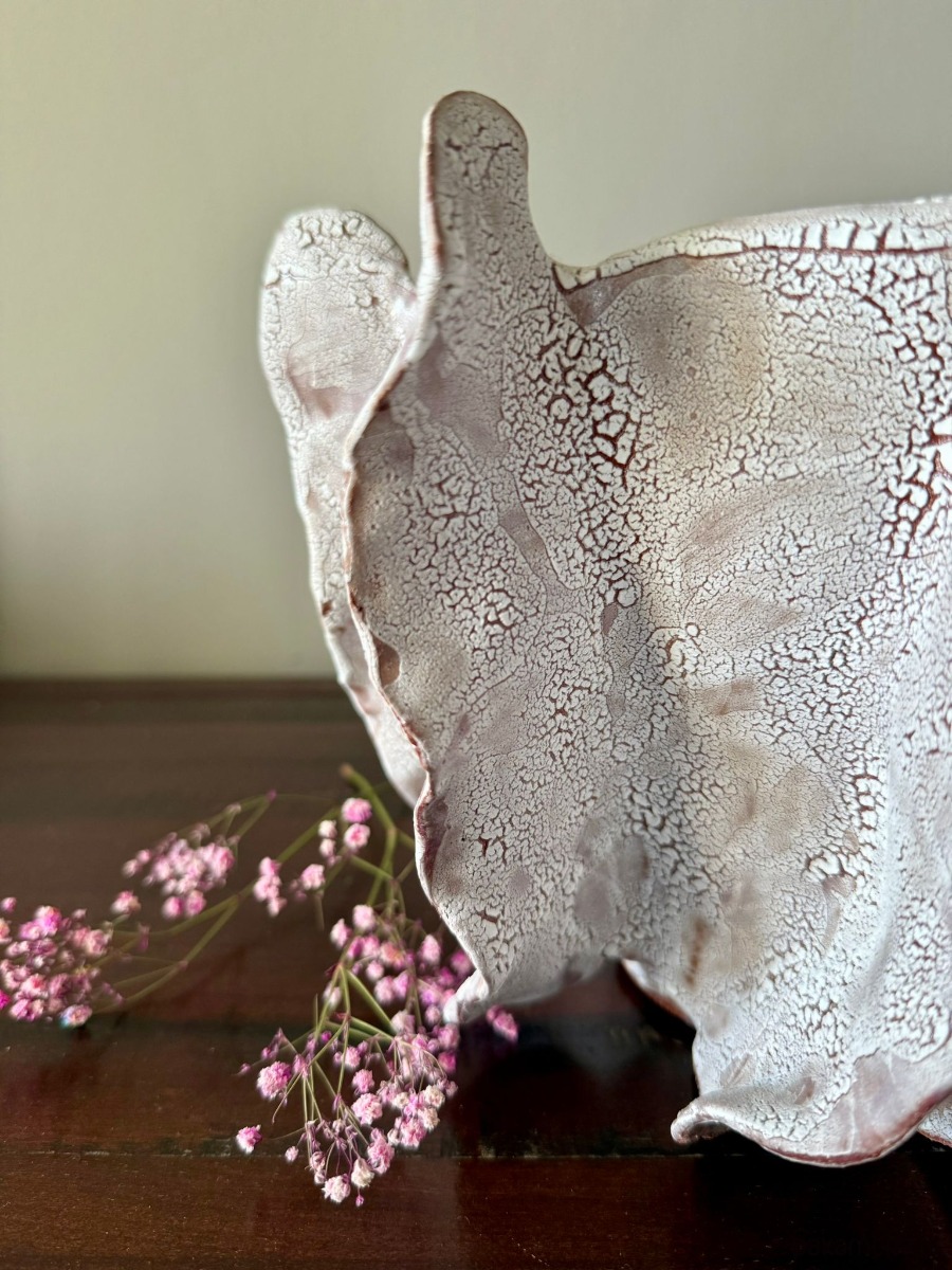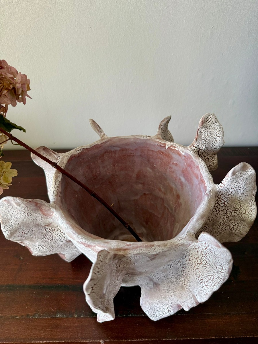 Ten wazon to element kolekcji Oceanic Crash, inspirowanej potęgą i delikatnością wodnego świata. Ręcznie wykonany z czerwonej gliny i pokryty efektowym białym szkliwem, zachwyca organiczną formą i strukturą przywodzącą na myśl rafy koralowe. Jego rzeźbiarska powierzchnia sprawia, że może pełnić zarówno funkcję dekoracyjnej rzeźby, jak i osłonki na doniczkę.