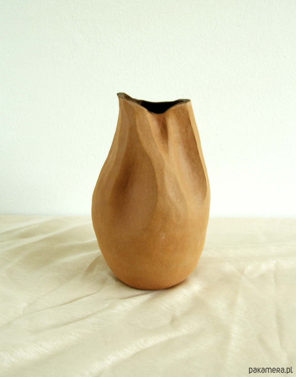 Unikatowy ceramiczny wazon o nieregularnej, organicznej formie, ręcznie formowany z gliny i inspirowany naturalnymi kształtami. Z zewnątrz pozostawiony nieszkliwiony, w ciepłym, brązowym odcieniu naturalnej gliny, który podkreśla surowość materiału i rzemieślniczy charakter obiektu. Wnętrze wazonu szkliwione brązowym szkliwem, zapewniającym funkcjonalność i subtelny kontrast faktur.