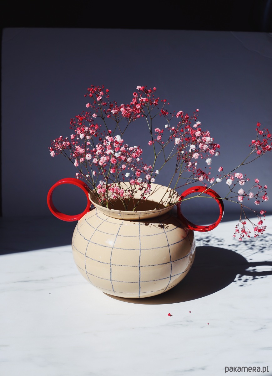 Ceramiczny wazon w granatową kratkę z dużymi wygodnymi uszami w kolorze czerwonym.Efektowny dodatek do wnętrza.