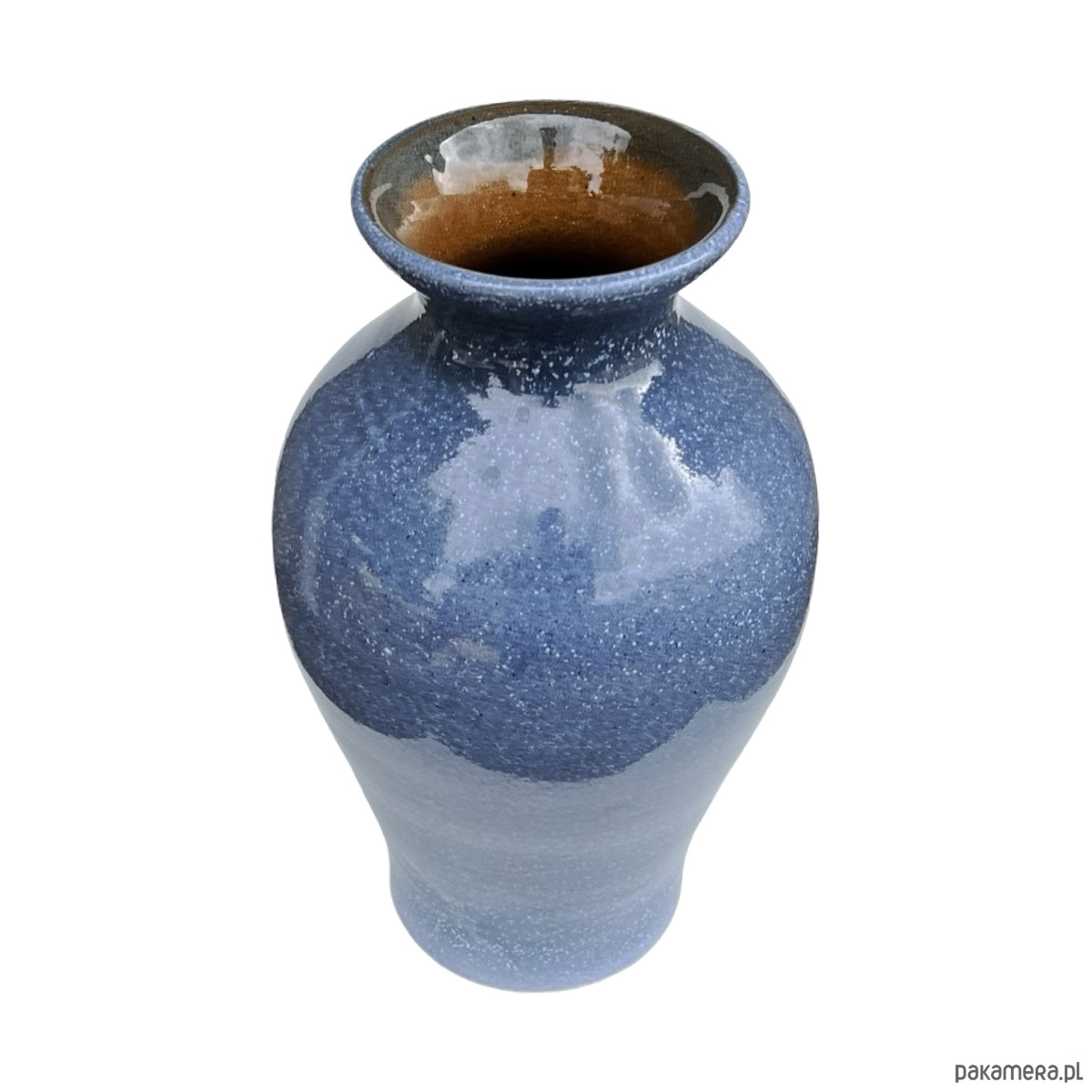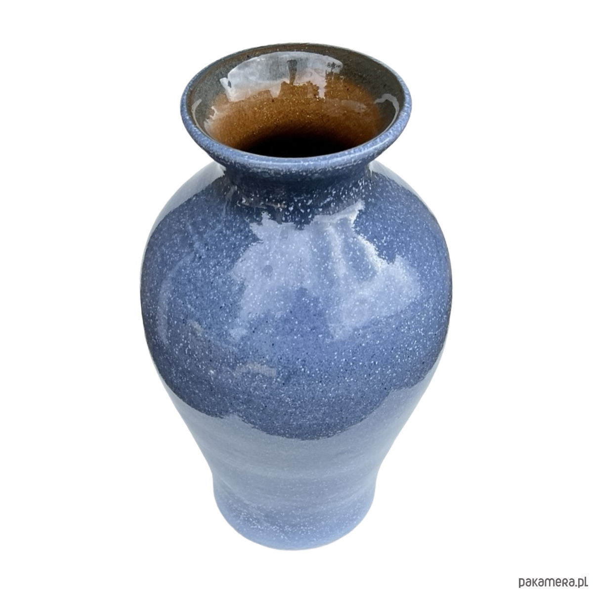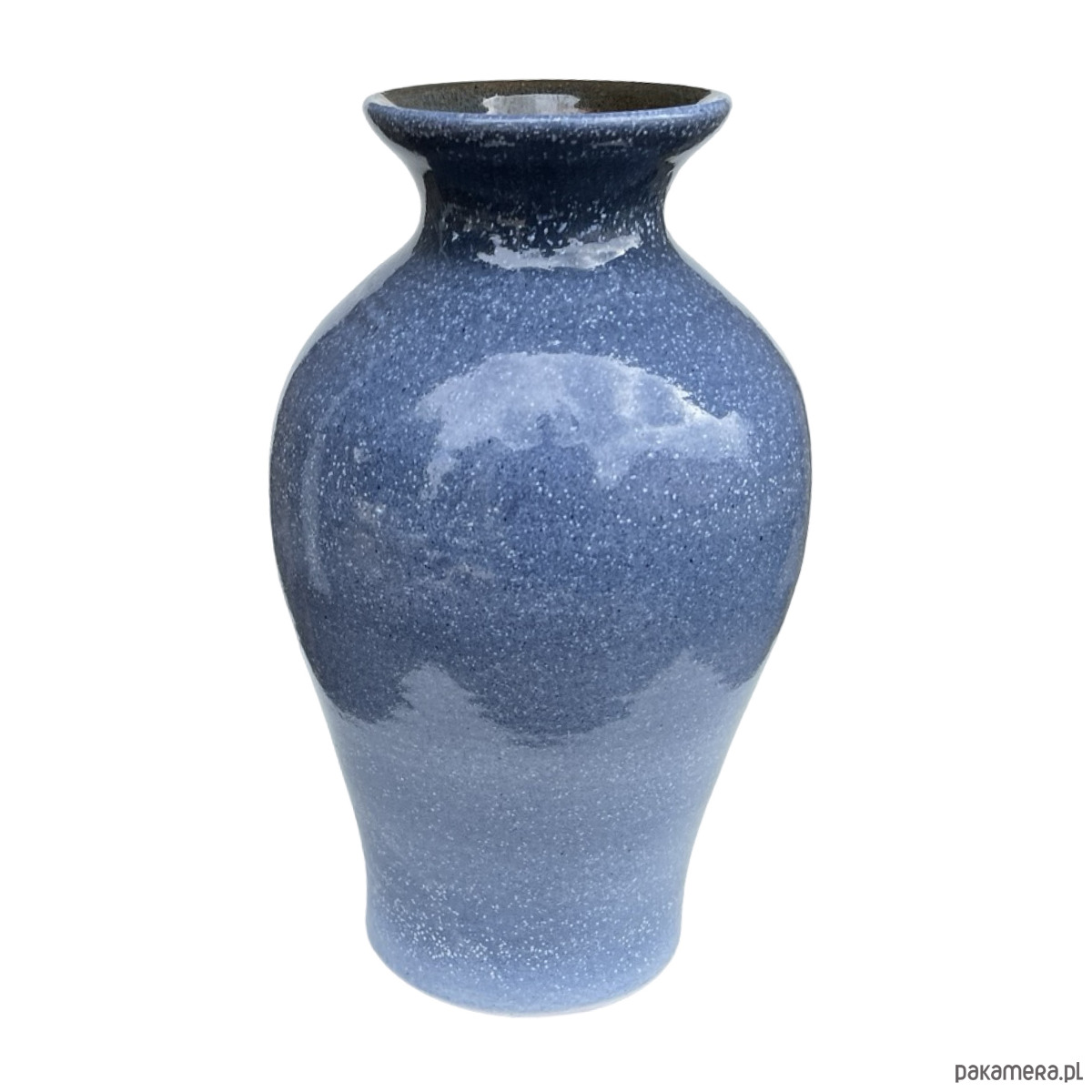 Elegancki, ceramiczny wazon vintage z lat 60/70. XX wieku, wykonany techniką szkliwa reaktywnego (reactive glaze) w unikatowym, intensywnym odcieniu granatowo-niebieskim z subtelnymi, białymi kropkami, przypominającymi efekt "śniegu" na powierzchni. Styl i technika wykończenia wskazują na możliwą produkcję w stylu West Germany albo nawiązanie do wzornictwa popularnego w Niemczech Zachodnich w okresie mid-century modern.
