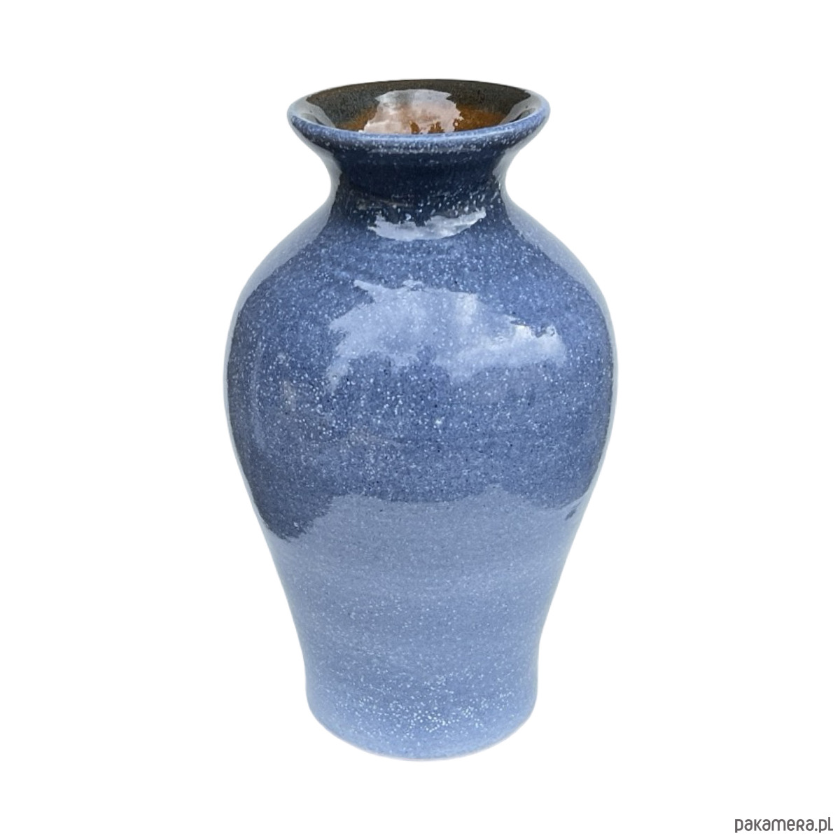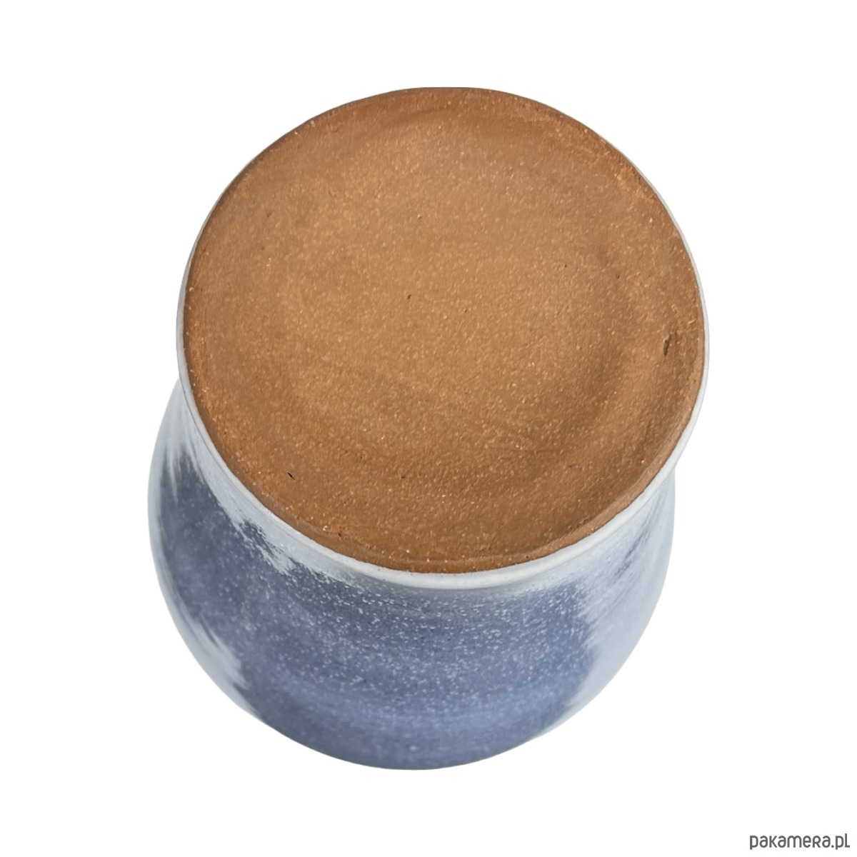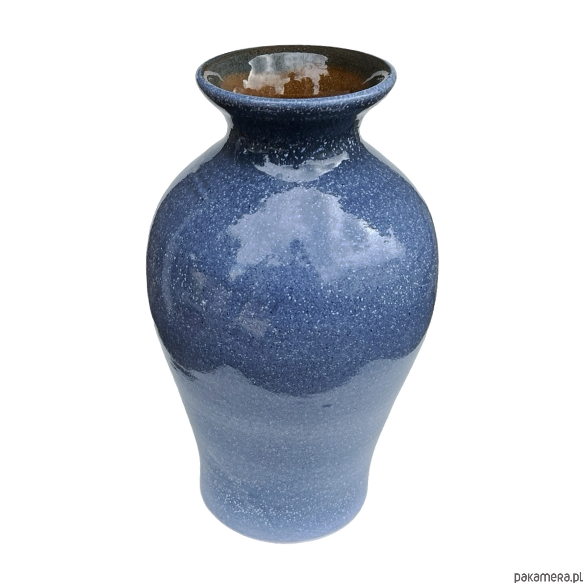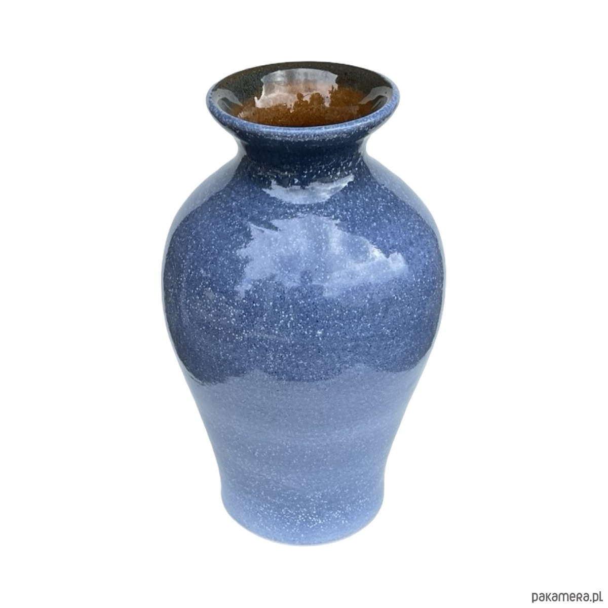 Elegancki, ceramiczny wazon vintage z lat 60/70. XX wieku, wykonany techniką szkliwa reaktywnego (reactive glaze) w unikatowym, intensywnym odcieniu granatowo-niebieskim z subtelnymi, białymi kropkami, przypominającymi efekt "śniegu" na powierzchni. Styl i technika wykończenia wskazują na możliwą produkcję w stylu West Germany albo nawiązanie do wzornictwa popularnego w Niemczech Zachodnich w okresie mid-century modern.