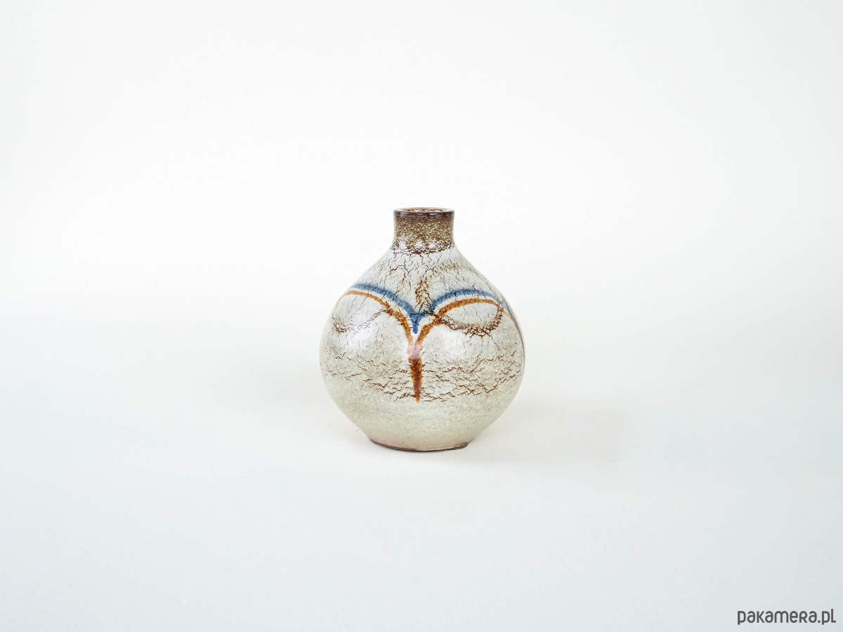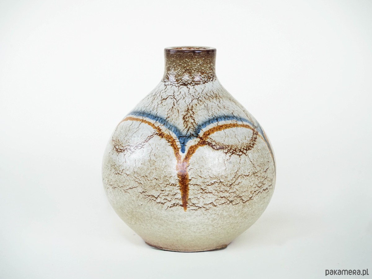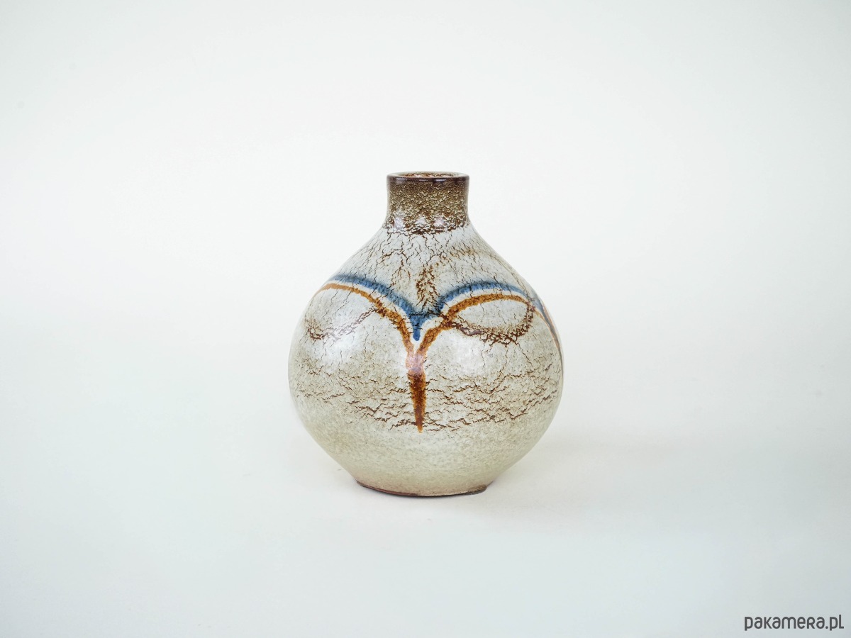 Wazon ceramiczny o kulistej formie z krótką, wąską szyjką. Utrzymany w odcieniach beżu i brązu, zdobiony dekoracyjnymi liniami w kolorze rdzawym i błękitnym, które biegną przez powierzchnię naczynia, tworząc abstrakcyjny, graficzny wzór. Powierzchnia pokryta jest jednolitym szkliwem, które podkreśla prostotę i elegancję formy. Wazon doskonale sprawdzi się zarówno jako naczynie użytkowe, jak i dekoracyjny akcent we wnętrzu w stylu vintage, rustykalnym czy nowoczesnym.