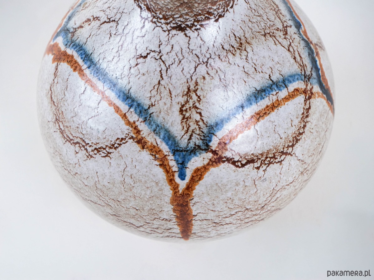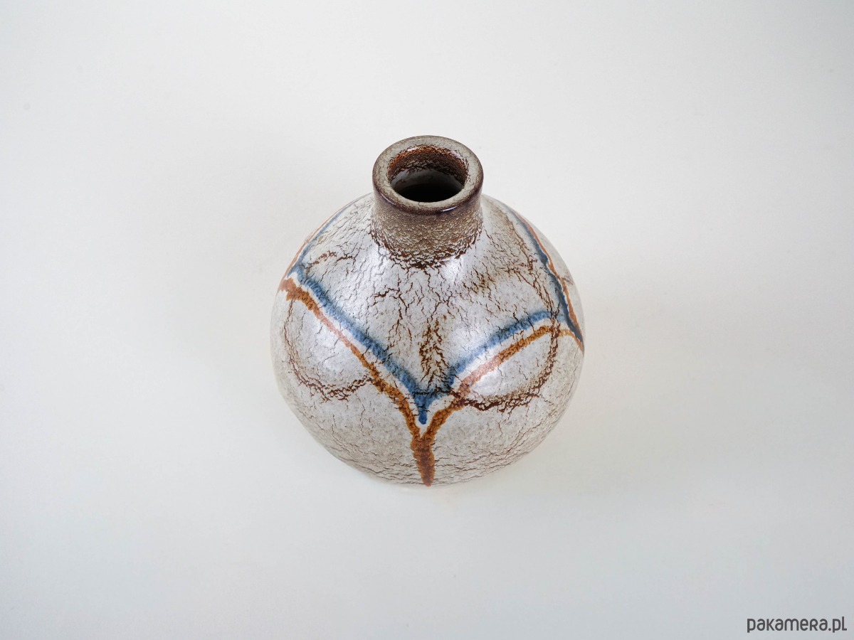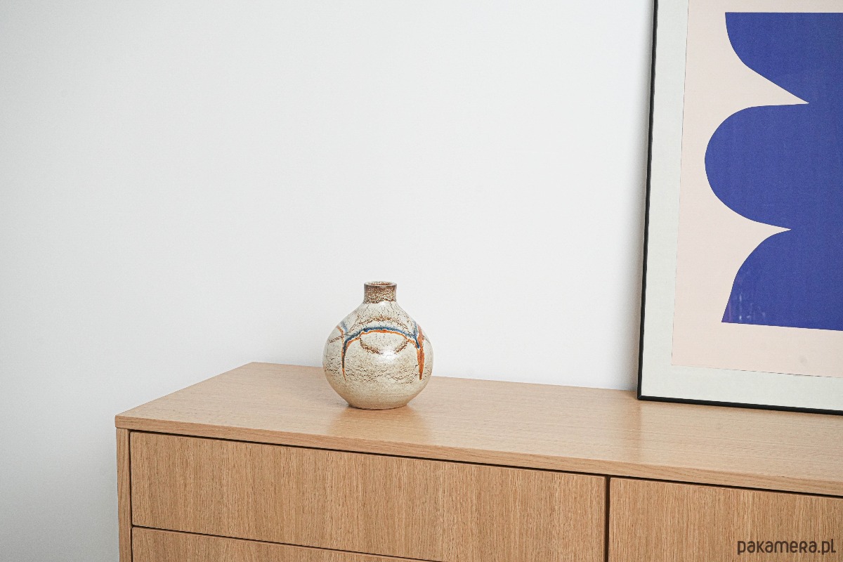 Wazon ceramiczny o kulistej formie z krótką, wąską szyjką. Utrzymany w odcieniach beżu i brązu, zdobiony dekoracyjnymi liniami w kolorze rdzawym i błękitnym, które biegną przez powierzchnię naczynia, tworząc abstrakcyjny, graficzny wzór. Powierzchnia pokryta jest jednolitym szkliwem, które podkreśla prostotę i elegancję formy. Wazon doskonale sprawdzi się zarówno jako naczynie użytkowe, jak i dekoracyjny akcent we wnętrzu w stylu vintage, rustykalnym czy nowoczesnym.
