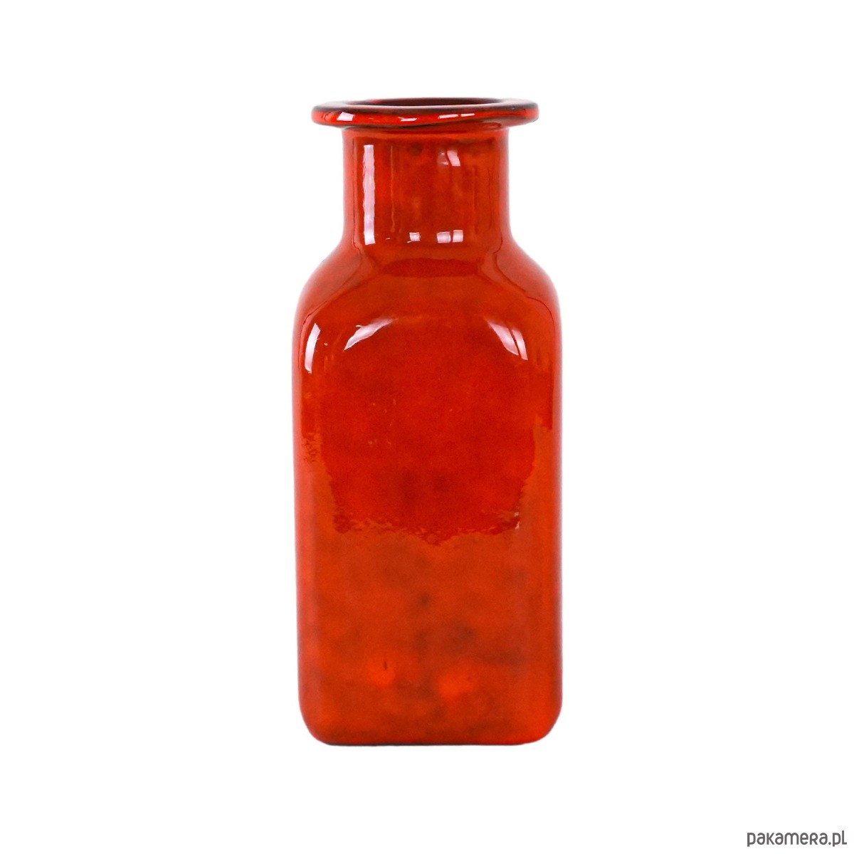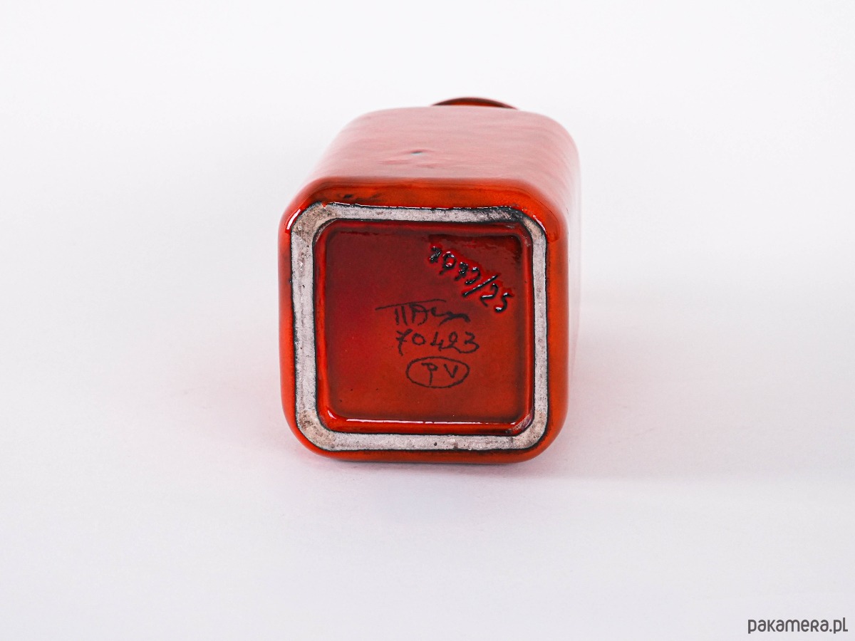 Wazon ceramiczny vintage w odcieniu czerwonym, z delikatną fakturą i geometrycznym kształtem. Stylowy dodatek do wnętrz retro lub boho.