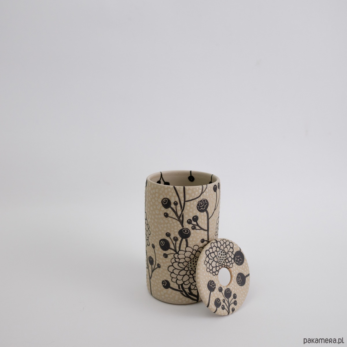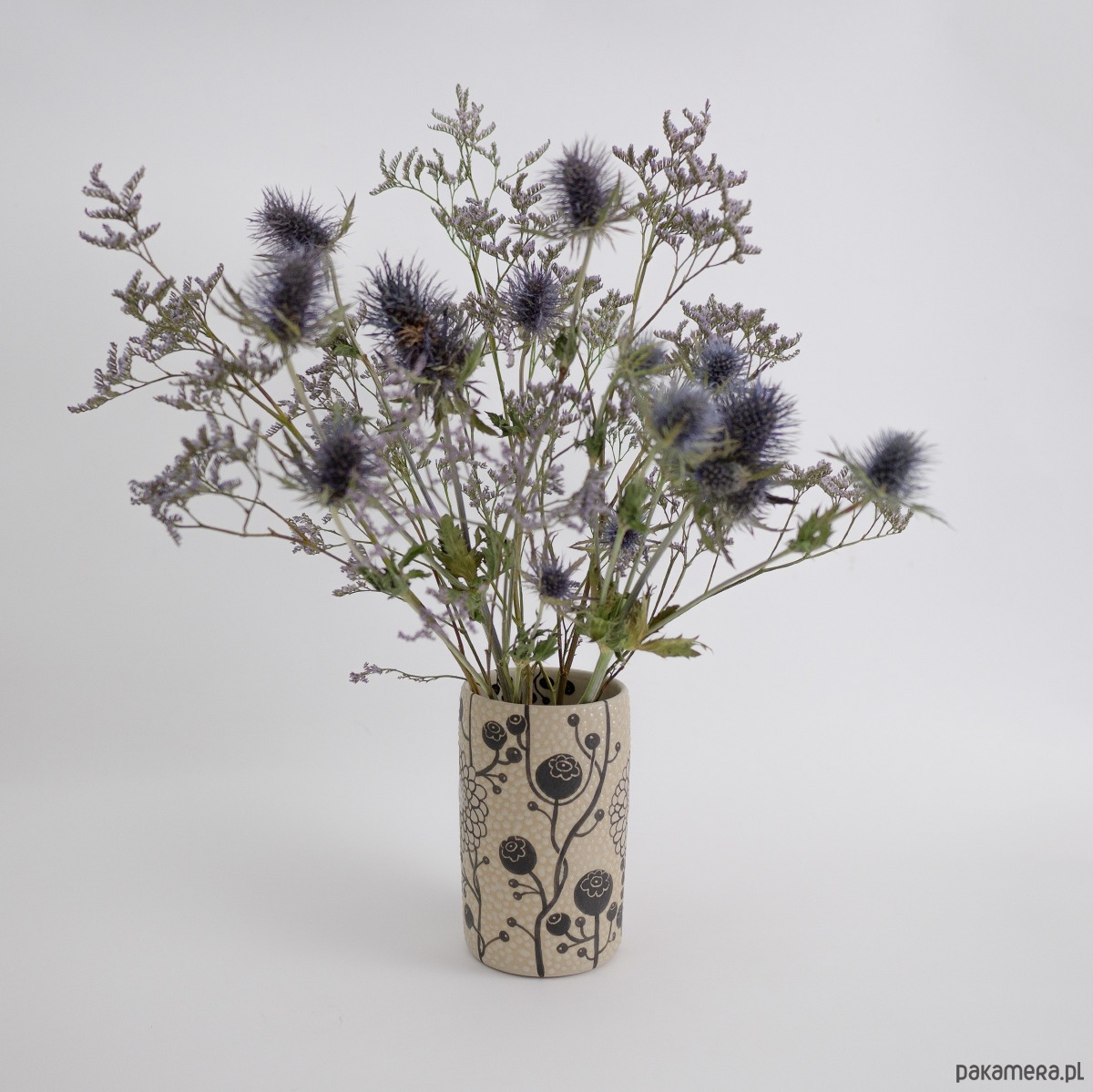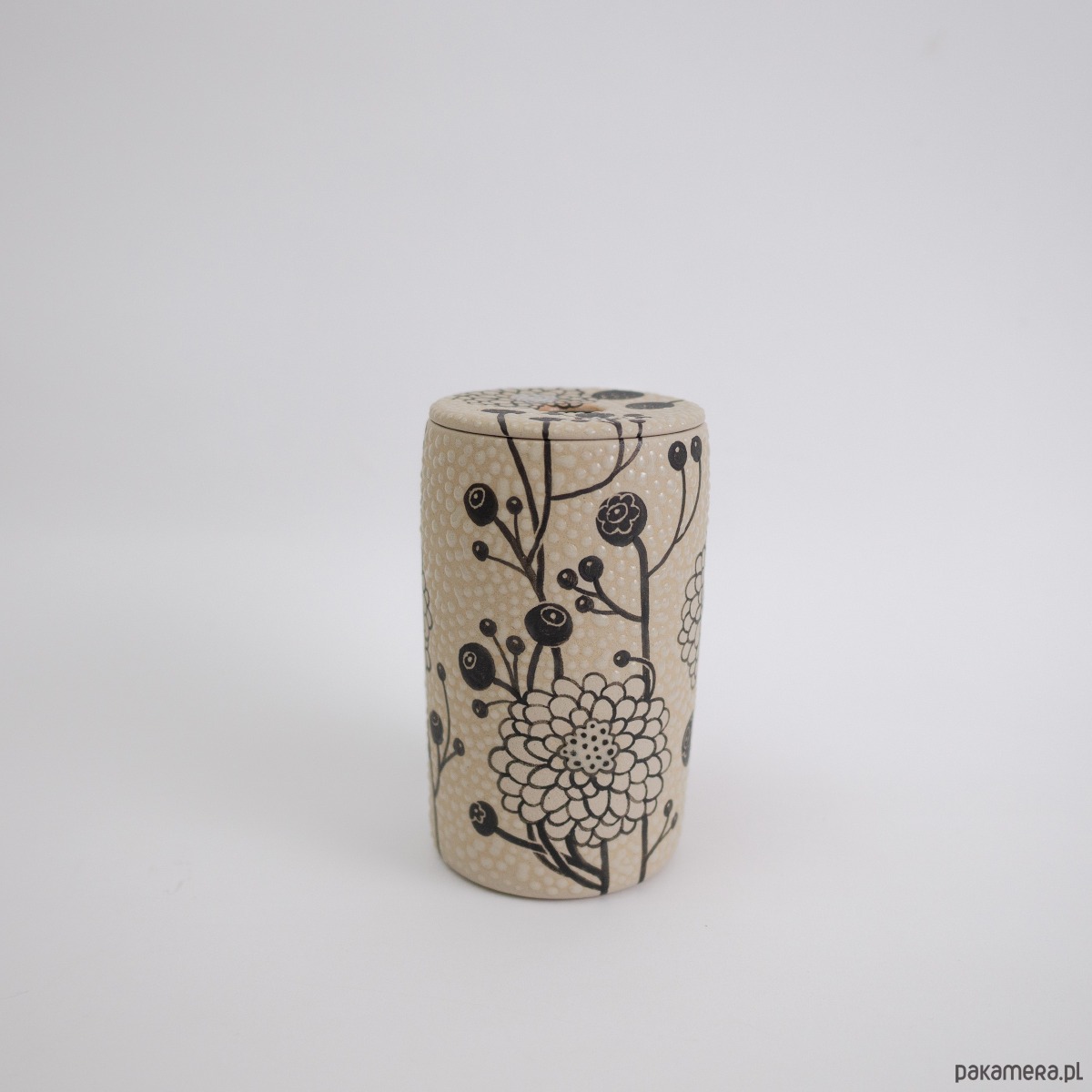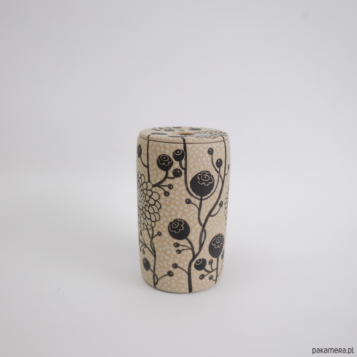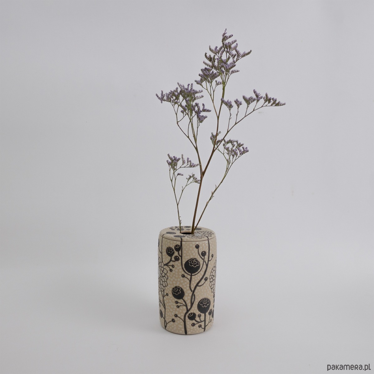 Kolory: naturalnie beżowy kolor gliny + malowany czarny wzór + transparent (szkliwo błyszczące). Wazon szkliwiony na zewnątrz i wewnątrz.