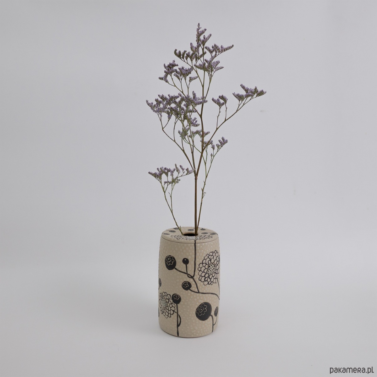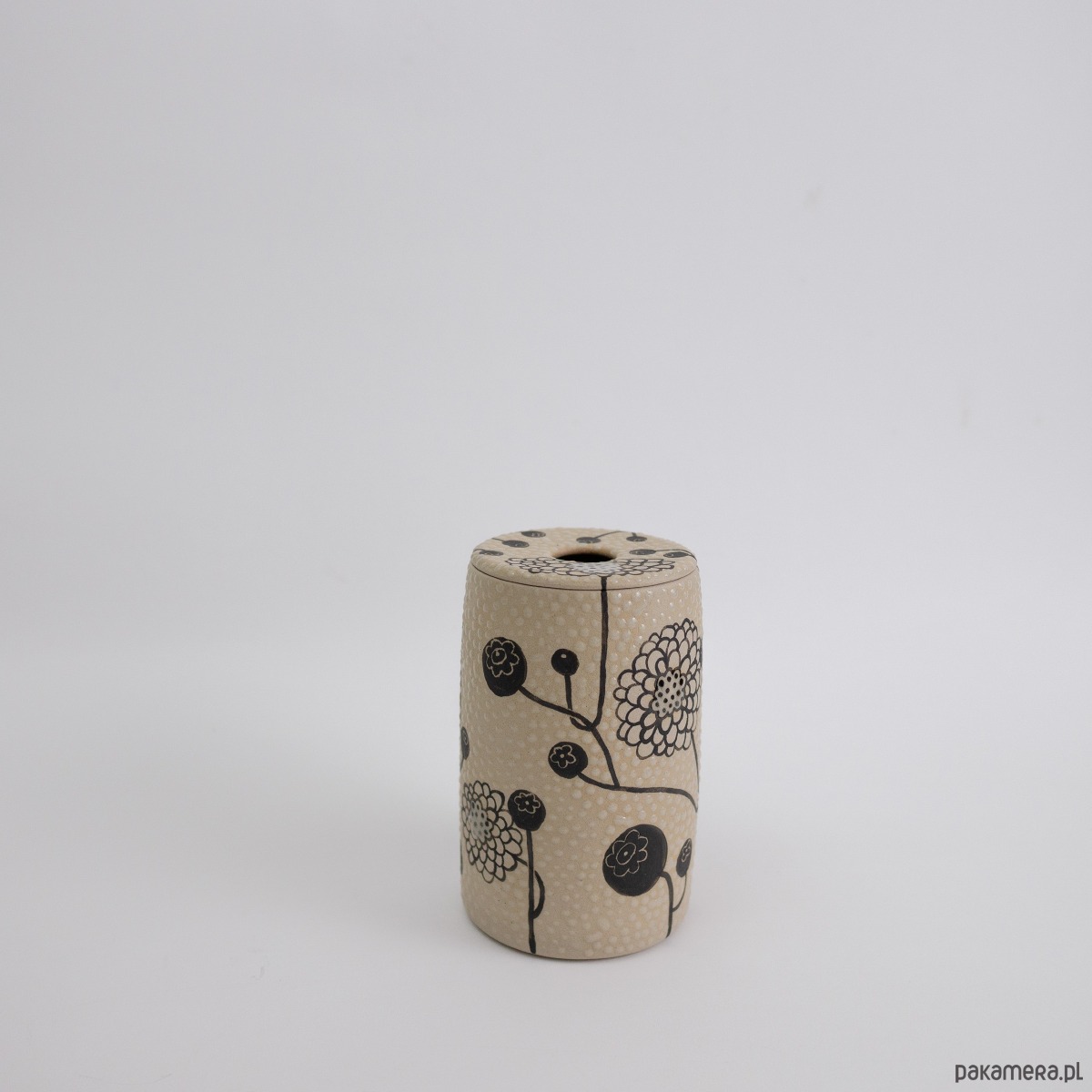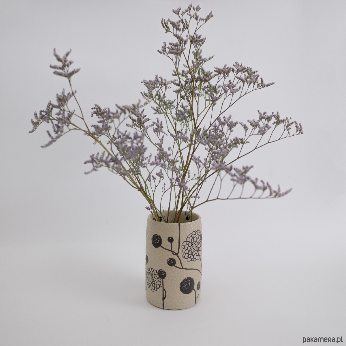 Kolory: naturalnie beżowy kolor gliny + malowany czarny wzór + transparent (szkliwo błyszczące). Wazon szkliwiony na zewnątrz i wewnątrz.