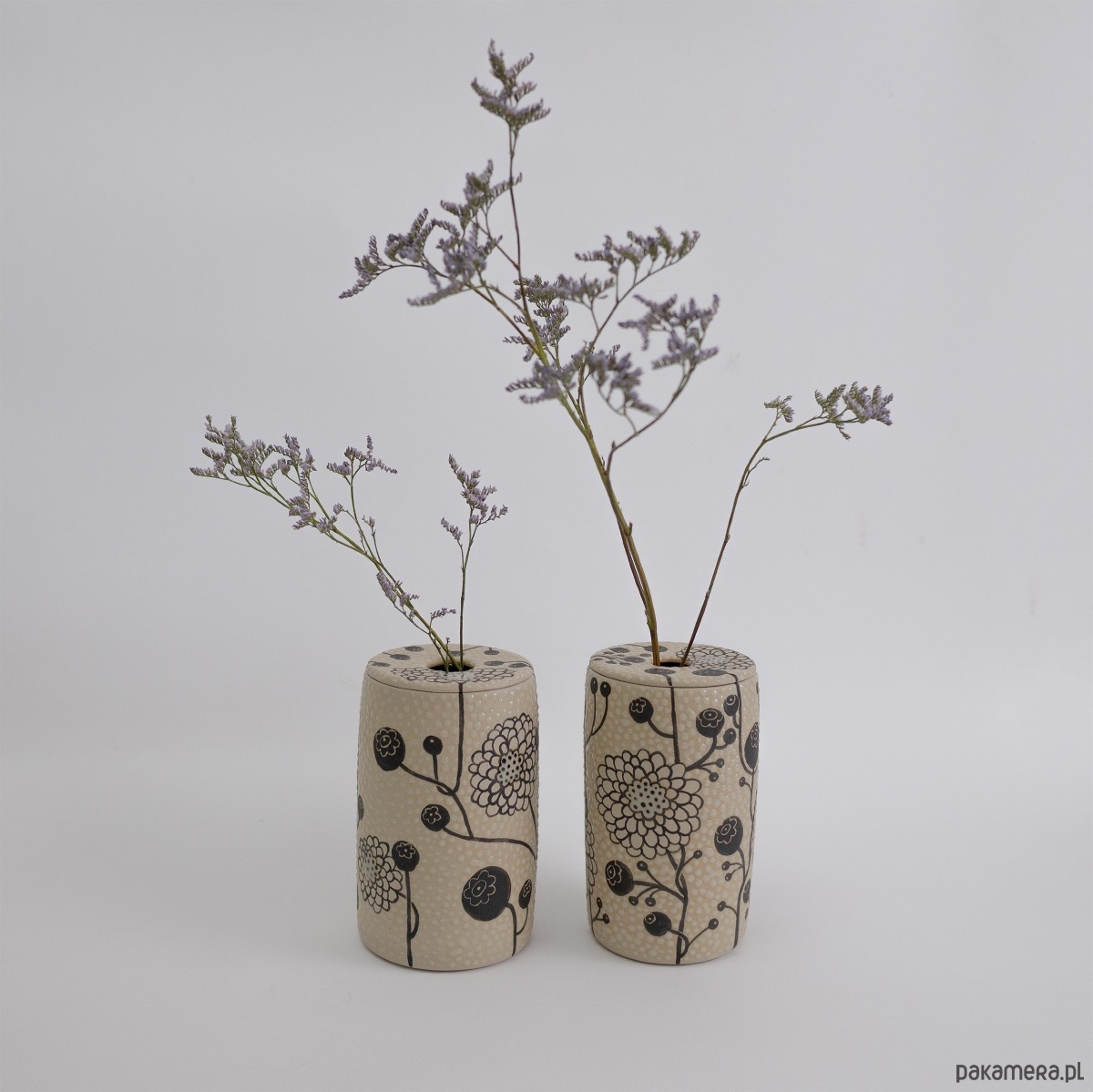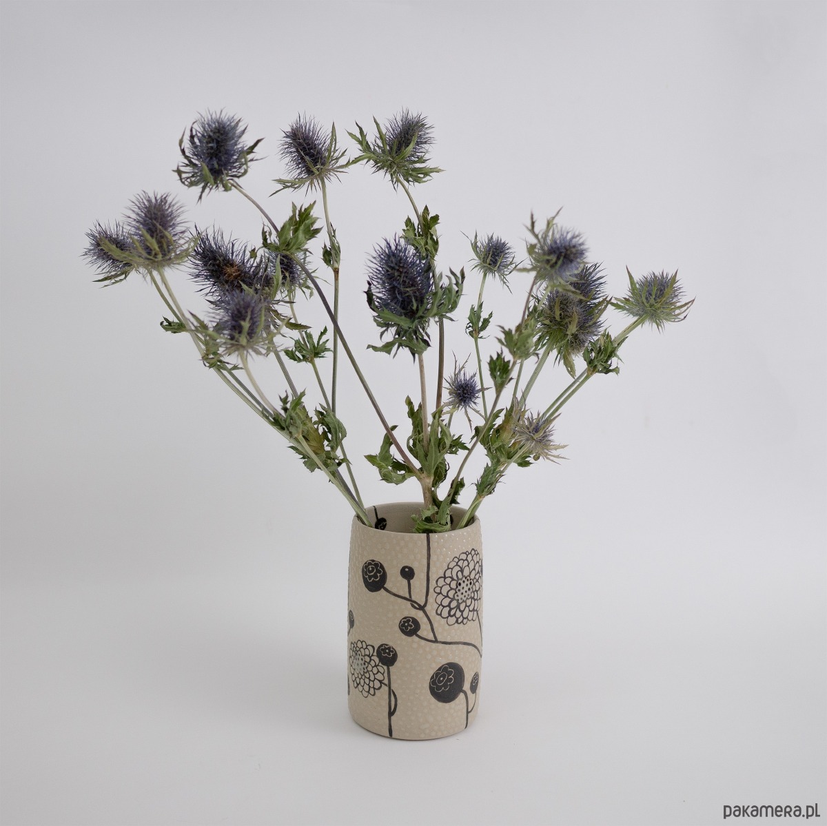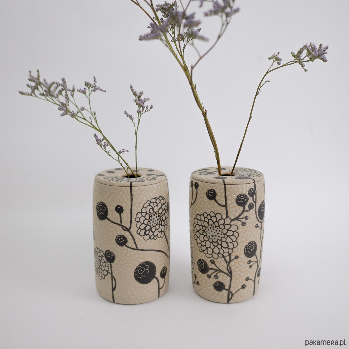 Kolory: naturalnie beżowy kolor gliny + malowany czarny wzór + transparent (szkliwo błyszczące). Wazon szkliwiony na zewnątrz i wewnątrz.