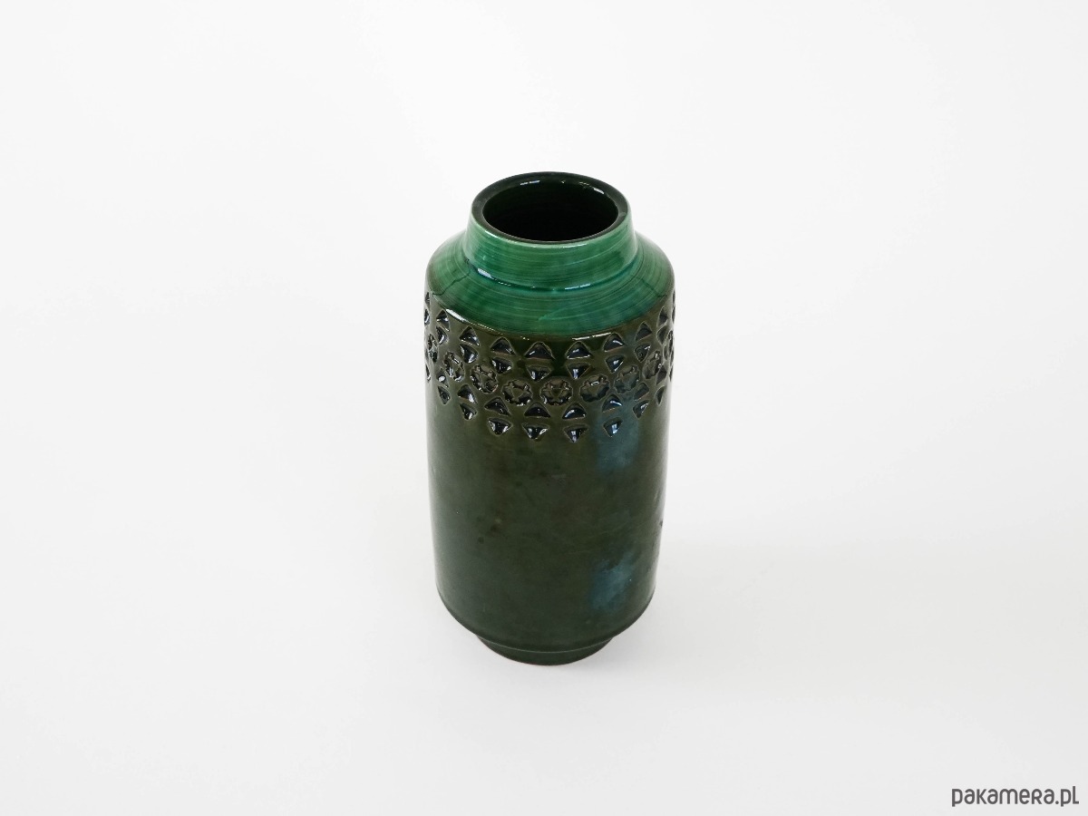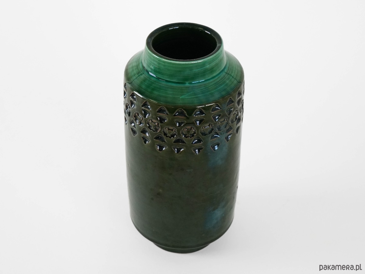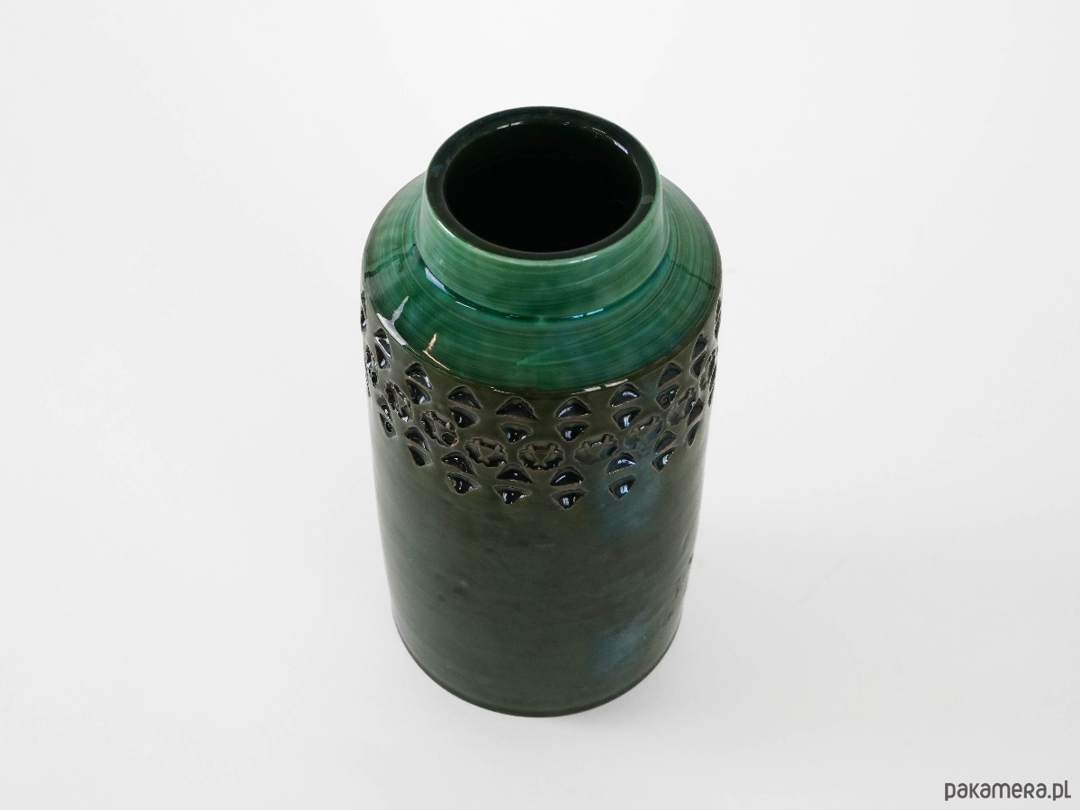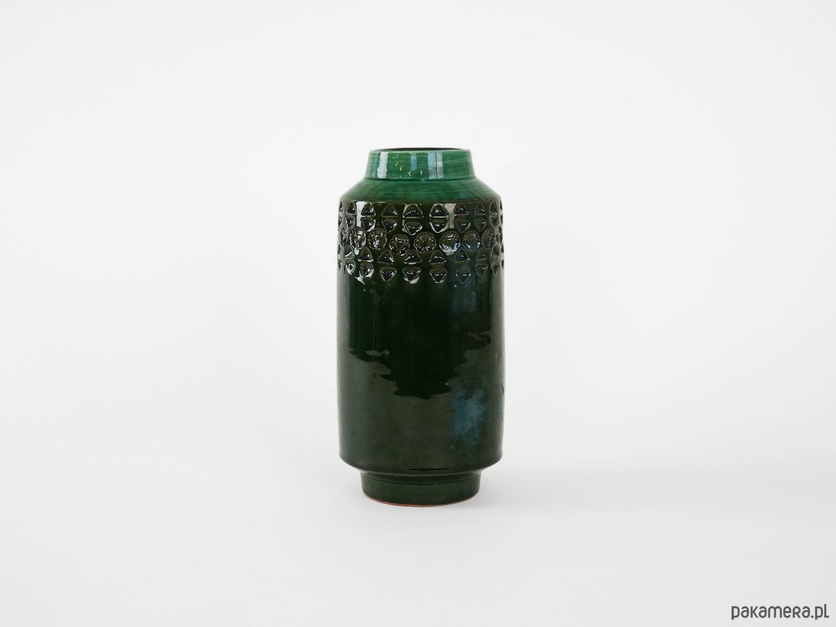 Pokryty głęboką, zieloną glazurą, z dekoracyjnym pasem geometrycznych tłoczeń w górnej partii. Prosta cylindryczna forma w połączeniu z bogatą fakturą i szkliwem nadaje mu elegancki, ponadczasowy charakter. Idealny jako element dekoracyjny lub naczynie na kwiaty.