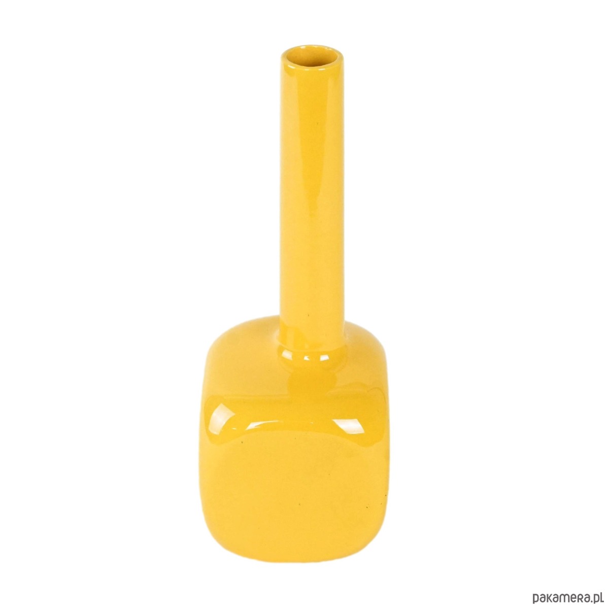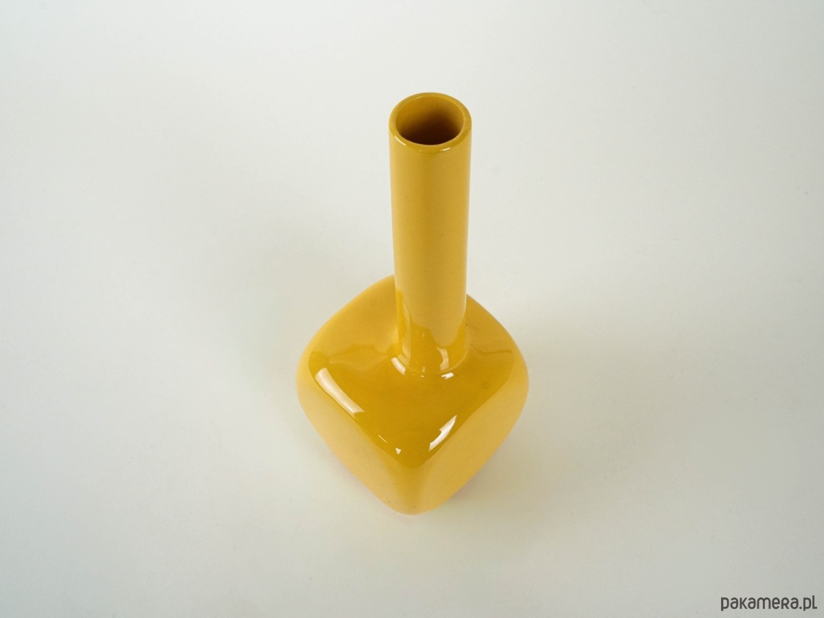 Wazon ceramiczny o geometrycznej, modernistycznej formie, szkliwiony w intensywnym, nasyconym żółtym kolorze. Smukła, cylindryczna szyjka kontrastuje z masywnym, miękko zaokrąglonym korpusem o kwadratowej podstawie. Minimalistyczny design i odważna barwa przywodzą na myśl wzornictwo lat 60.–70. XX wieku, charakterystyczne dla nurtu skandynawskiego modernizmu.