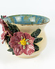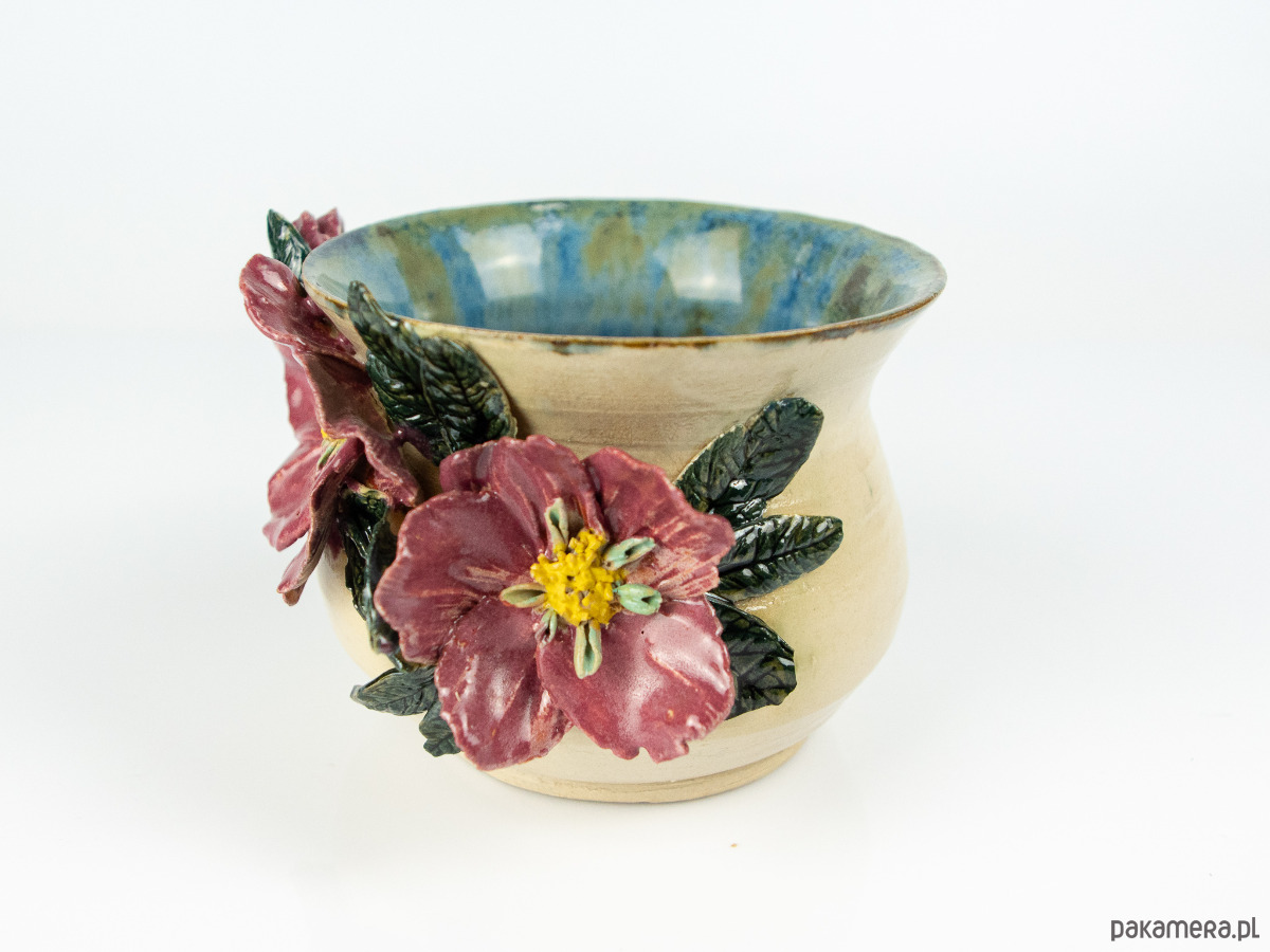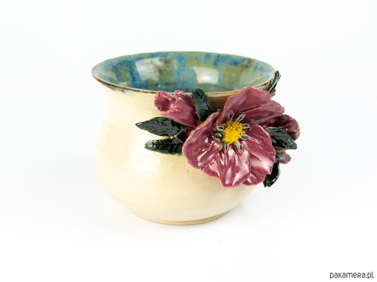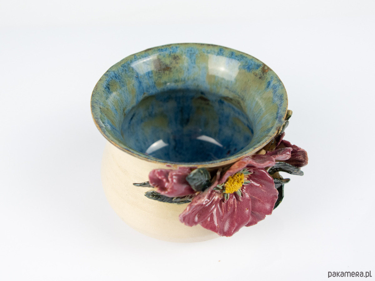 Wazonik „Ciemierniki” został wykonany ręcznie: jego bazę uformowano na kole garncarskim, a następnie ozdobiono ją kwiatami ciemierników z efektownymi listkami. Wnętrze wazonika pokryte jest charakterystycznym szkliwem w odcieniach głębokiego błękitu i zieleni, pięknie kontrastującym z naturalnym, kremowym kolorem gliny oraz zgaszonym bordo płatków i żółtymi środkami dekoracji. Zewnętrzna powierzchnia zabezpieczona przezroczystym szkliwem podkreśla naturalność i strukturę przedmiotu. Wazonik jest niepowtarzalny, inspirowany naturą, znakomicie sprawdzi się zarówno jako dekoracja stołu, jak i wyjątkowy prezent