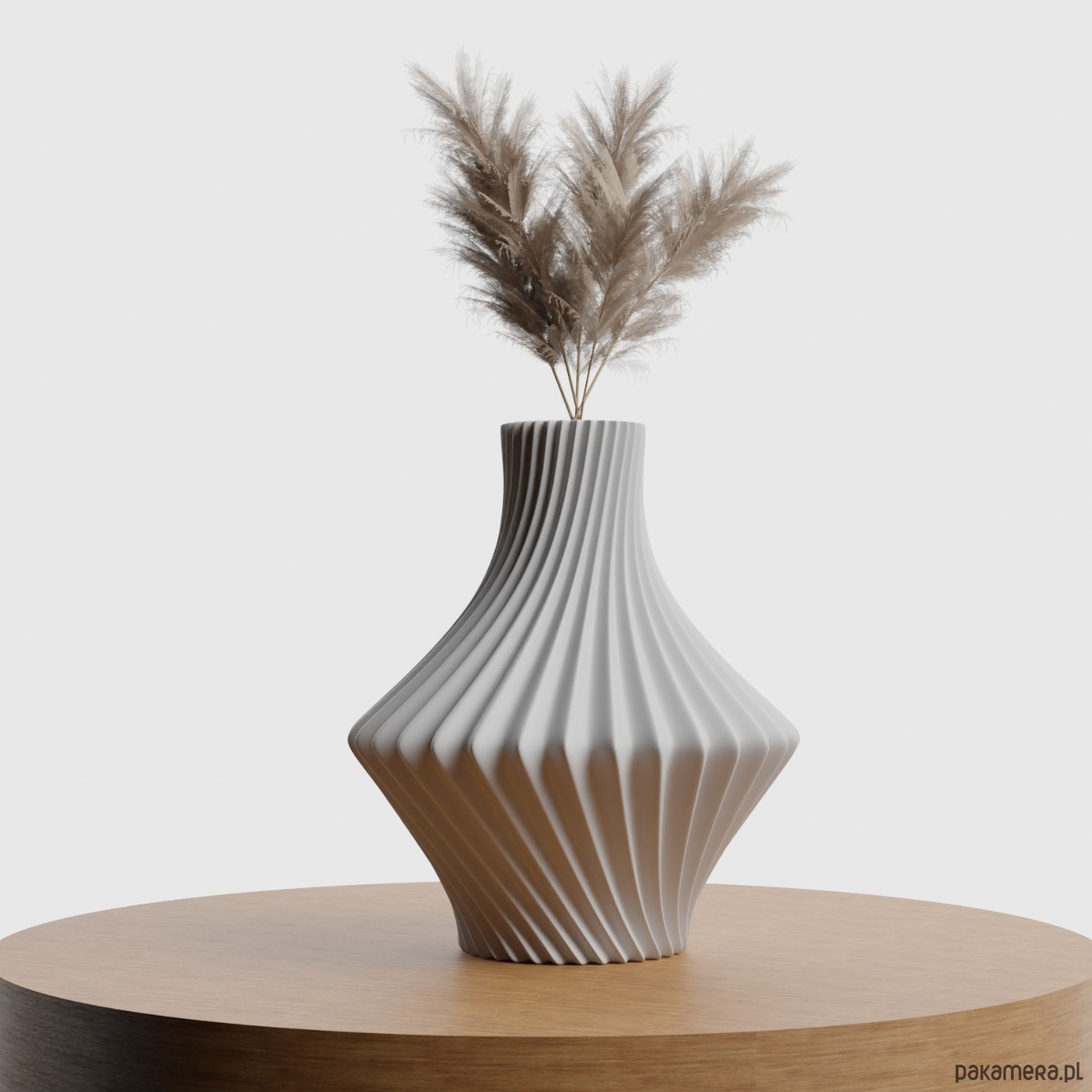 Wazon Turbine – elegancki wazon o klasycznej formie, wzbogacony subtelnym, spiralnym skrętem, który dodaje mu dynamiki i nowoczesnego charakteru. Wykonany z trwałego PET-G, łączy tradycyjny kształt z designerskim akcentem, tworząc efektowną ozdobę wnętrza. Idealny do świeżych i suszonych kwiatów, harmonijnie komponuje się ze stylem nowoczesnym, skandynawskim i klasycznym.