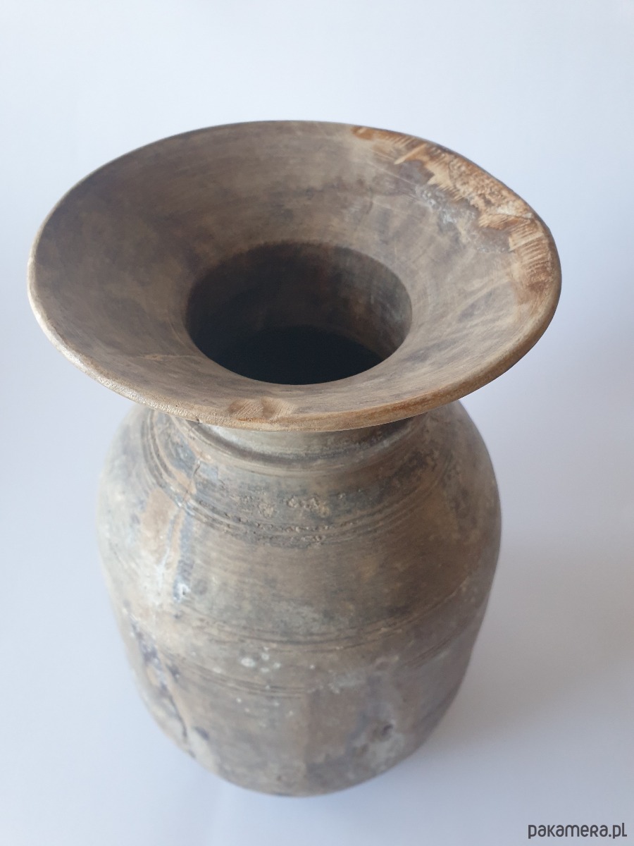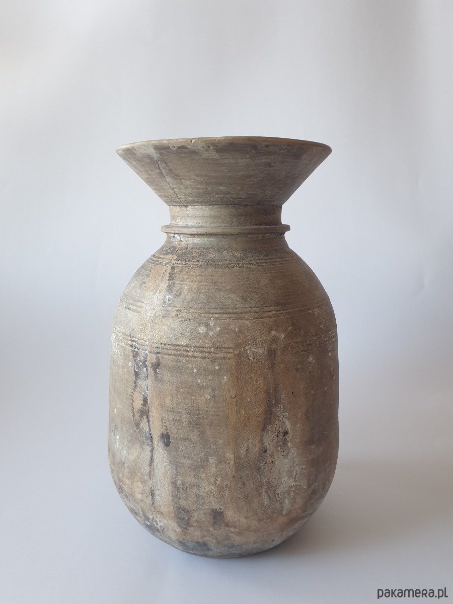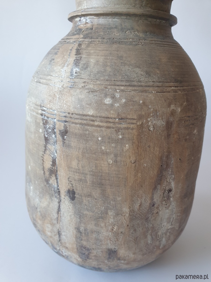 Tradycyjny, ręcznie rzeźbiony, drewniany okrągły wazon vintage. Te oryginalne wazony pochodzą z zachodniego Nepalu, regionu Terai, były dawniej używane przez lokalną ludność do przechowywania żywności, ghee i mleka. Niektóre z tych garnków były naprawiane przez lata i każdy jest pokryty patyną czasu, a wszelkie niedoskonałości nie są wadą, lecz zaletą. Każda rysa, zadrapanie, uszczerbek opowiada swoją własna historię przekazywaną z pokolenia na pokolenie.