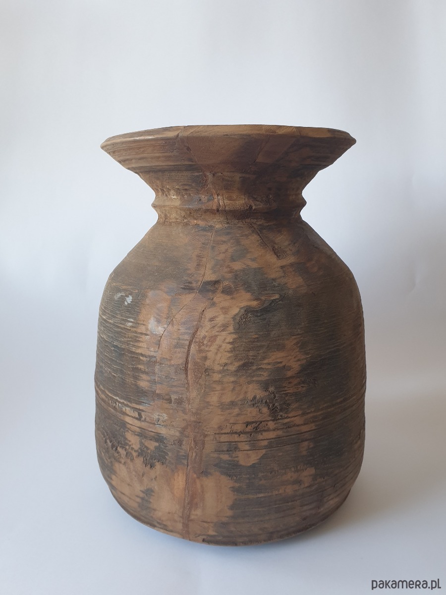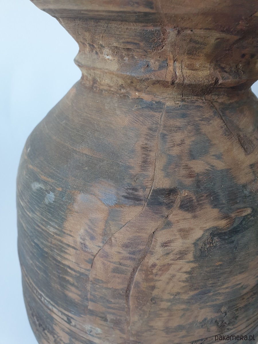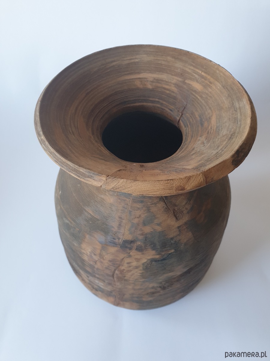 Tradycyjny, ręcznie rzeźbiony, drewniany wazon vintage. Te oryginalne wazony pochodzą z zachodniego Nepalu, regionu Terai, były dawniej używane przez lokalną ludność do przechowywania żywności, ghee i mleka. Niektóre z tych garnków były naprawiane przez lata i każdy jest pokryty patyną czasu, opowiada swoją własna historię przekazywaną z pokolenia na pokolenie.