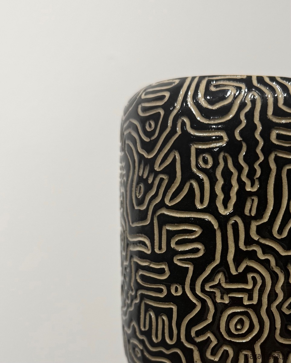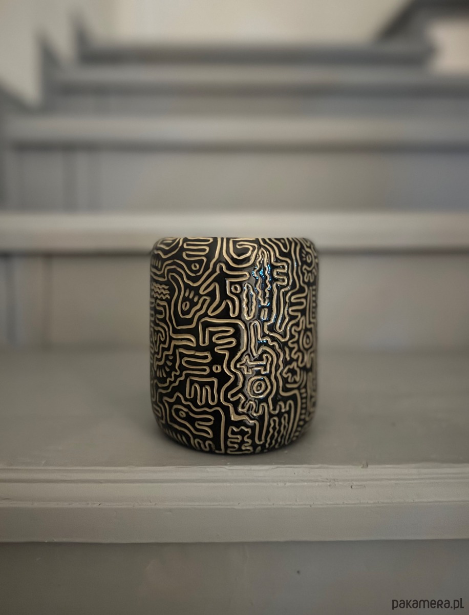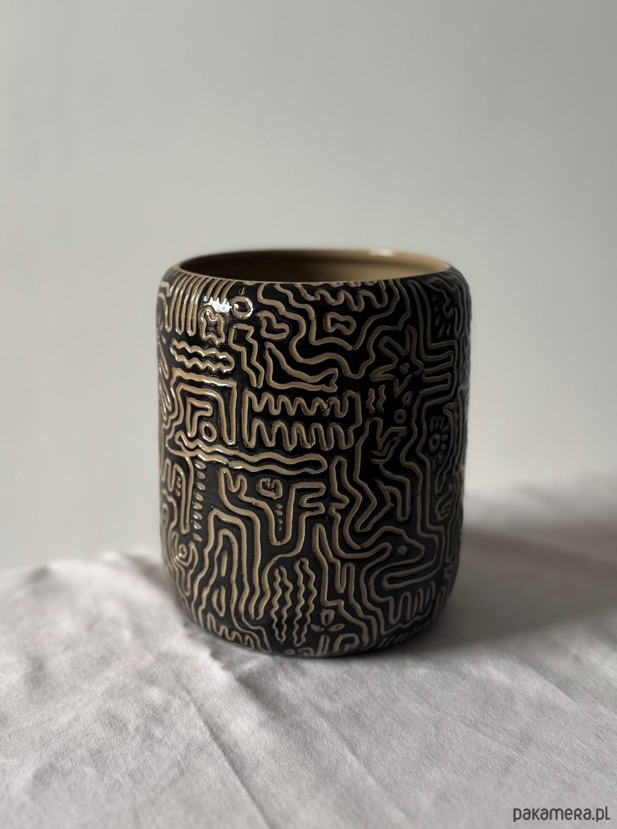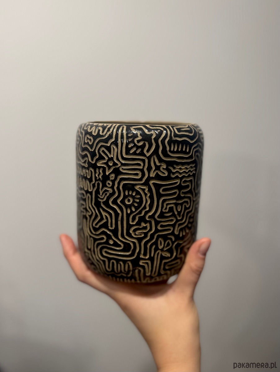 Każdy egzemplarz jest unikatowy — wzory tworzone techniką scraffito powstają intuicyjnie, z linii i kształtów, które mogą przypominać ludzi, zwierzęta lub całkiem abstrakcyjne formy. To dekoracja, która przyciąga wzrok i prowokuje do rozmowy.