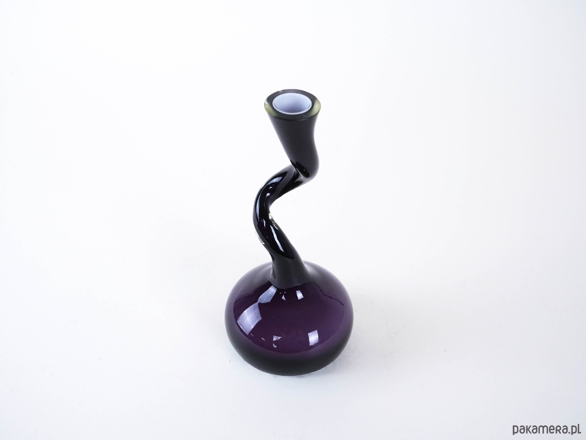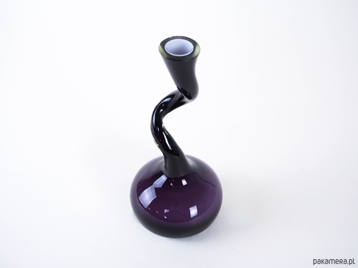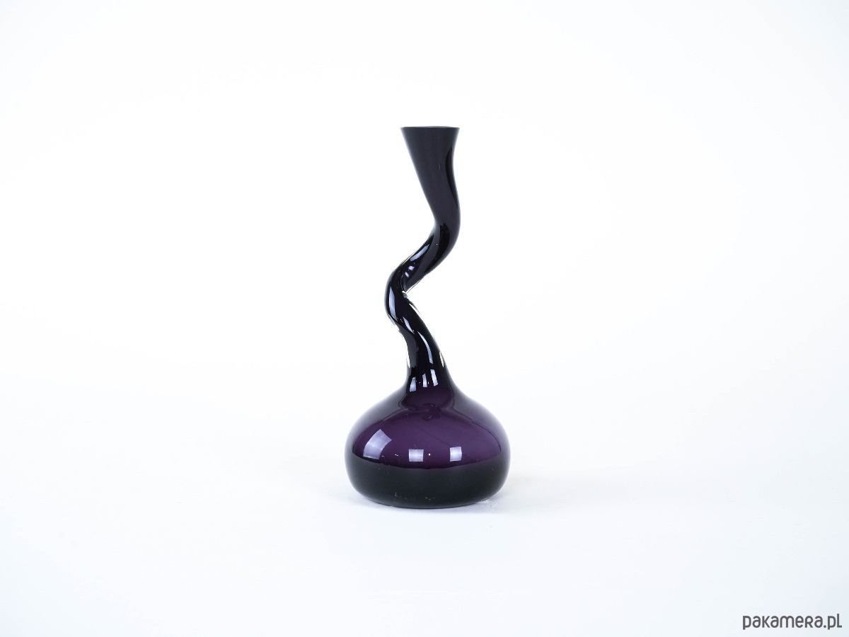 Wazon szklany w głębokim odcieniu fioletu, vintage w stylu Swing Vase. Projekt z lat 90. XX wieku, charakterystyczny dla estetyki mid-century modern, wyróżnia się dynamiczną linią i intensywną barwą. Doskonały do nowoczesnych i retro wnętrz jako wyrazisty element dekoracyjny.